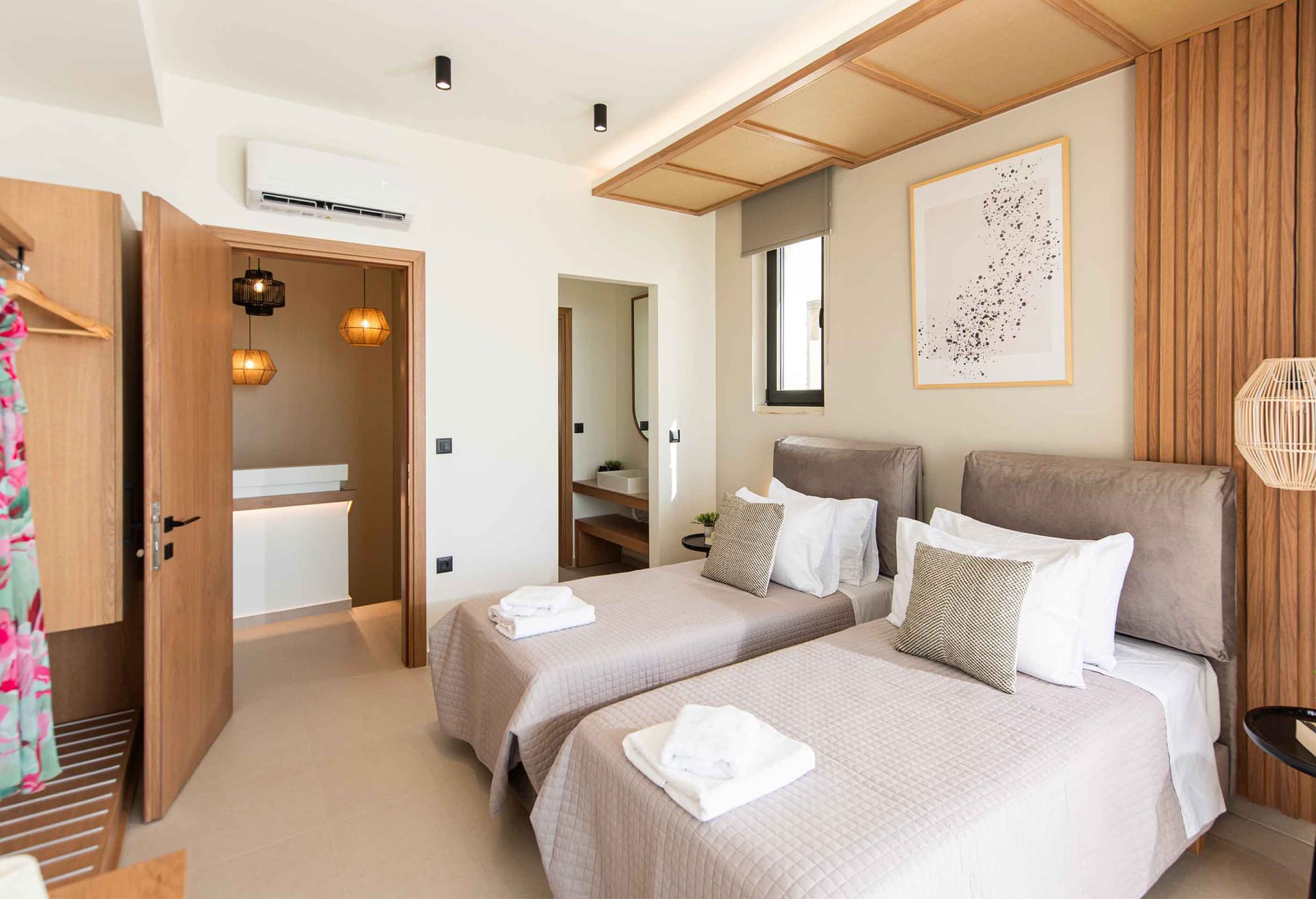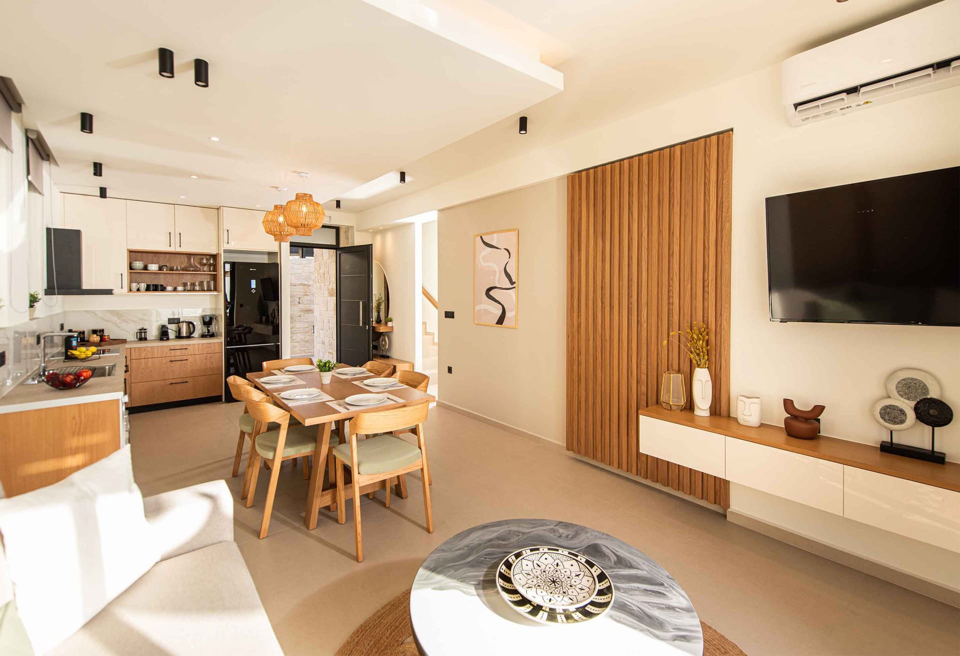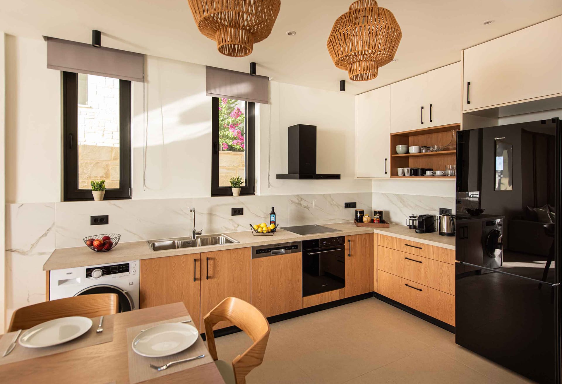 Villa Verano 2 is a two-storey villa consisting of 3 bedrooms, one on the ground floor and the rest of them on the upper floor. All the bedrooms are fully equipped. Two of the bedrooms have ensuite bathrooms. Entering the villa on the ground floor you will find a spacious open area with a fantastically-equipped kitchen for foodies. The area is completed with a dining and a living room with a big flat-screen Smart Satellite TV where you can grab a coffee and get yourself a freshly brewed coffee and pad across the area to the outdoor space. Wherever you find yourself in this house there is something beautiful to admire. The neutral palette that is used here creates the perfect scenery for a serene getaway from the fast pace of life making your stay unforgettable. Uninterrupted rest is promised while you can enjoy a luxurious stay away from the fast pace of everyday life.