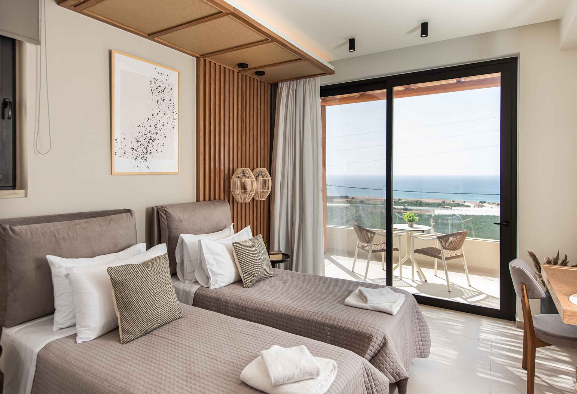 Bedroom 3: Twin-size beds (0.90*2.00) that can be converted into a double one, A/C, ensuite bathroom with shower, sea view from the balcony