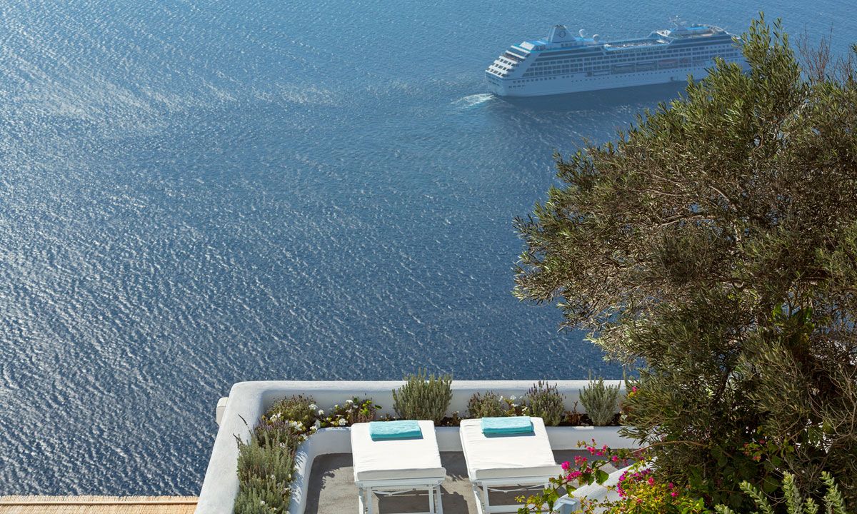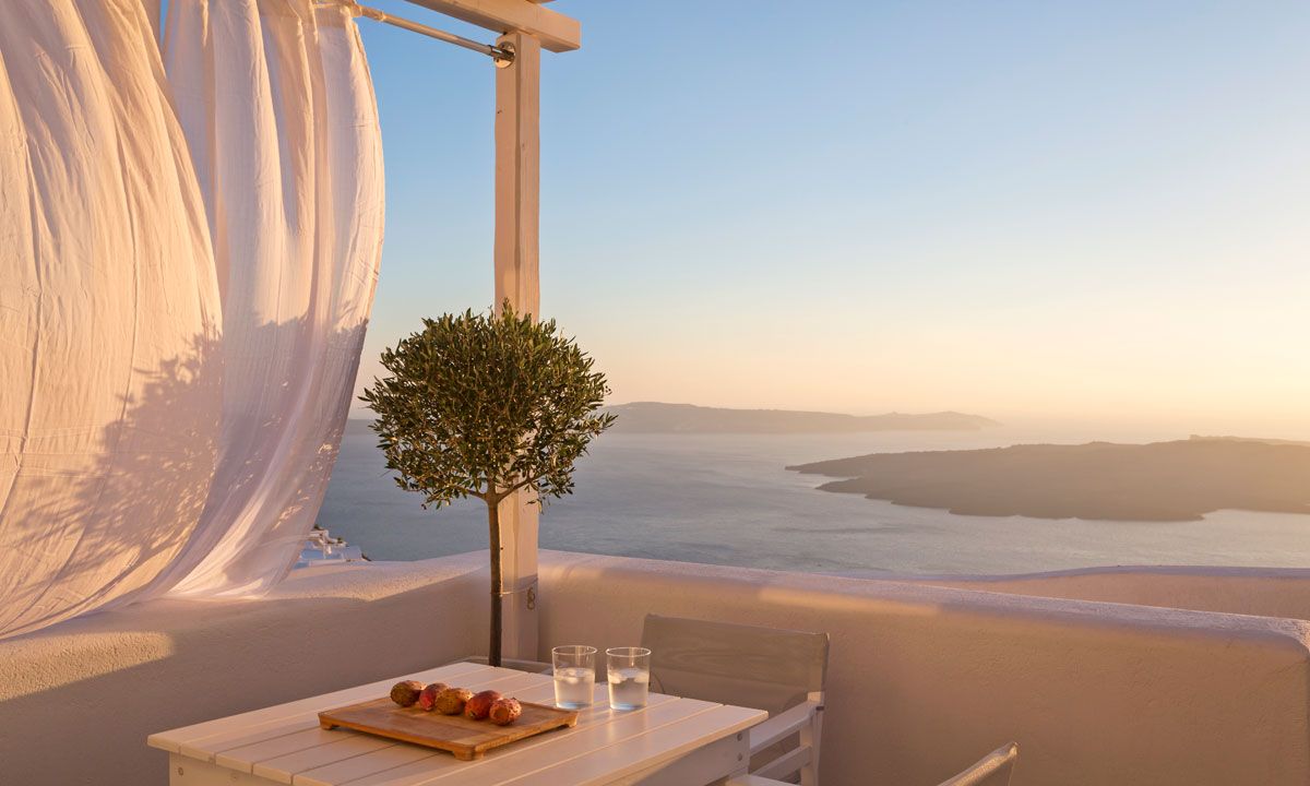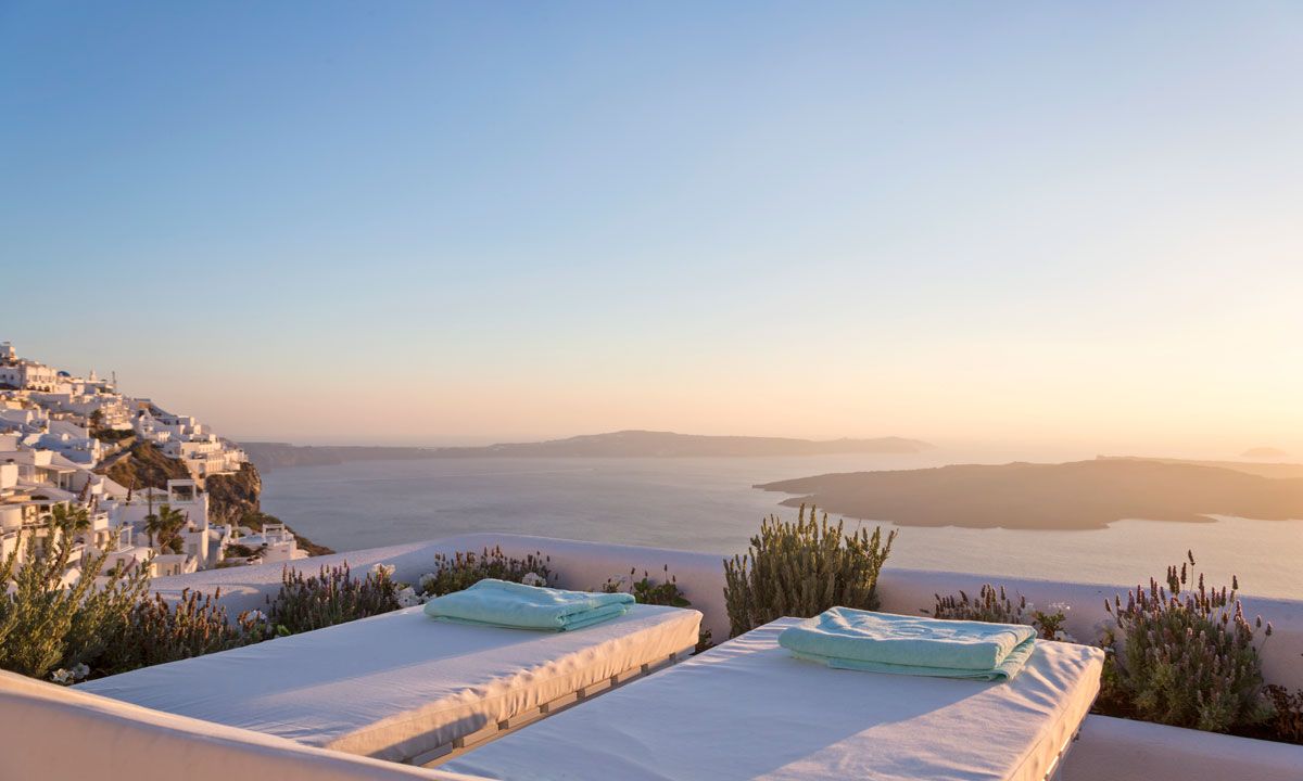 Perched on the imposing grayish brown volcanic cliffs and ideally located in Firostefani, one of the most beautiful spots on the island, Santorini Villa Alexa overlooks a cerulean blue immensity with sweeping views of the volcano and the caldera.