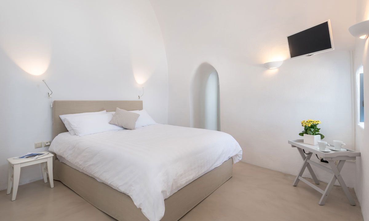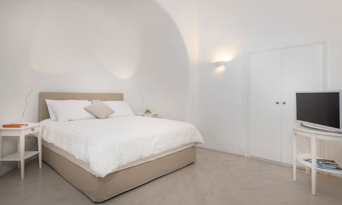 All three bedrooms are built in the style of Santorini's cave houses. Beautiful wooden furniture and large beds give an elegant feel to the premises. Fabrics in subtle shades complete the picture. All rooms have air-conditioning and LCD TVs. Two of the bedrooms have direct access to the courtyard, while the third bedroom has access to the courtyard through the living room.