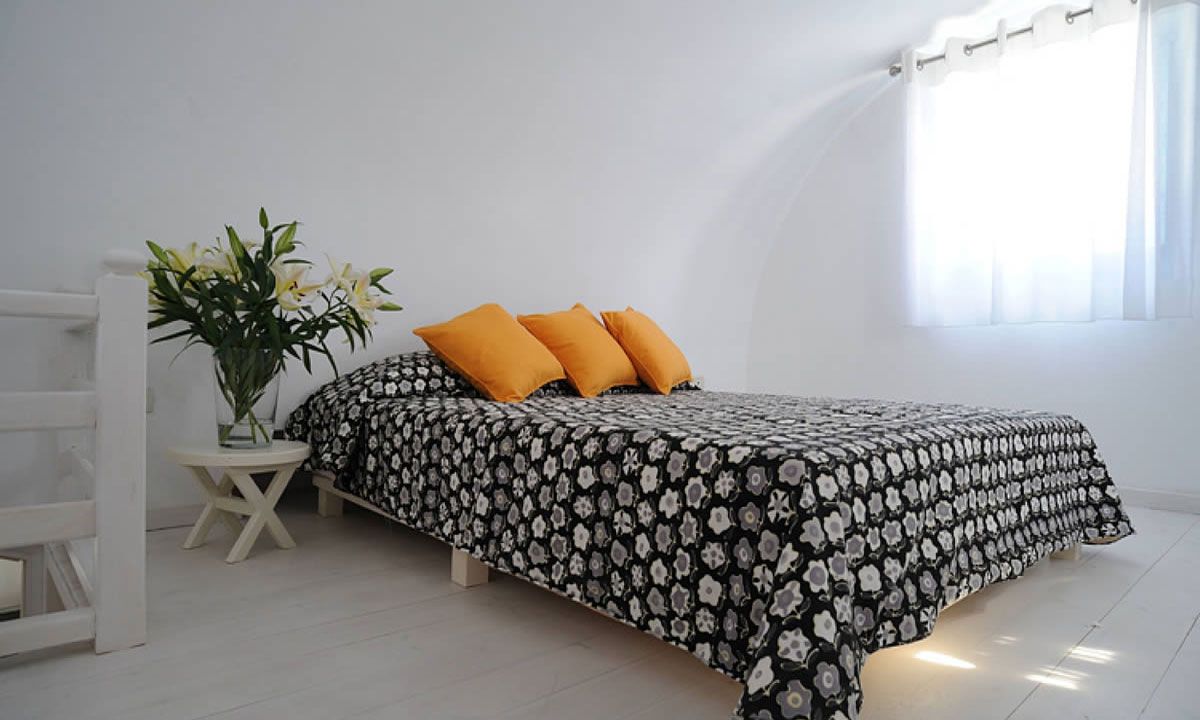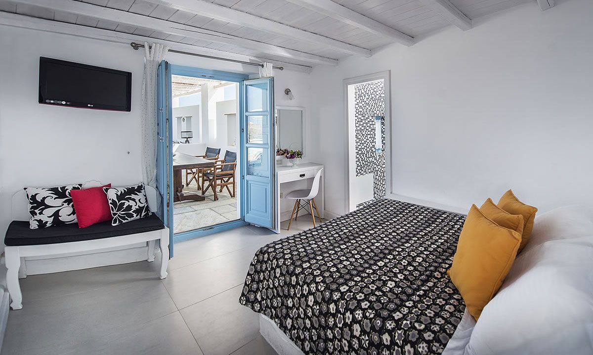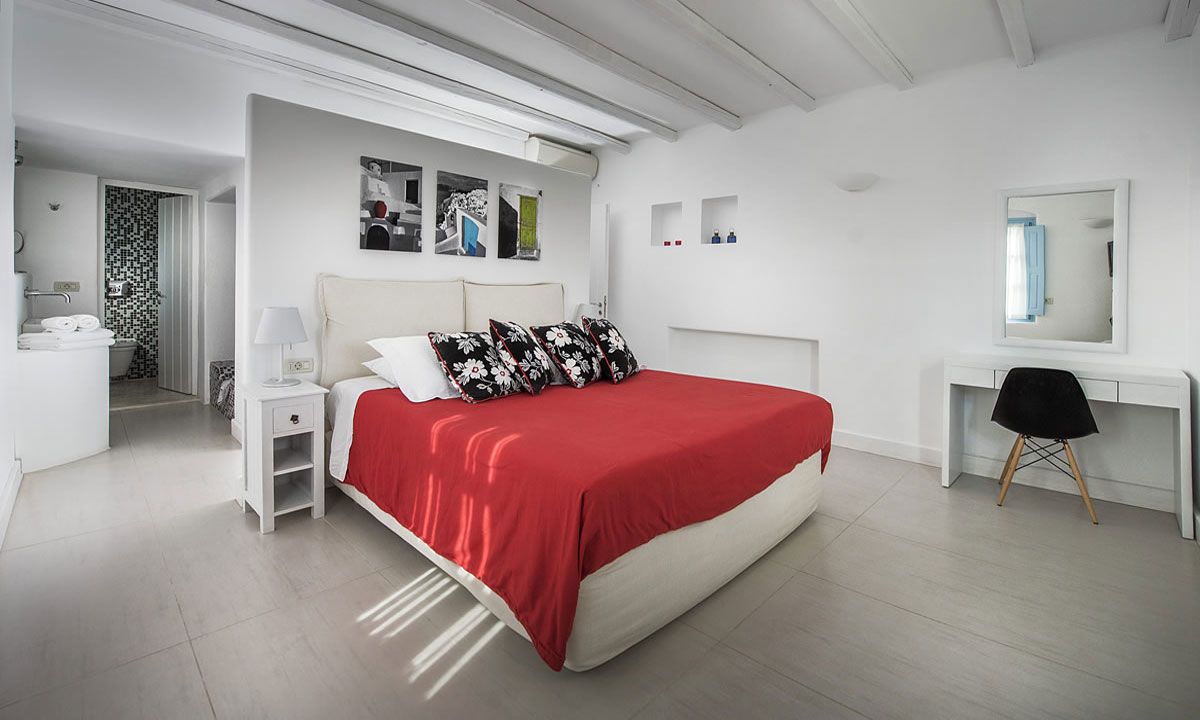 The bedroom "A" features a queen size bed and has a private terrace with beautiful views of the countryside and the village of Firostefani, a walk in closet, and an en-suite bathroom with accessories from well known designers