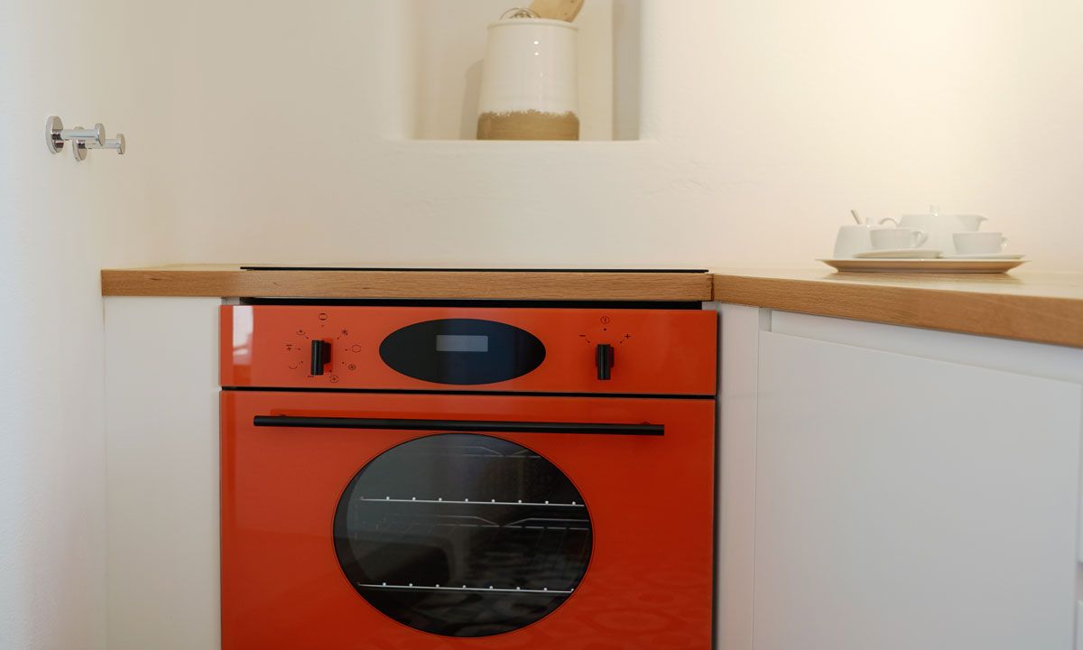 Apart from the 2 bedrooms, the house has a spacious sitting area, with table and built sofa and a fully equipped kitchen with a window also to the sea and volcano.