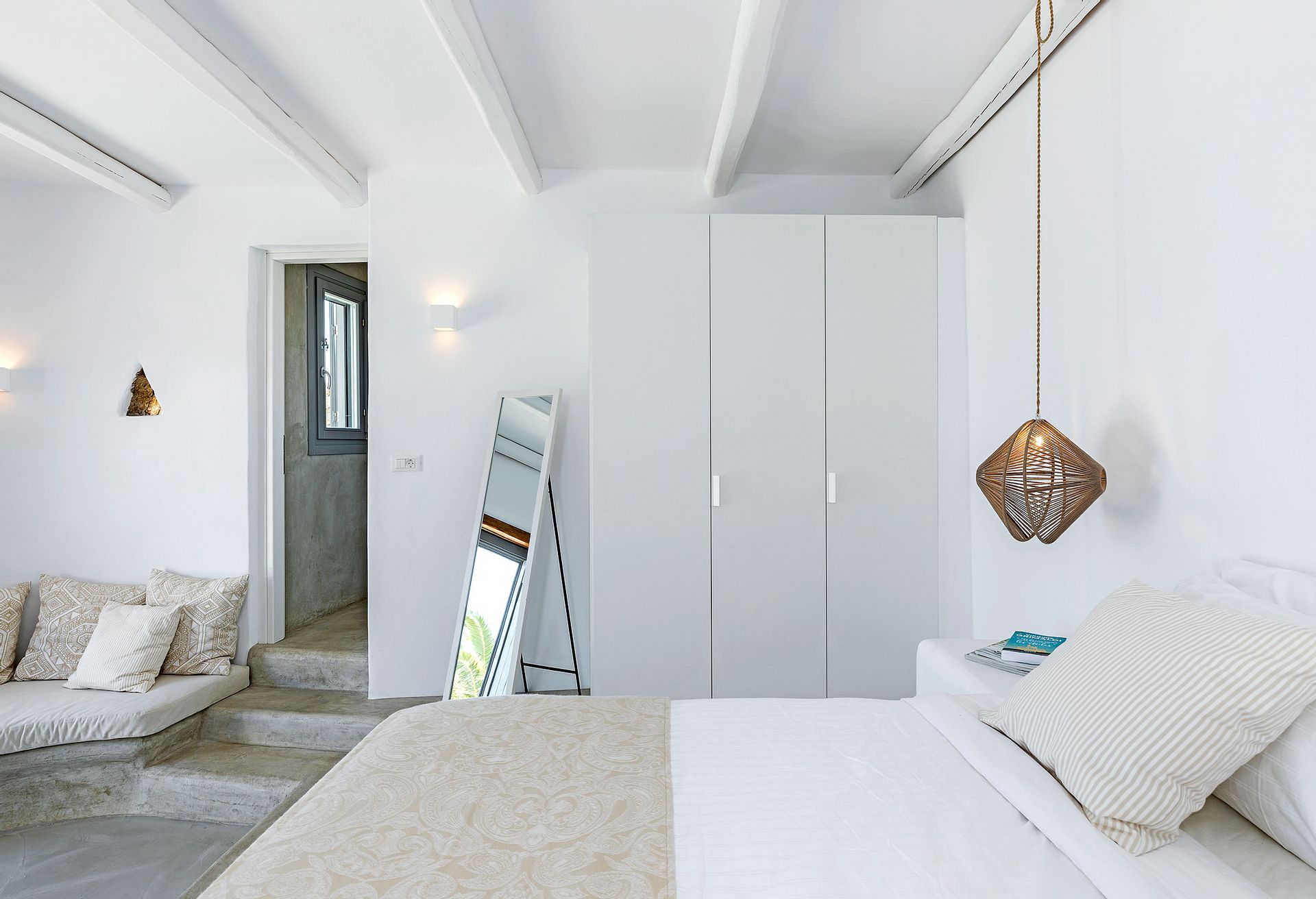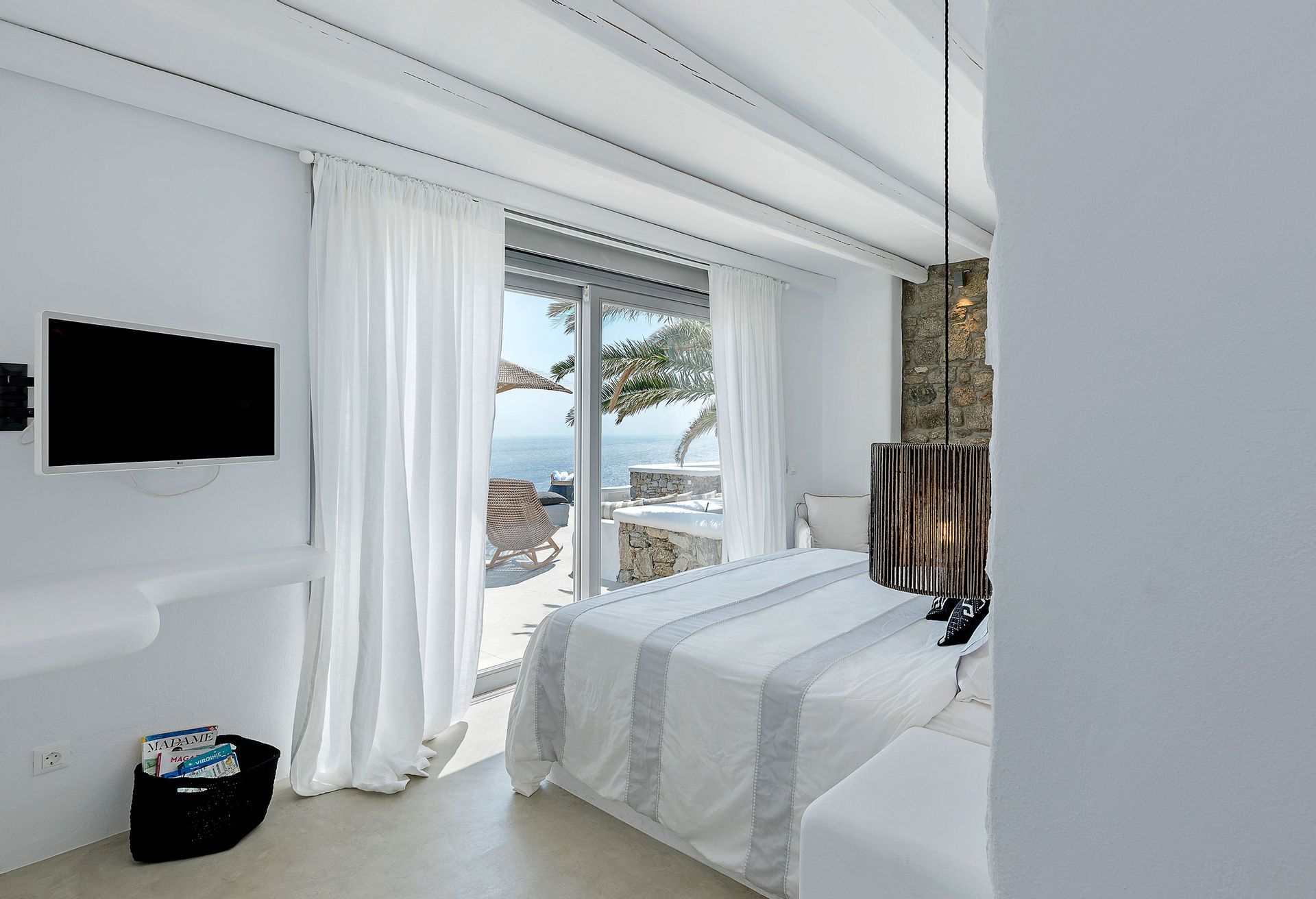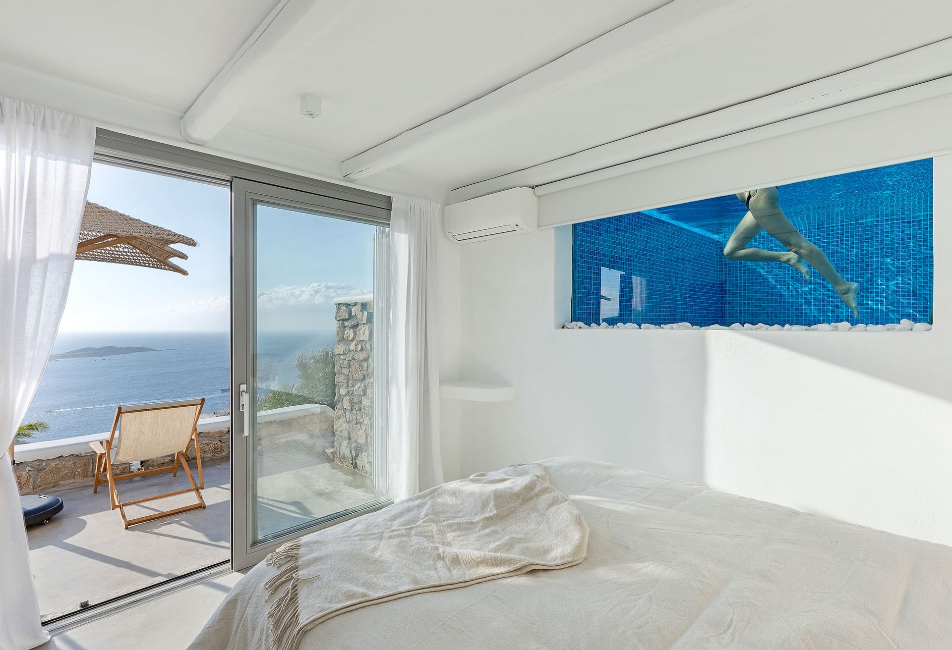 Inspired by the Ancient Greek Cycladic Architecture, Villa Delfine is minimal and modern. Respecting the beauty of Mykonos’ nature and completely integrating into the ground, its interior design features beautiful hallways of stone and glass that will make your heart skip. One will feel totally at ease in the expansive living room and dining area, furnished throughout with stylish, hand-crafted pieces, but the panoramic views across the Aegean take the experience to a whole new level.