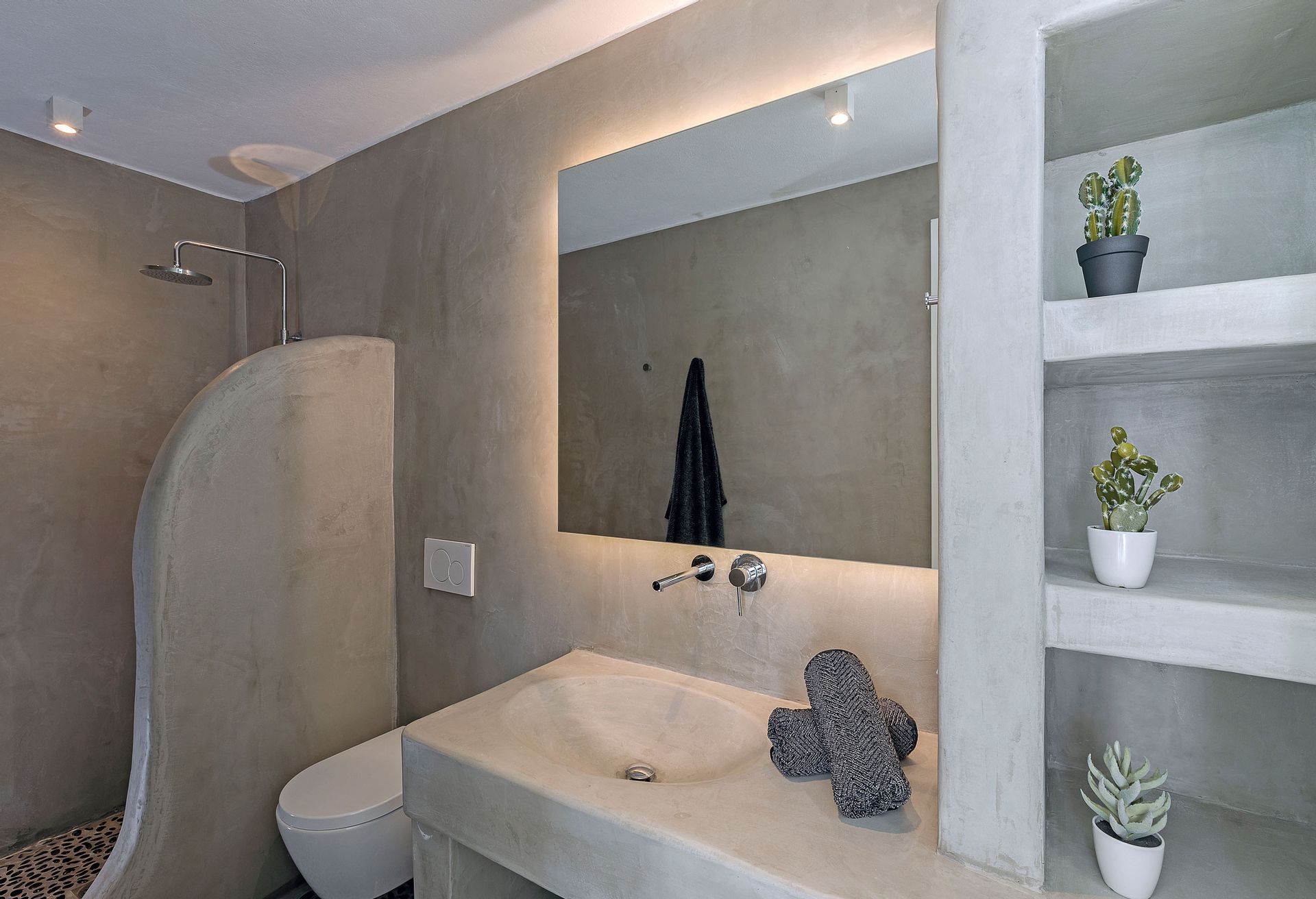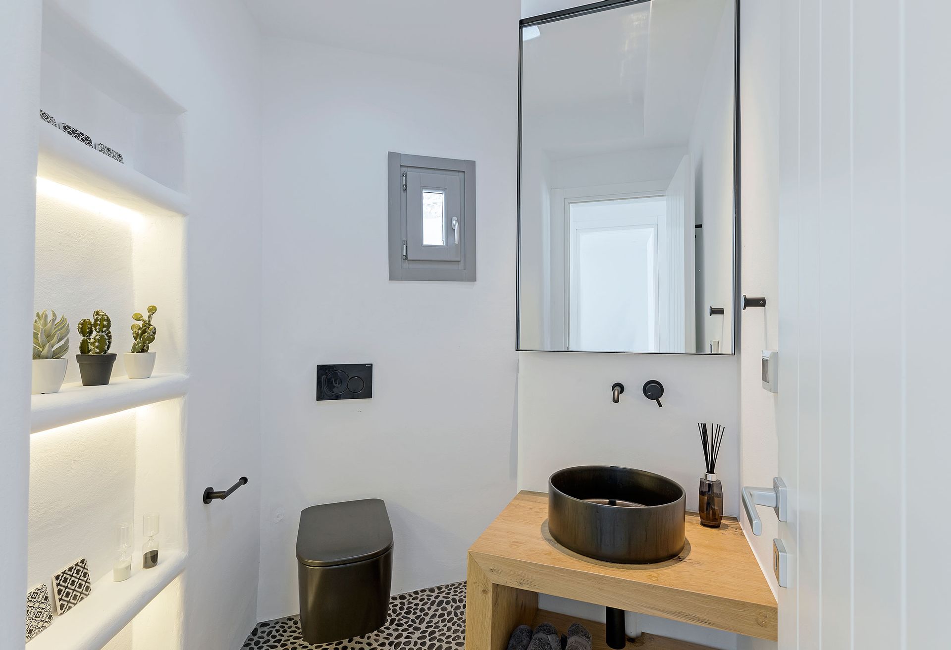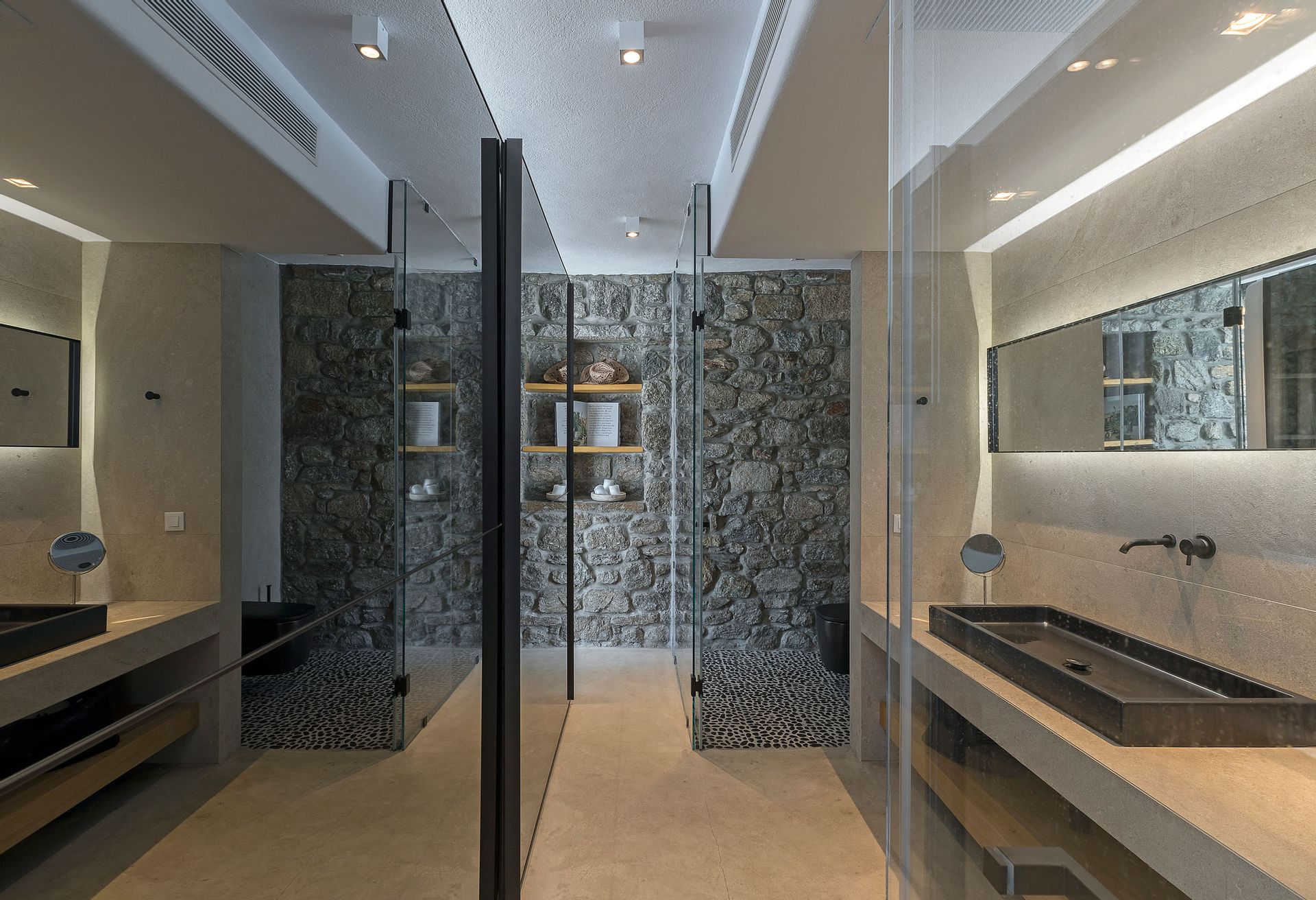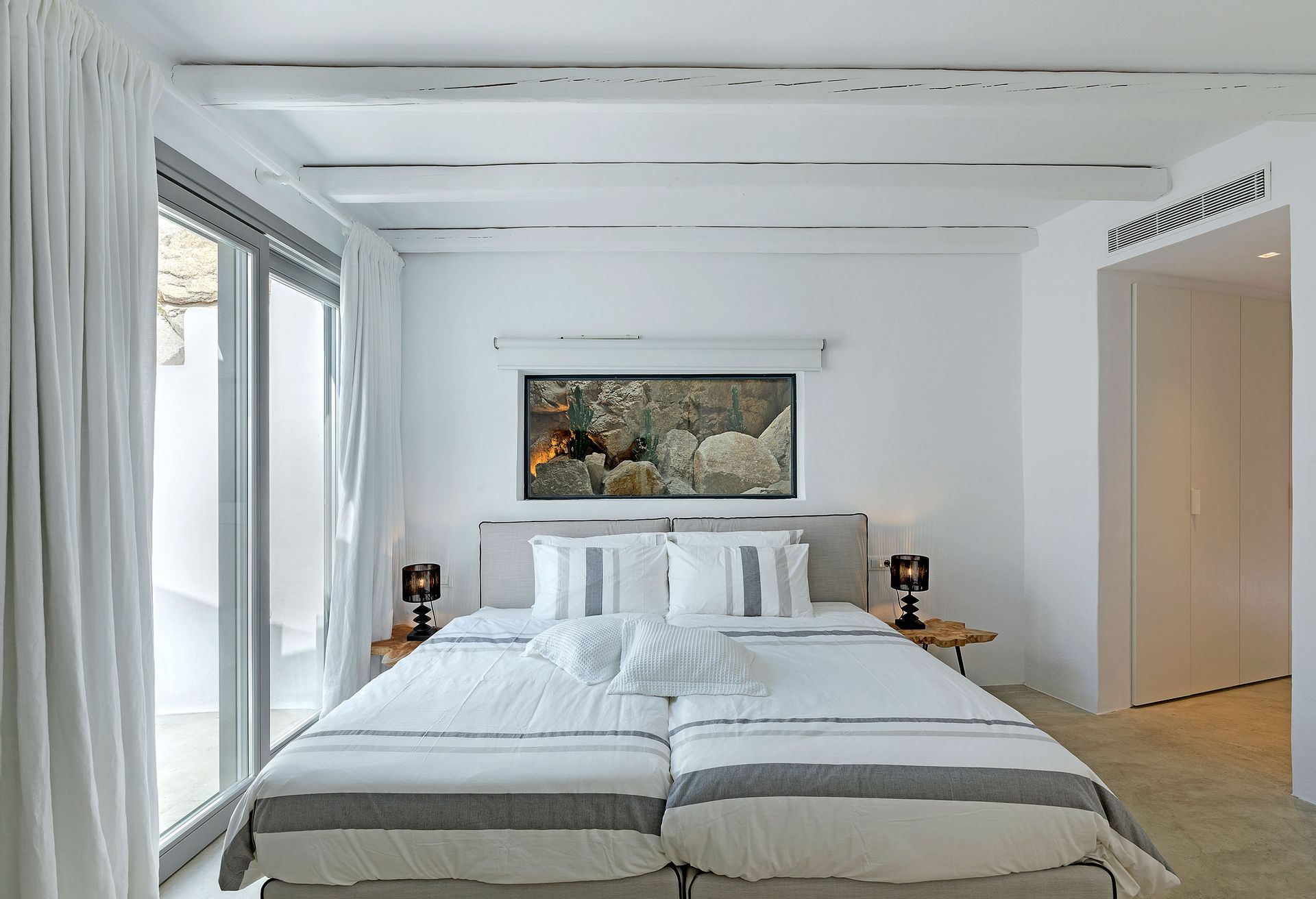 Inspired by the Ancient Greek Cycladic Architecture, Villa Delfine is minimal and modern. Respecting the beauty of Mykonos’ nature and completely integrating into the ground, its interior design features beautiful hallways of stone and glass that will make your heart skip. One will feel totally at ease in the expansive living room and dining area, furnished throughout with stylish, hand-crafted pieces, but the panoramic views across the Aegean take the experience to a whole new level.