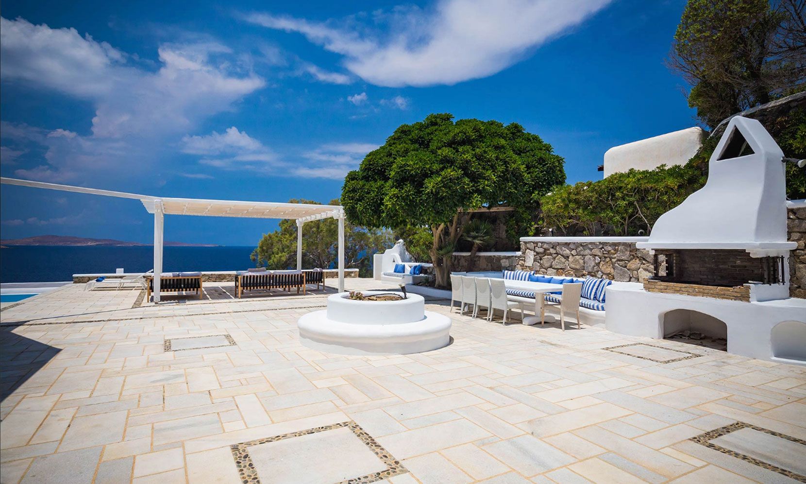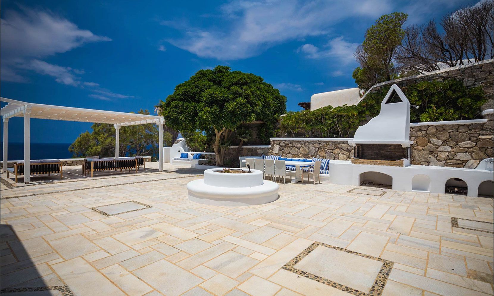 The house is surrounded by various spacious white-stone terraces and relaxation areas as well as a huge pond-style waterfront infinity pool. In the pool, the beautiful marble deck with comfortable sun-chairs promise a relaxing morning and afternoon and the two spacious outdoor dining and BBQ areas are perfect for cocktail parties and open-air dinners.