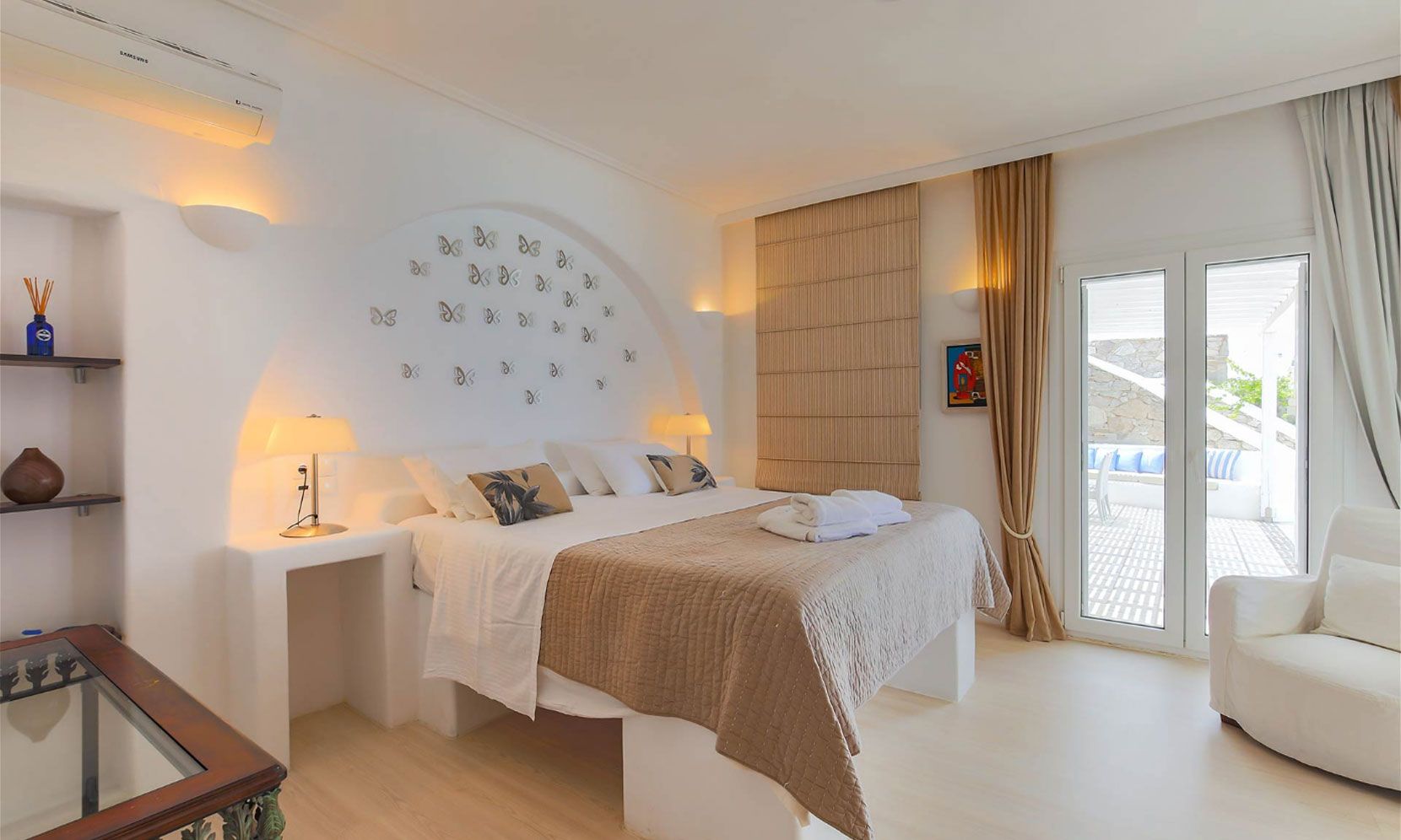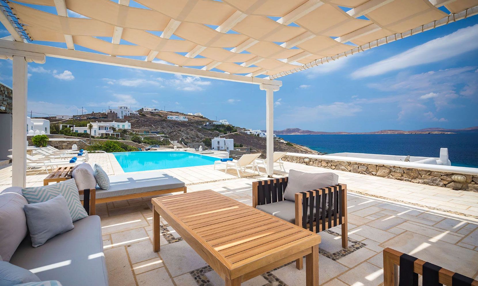 Villa Eumelia is one of the top luxurious and comfortable villas in the island of Mykonos. The villa is located in Aleomandra facing the deep blue waters of the Aegean Sea, the historical island of Delos and its colorful sunsets. The villa is impeccably designed to combine modern style with traditional Mykonian architecture.