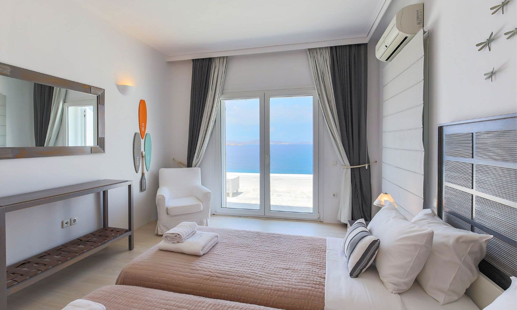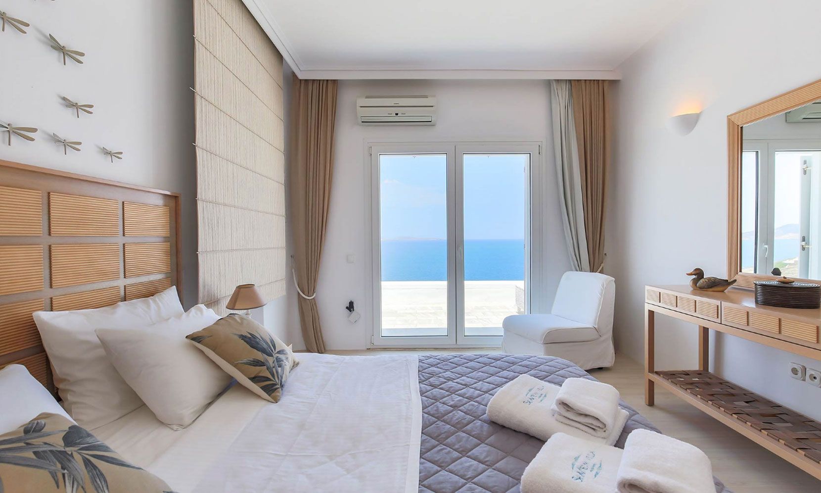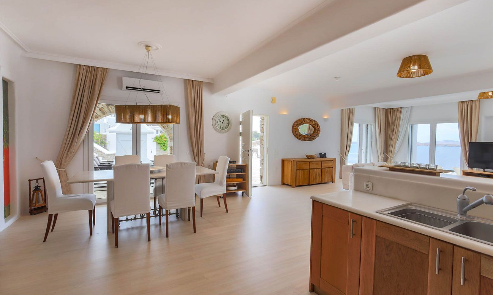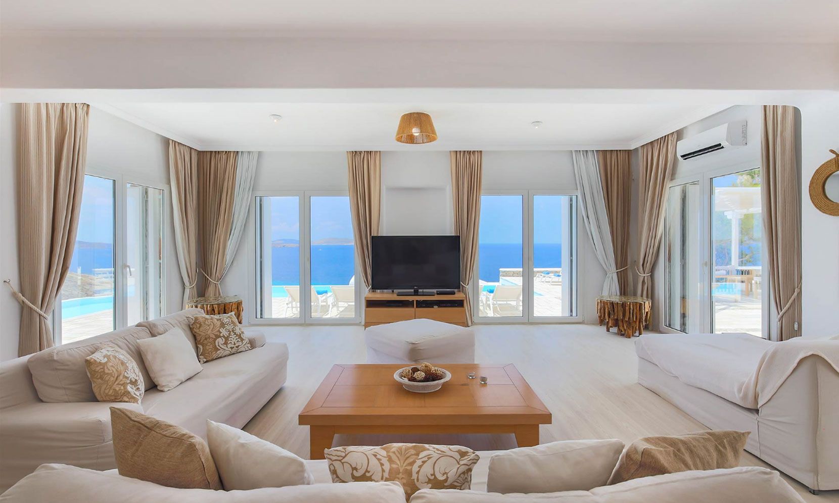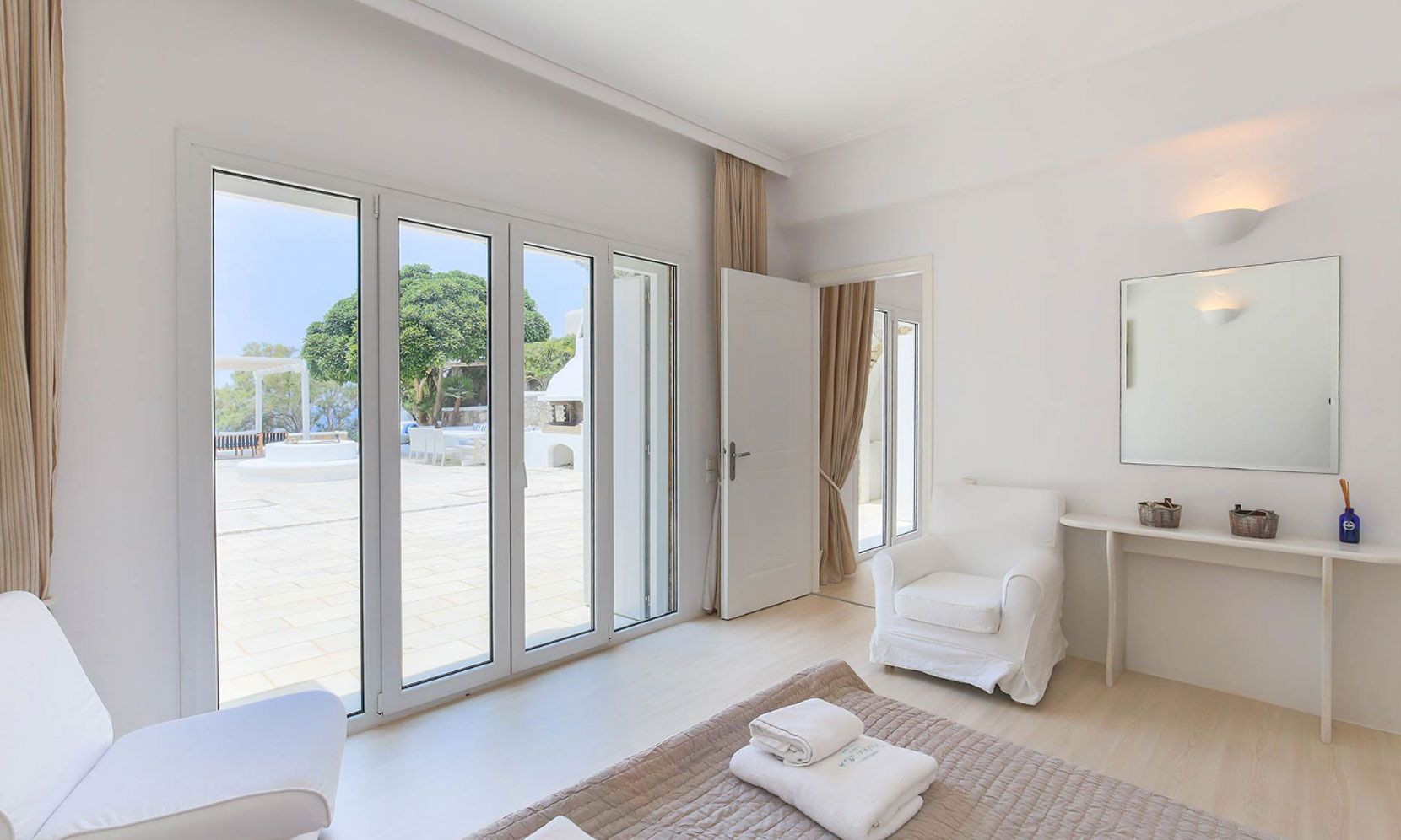 The living room is decorated with elegant and modern white furniture. The fully equipped kitchen and formal dining area feature large windows and balconies overlooking the pool and the sea, offering a panoramic view of the Aegean sea. One master bedroom with TV and safe and one double bedroom, with en suite bathrooms each, are located on the ground floor. The upper floor features a master bedroom with TV and safe and 2 similar bedrooms, all having their own en suite bathrooms and private terraces.