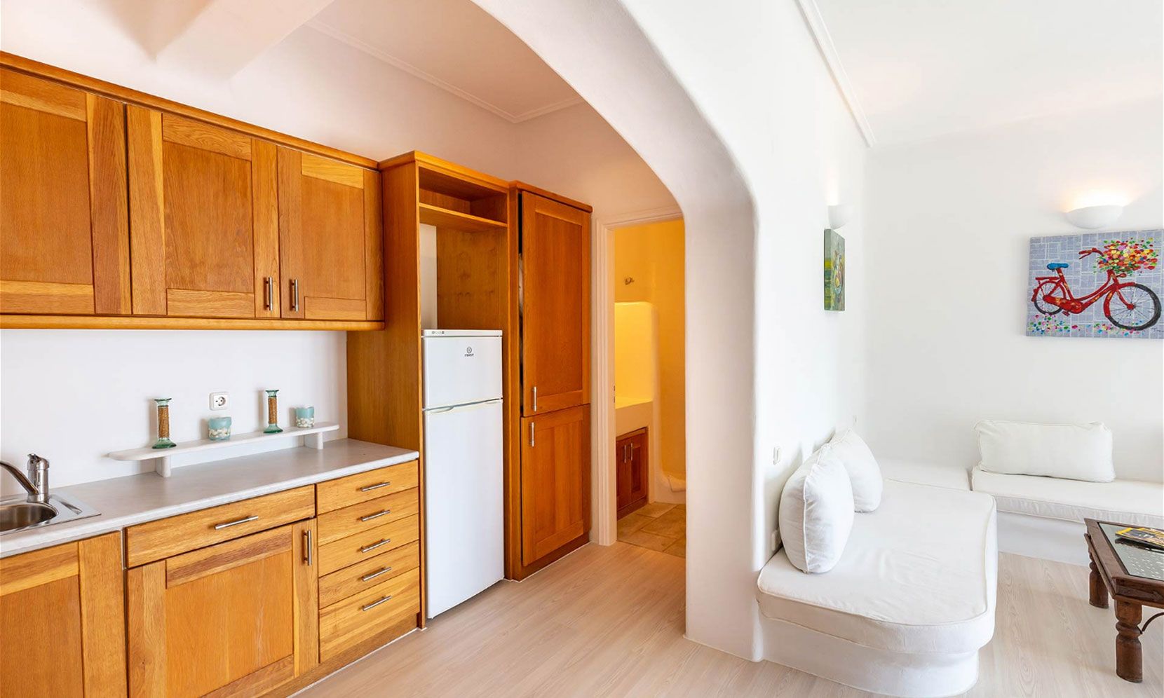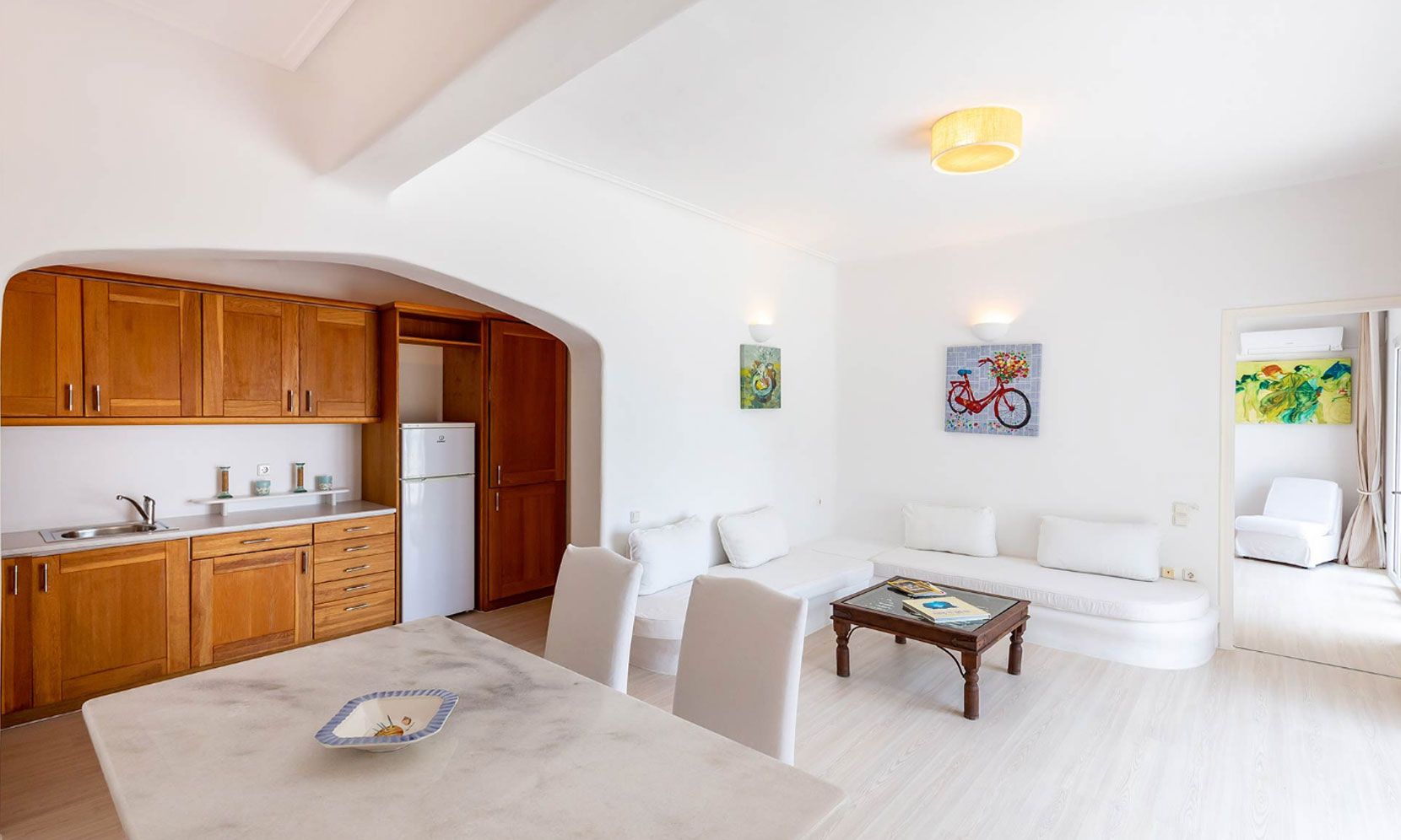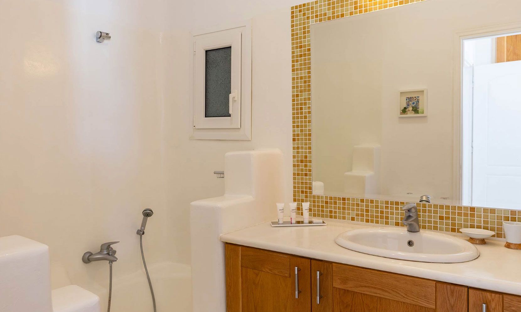 It is located just 4 km away from the Town, 5 km from the airport and 1.5km from Ornos.
