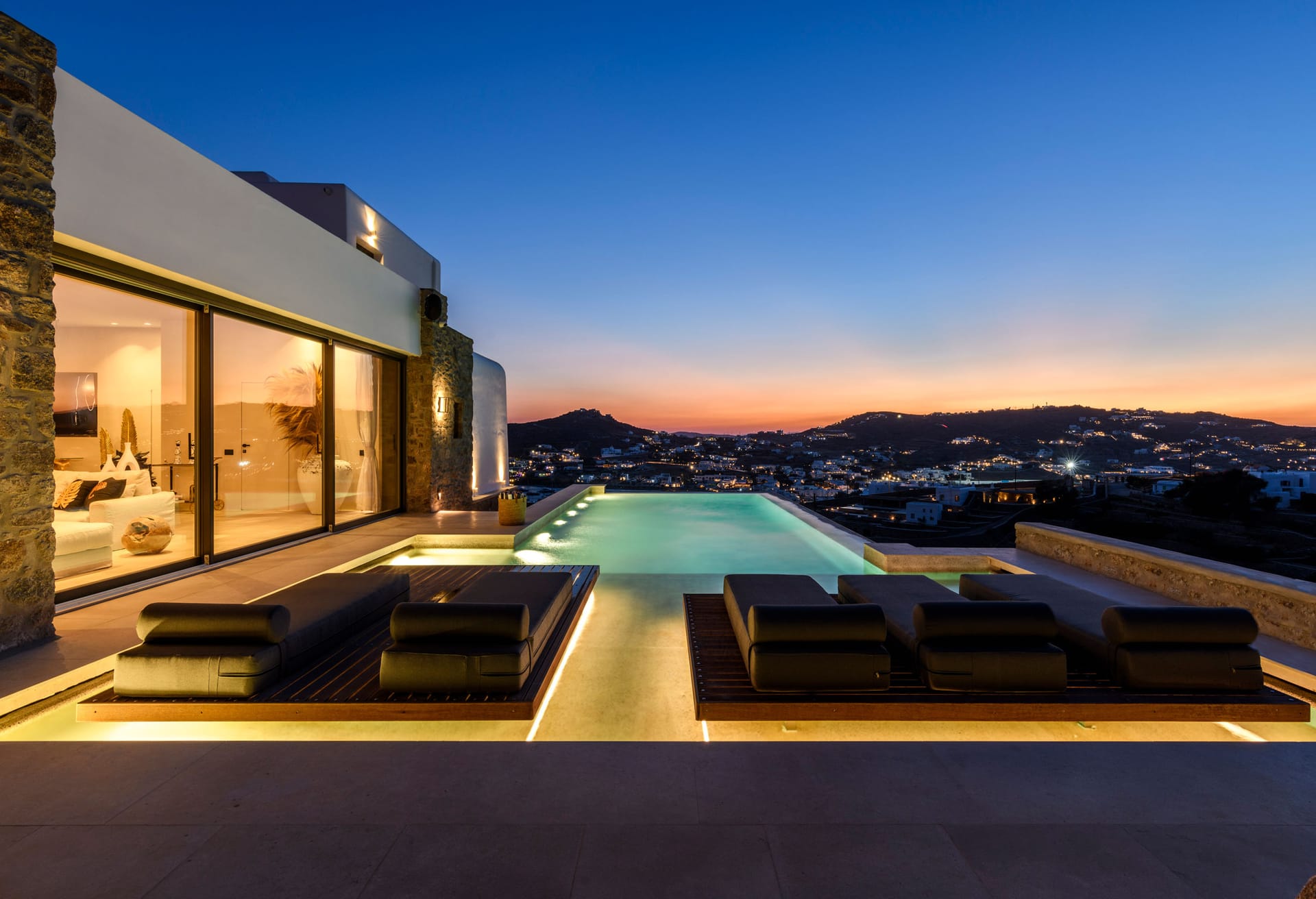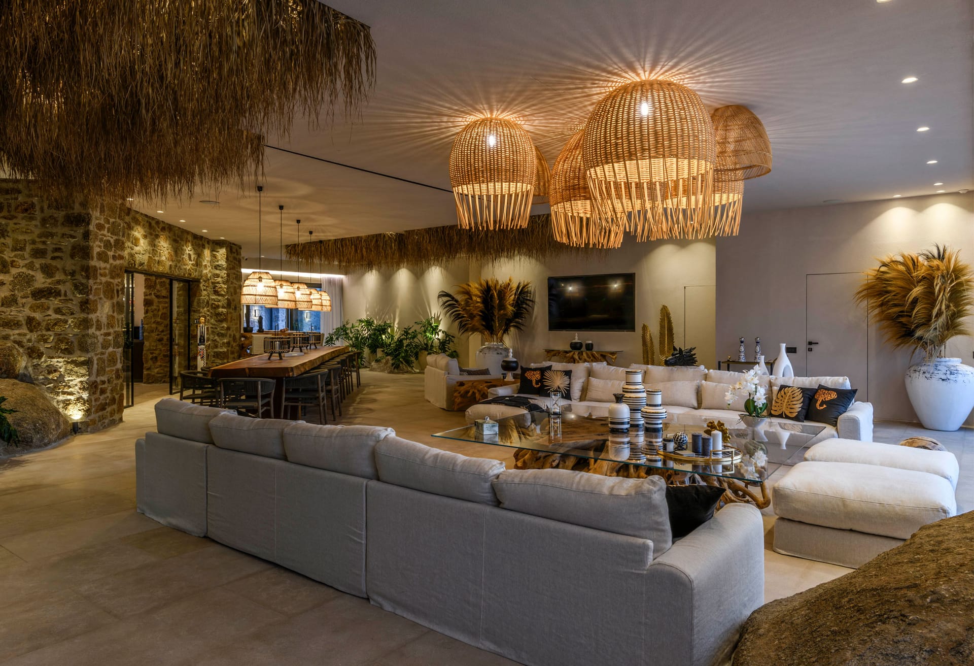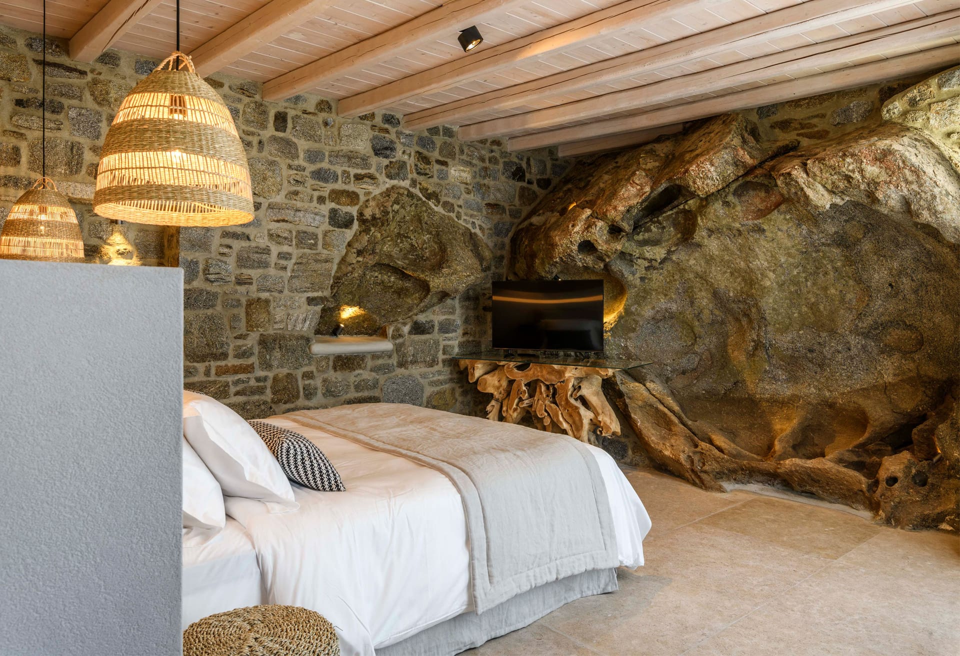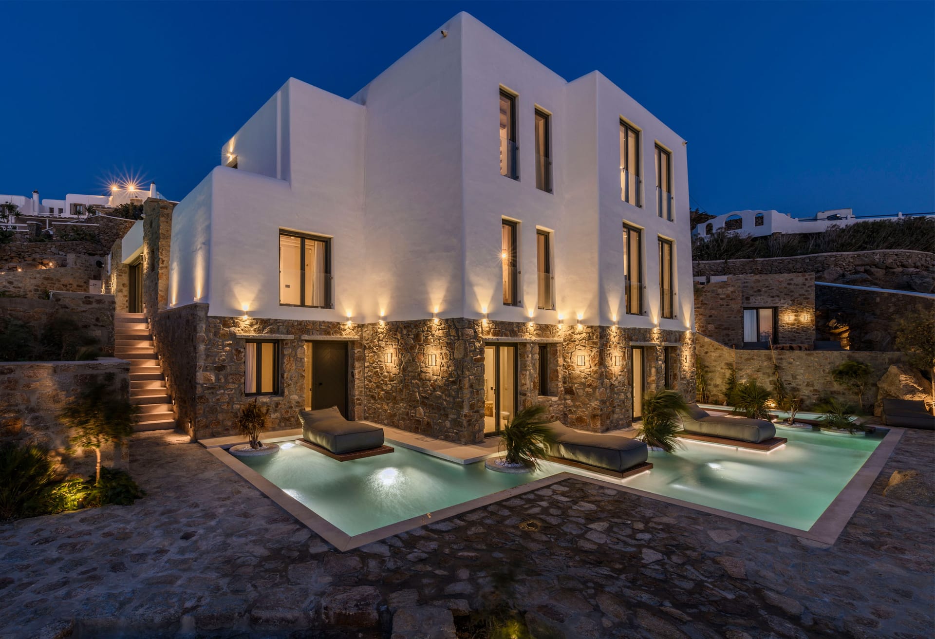 On the first level you can find 2 suites of 120sq m each and independent outdoor area. On the second level, there are 5 master bedrooms, living room, dining area, kitchen, a wine cellar and a second pool! The third level consists of a master suite and two independent guest houses, one of them built on a natural cliff!