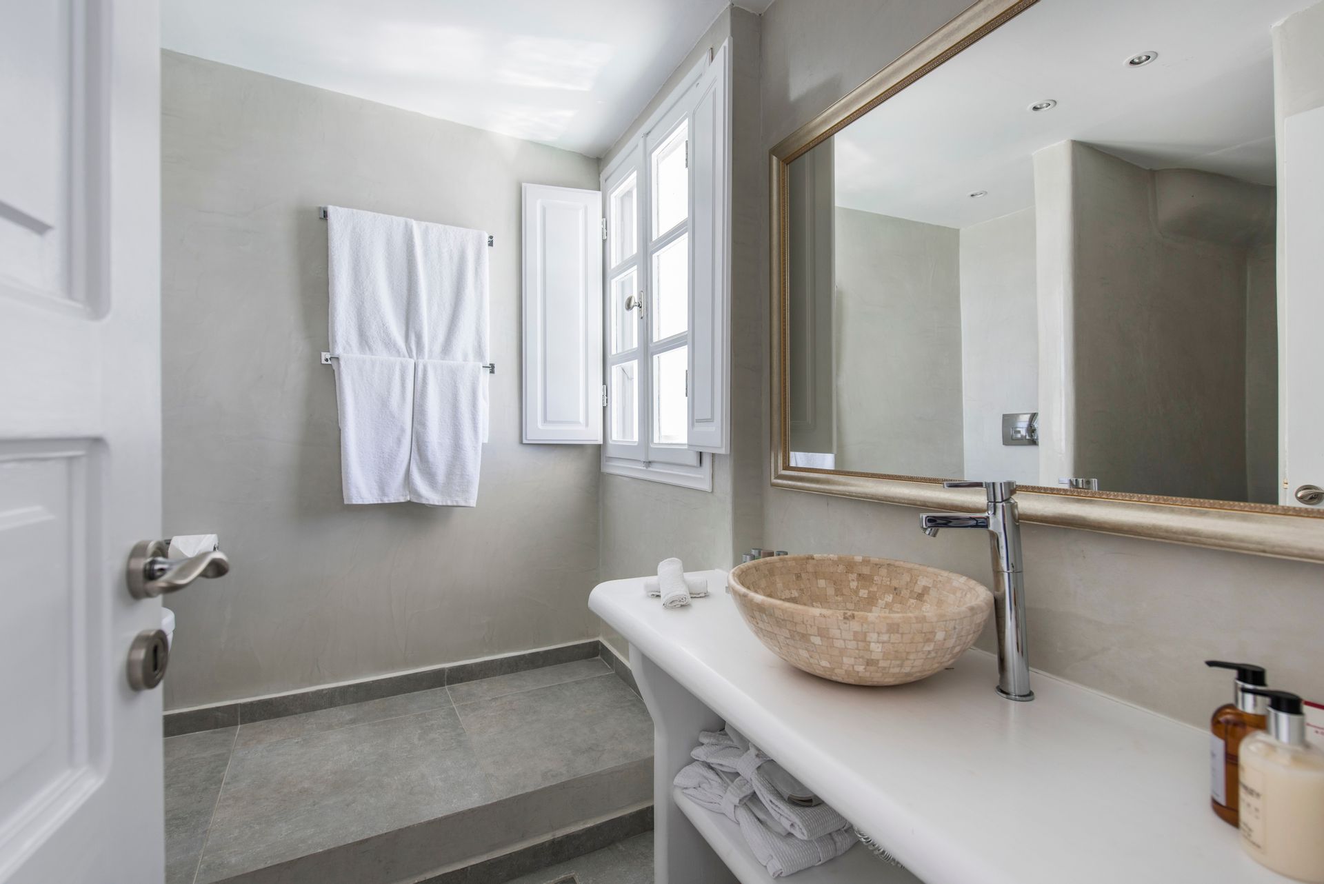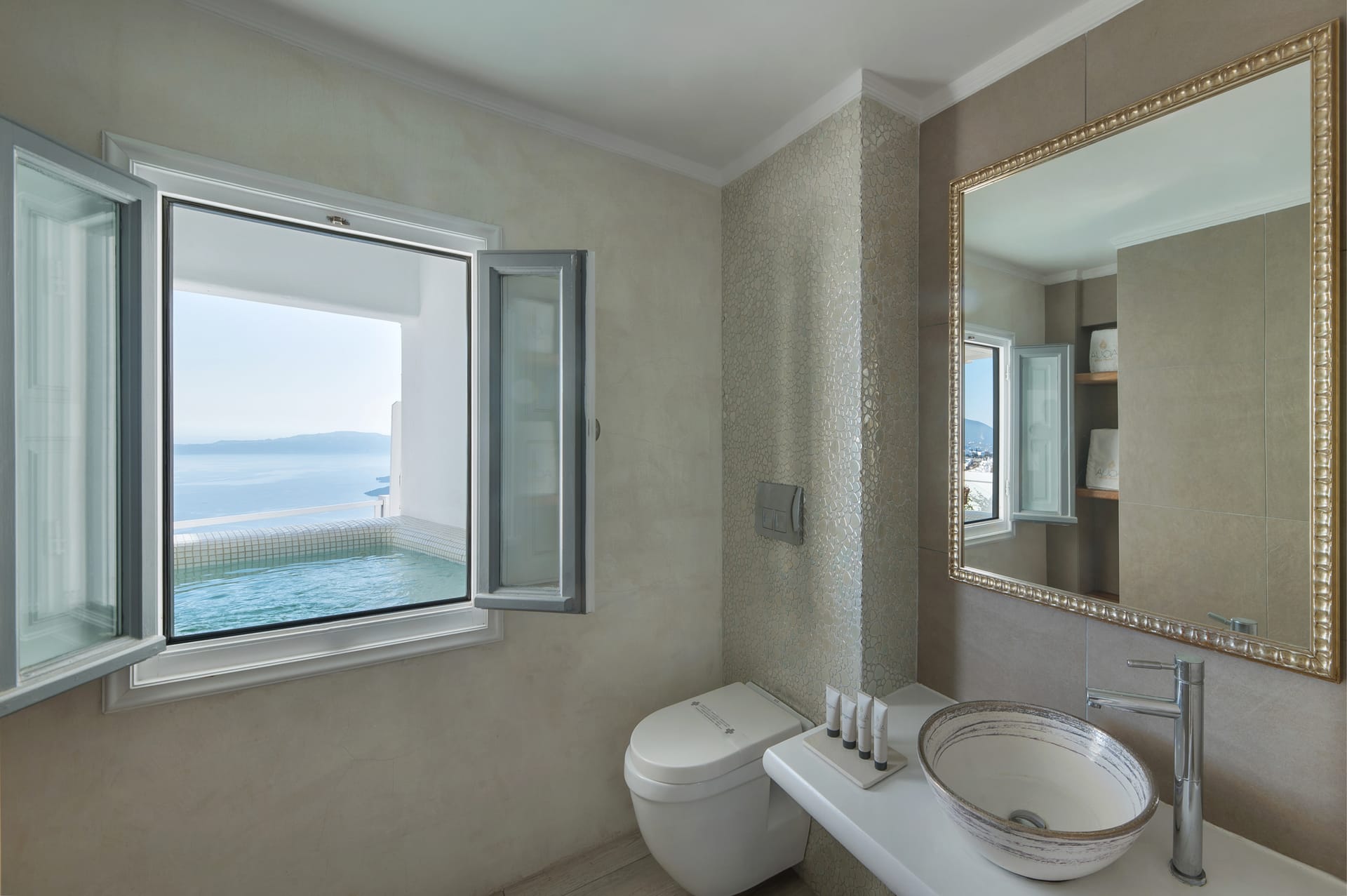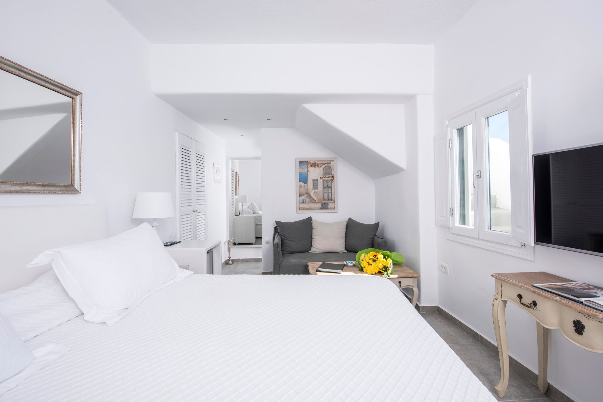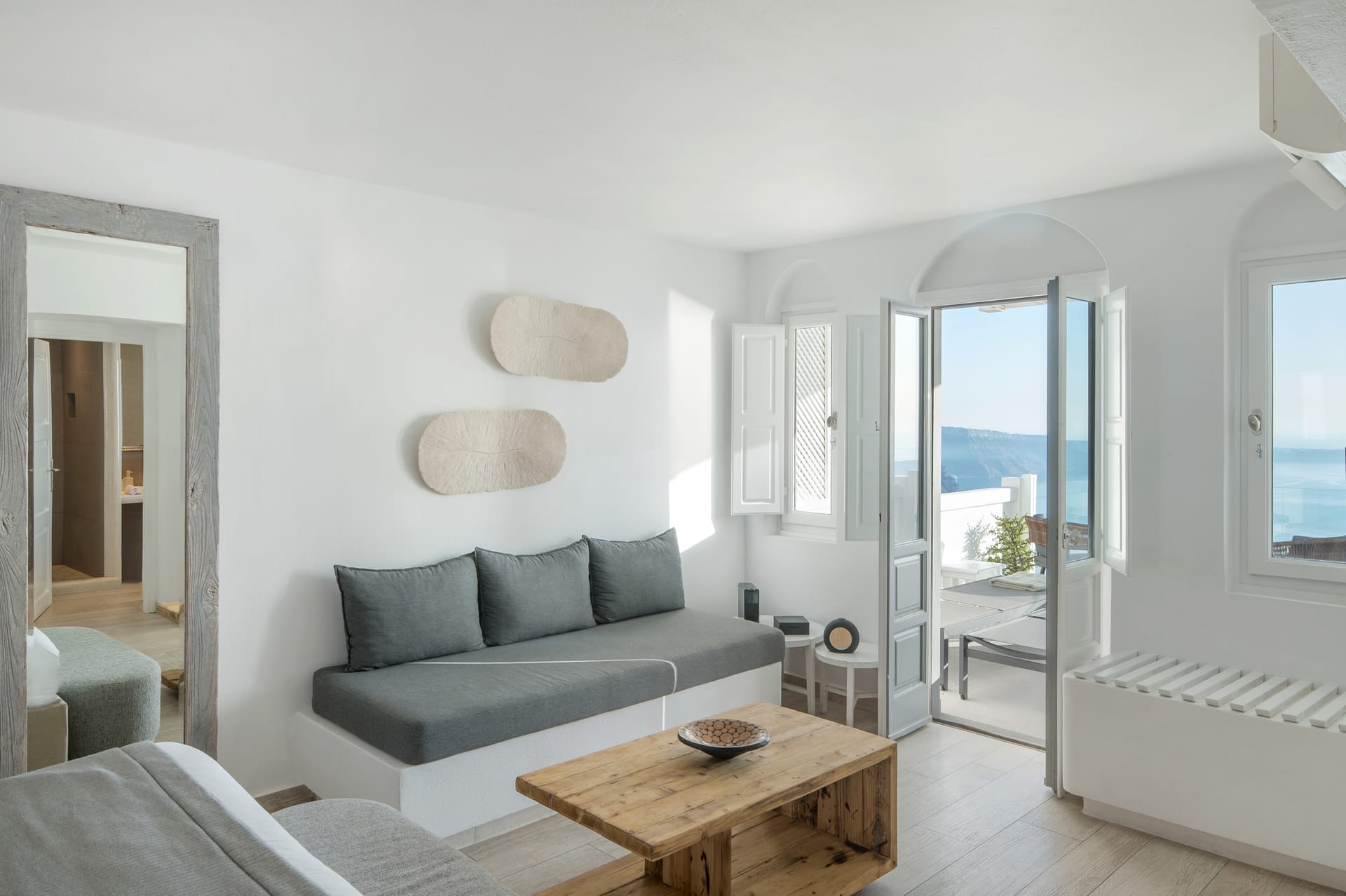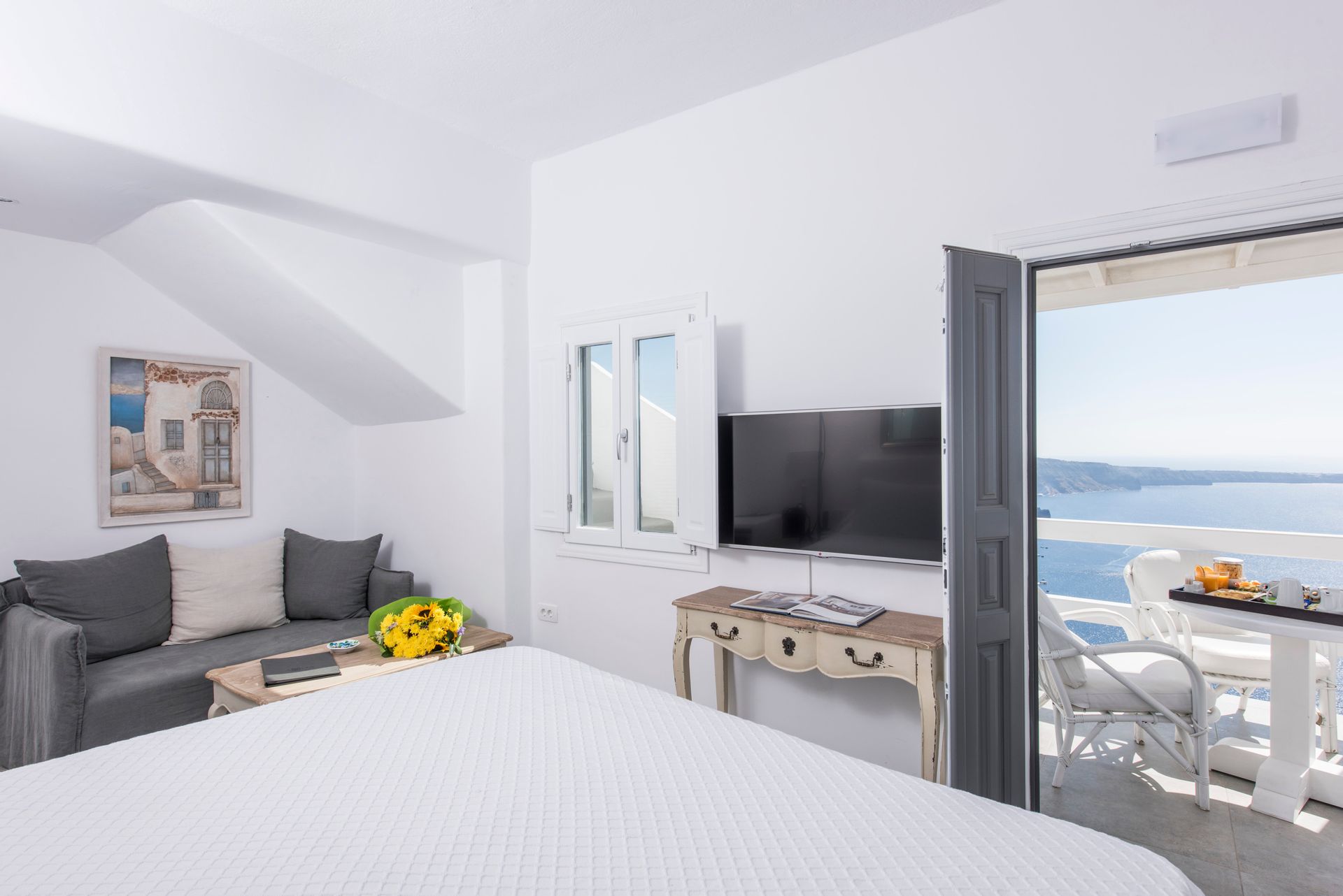 Our Honeymoon Suite features one bedroom with a King size bed, one cozy living area and a bathroom with shower. The Suite opens to a balcony and features one dining table, an outdoor hot tub and offers Panoramic Caldera and Volcano Sea view from the outdoor sitting area.