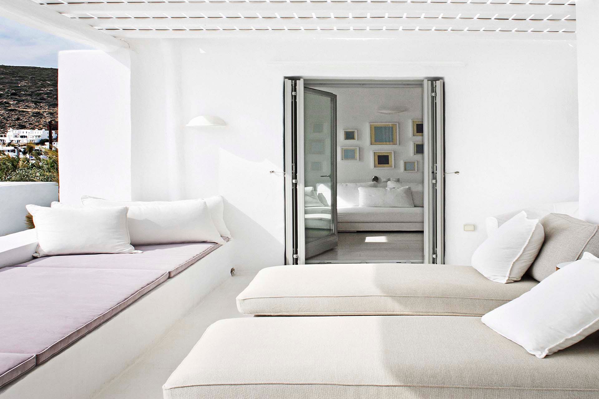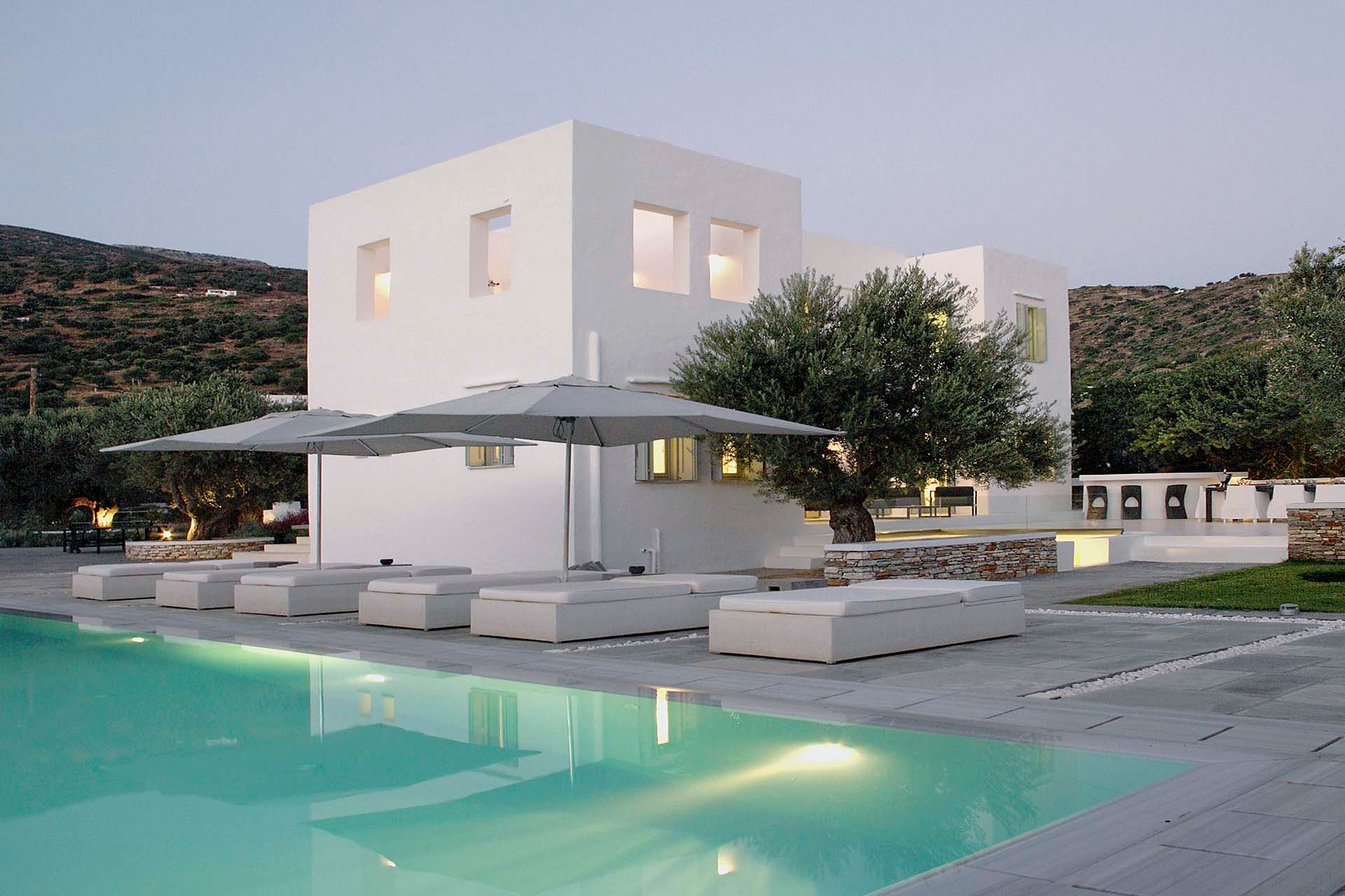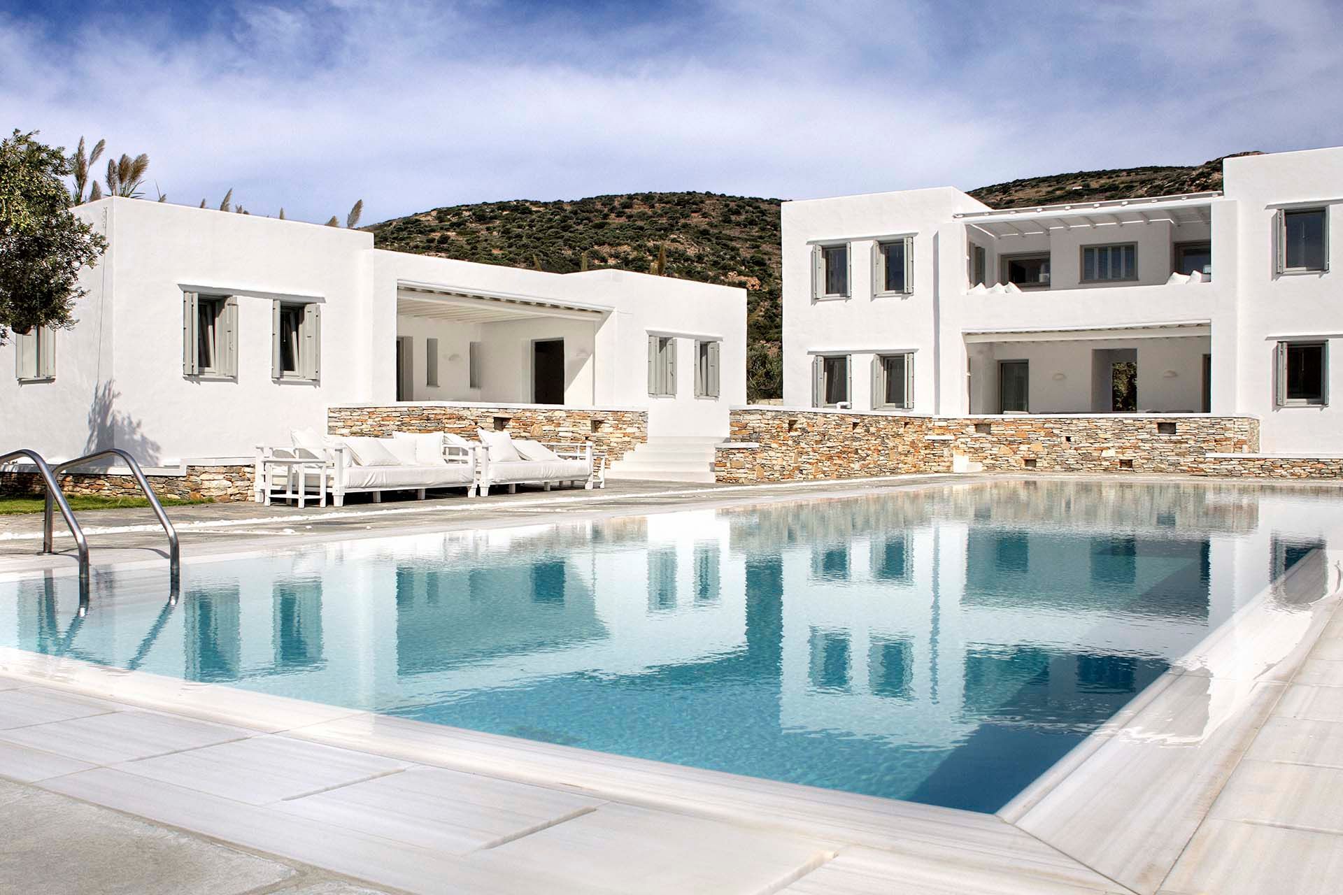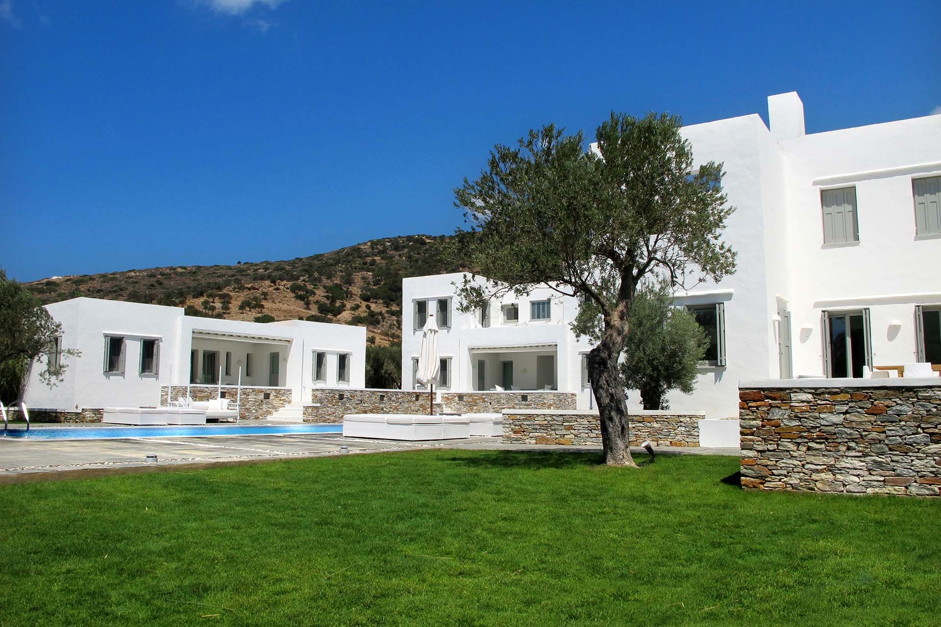 Vathia is a large seafront estate in Vathi, on Sifnos’ south-west coast, arranged across three separate modern buildings—ideal for big groups, retreats, or events where space matters. It offers nine en-suite bedrooms and generous shared areas, including a large living/dining space with a fully equipped kitchen and a TV room for quieter evenings. Outdoors, the villa brings an active, resort-like rhythm: tennis and basketball courts, an indoor gym, private pool with shaded loungers, pool bar, children’s playground, sea-sports equipment, and a hammam. Vathi village is close, with the beach within easy reach, and a private chef can be arranged for relaxed BBQ dinners.