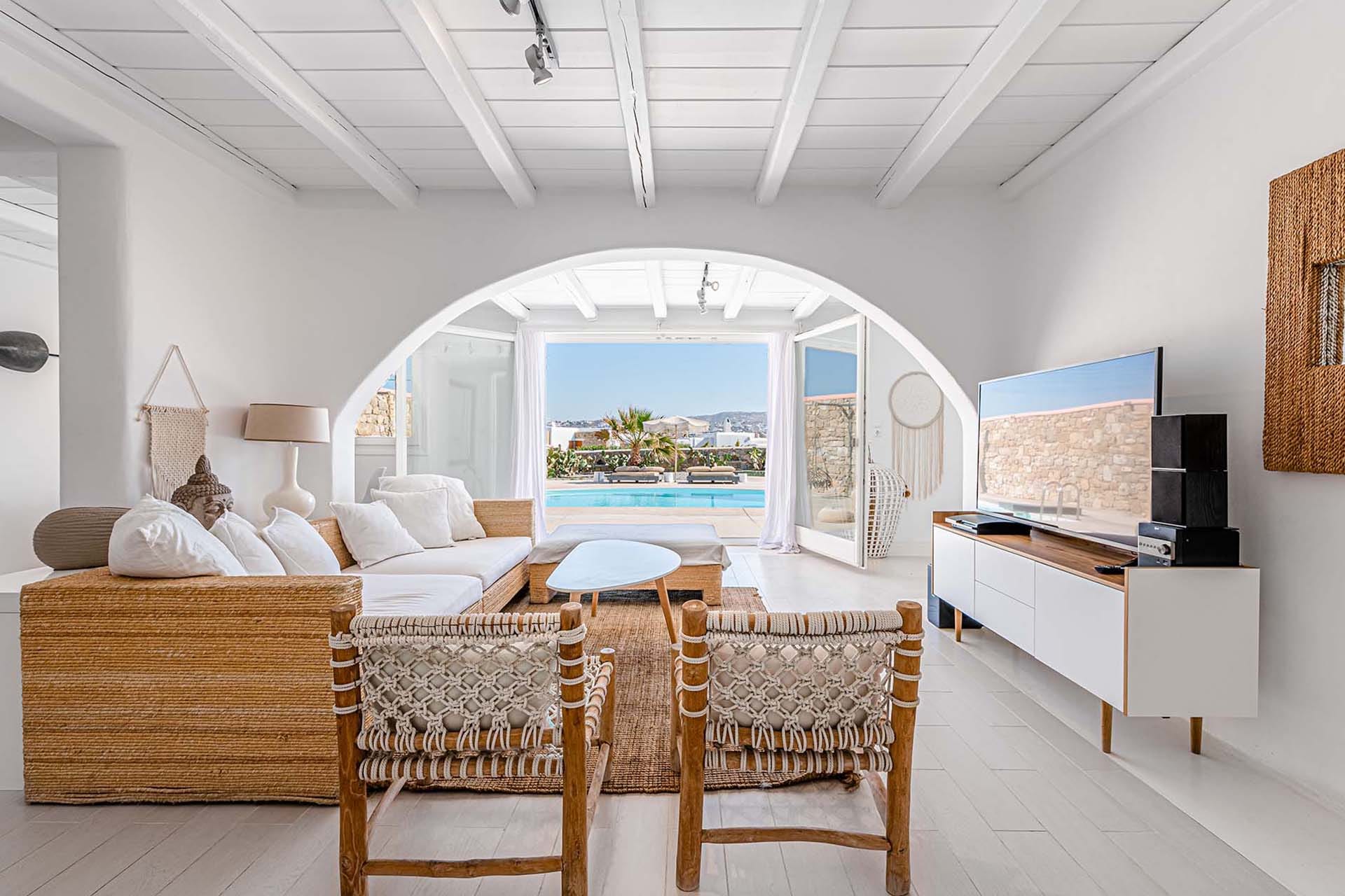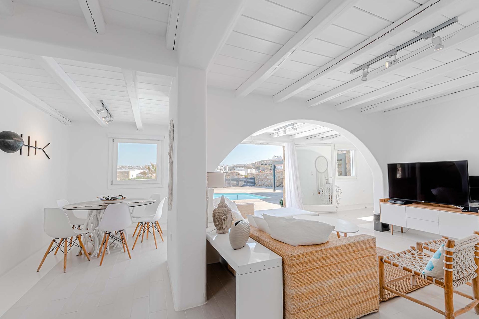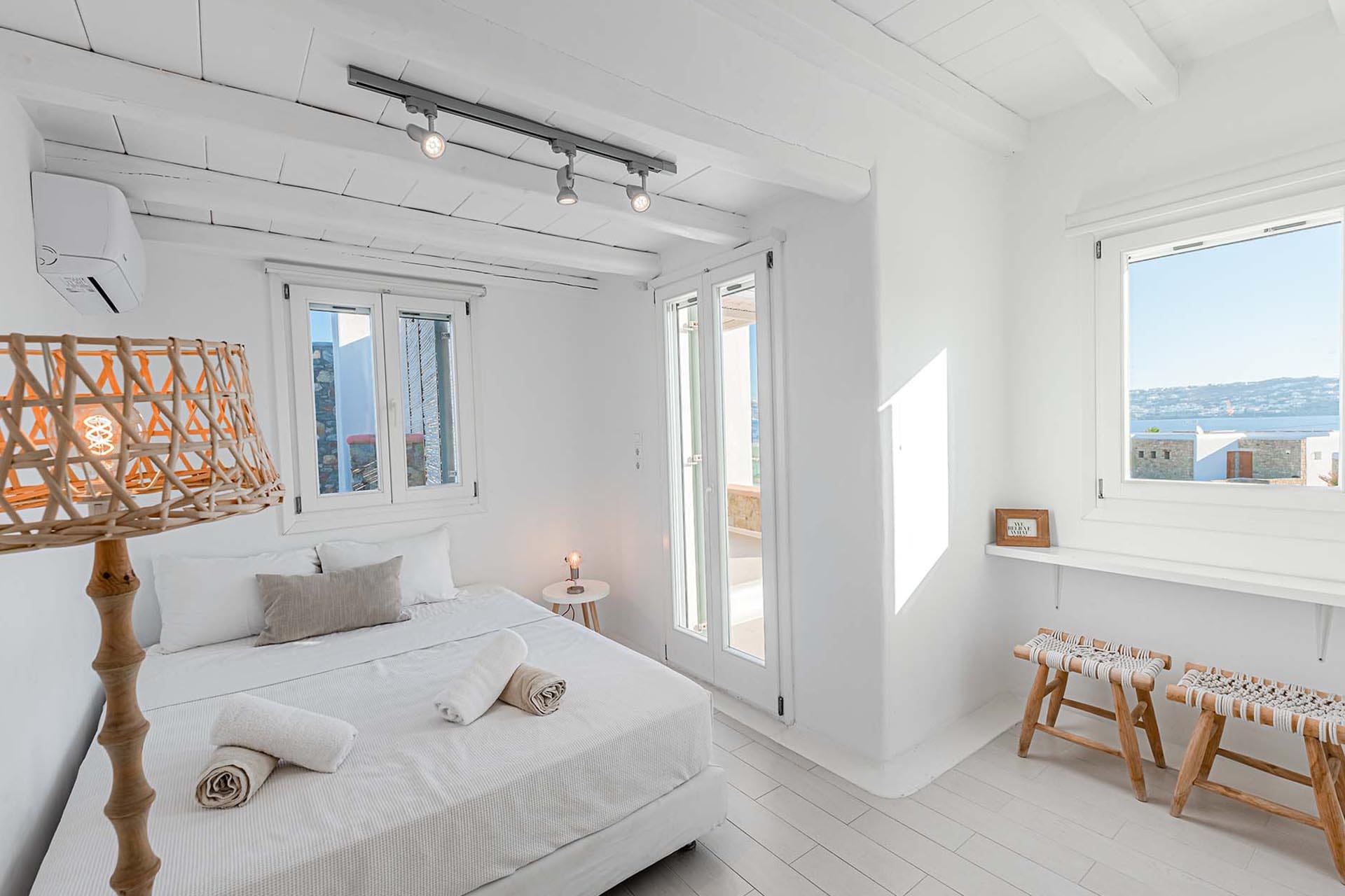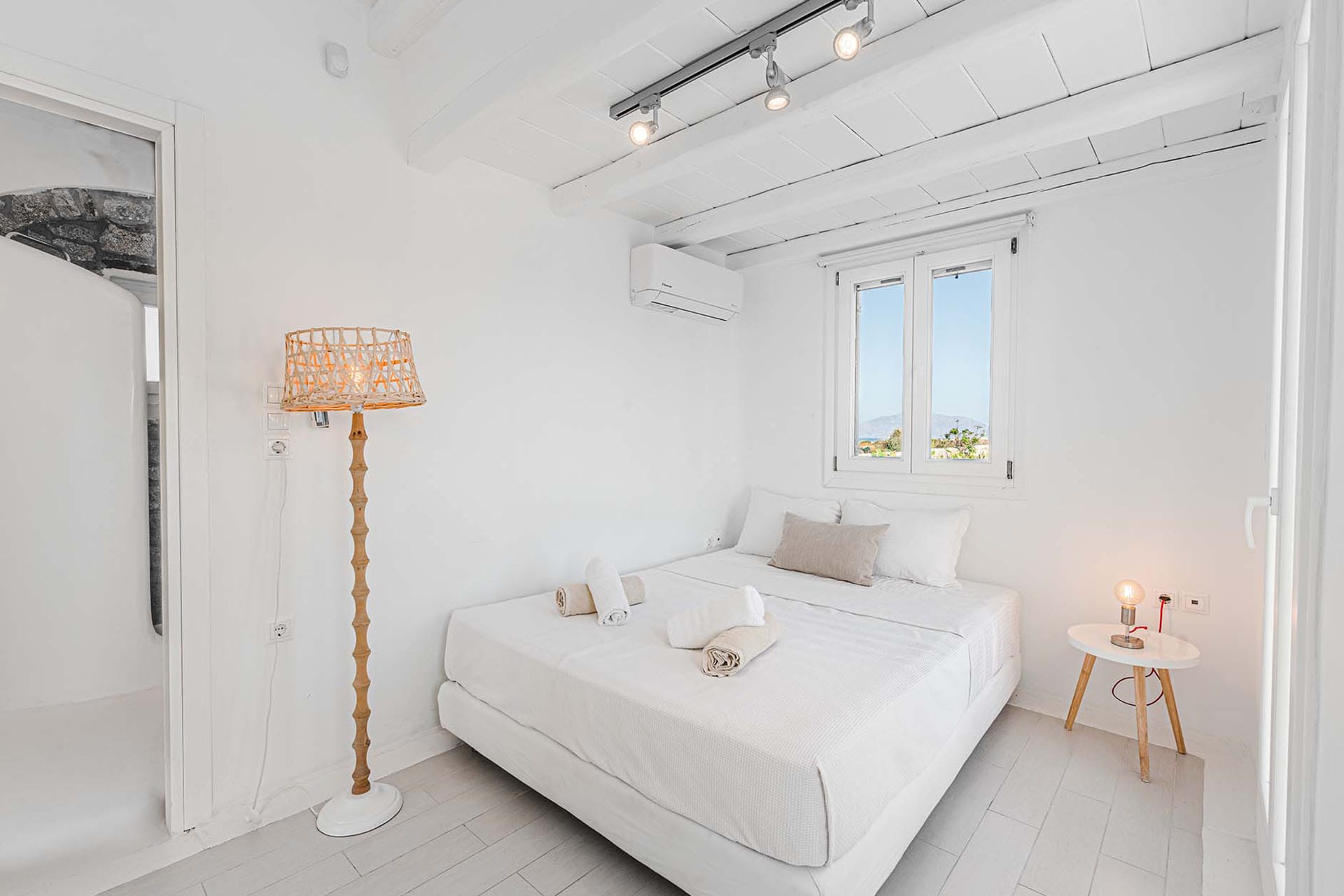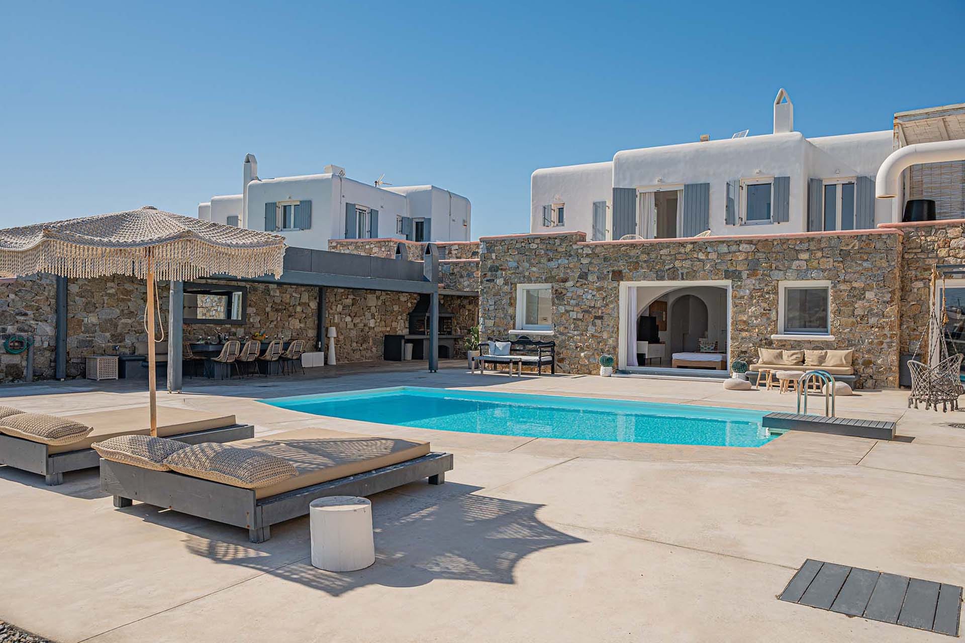 Aeneas is a wind-sheltered villa in Kanalia for up to 6 guests, with wide Aegean views reaching towards Mykonos Town. It’s well placed—about 4.8 km from town and a 5-minute drive to Korfos Beach. Outdoors, a private terrace wraps around a saltwater pool, with umbrella-shaded loungers, a pergola, and a wood-fired BBQ with alfresco dining for long meals. Indoors stays calm and Cycladic-inspired in neutral tones, with beamed ceilings, an open-plan living/dining area and a fully equipped kitchen. Sleeping includes two en-suite queen bedrooms in the main house plus a separate guesthouse double for extra privacy, and there’s also a gym. Baby equipment is available.