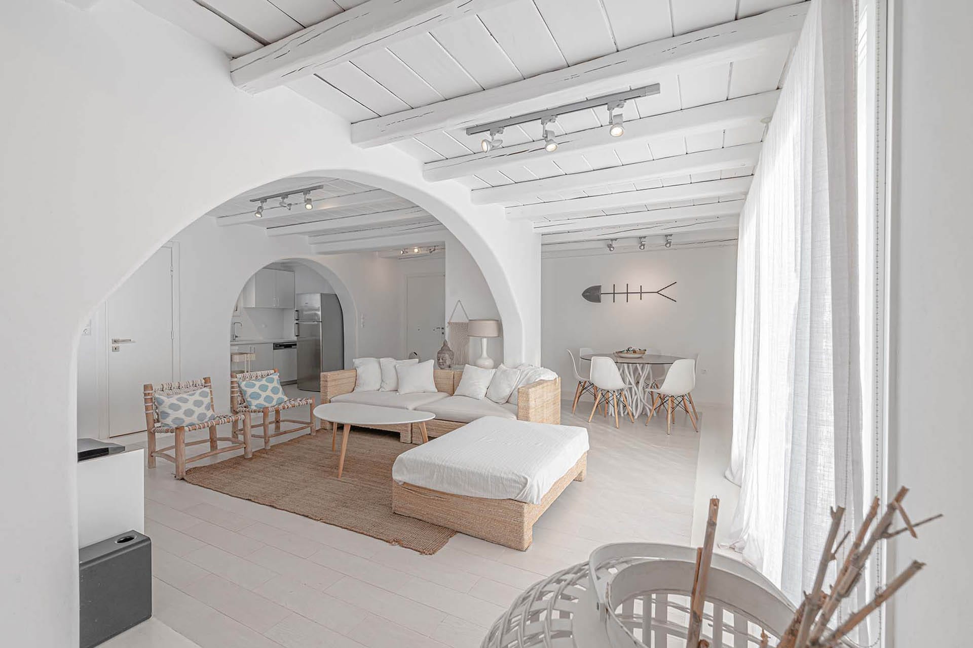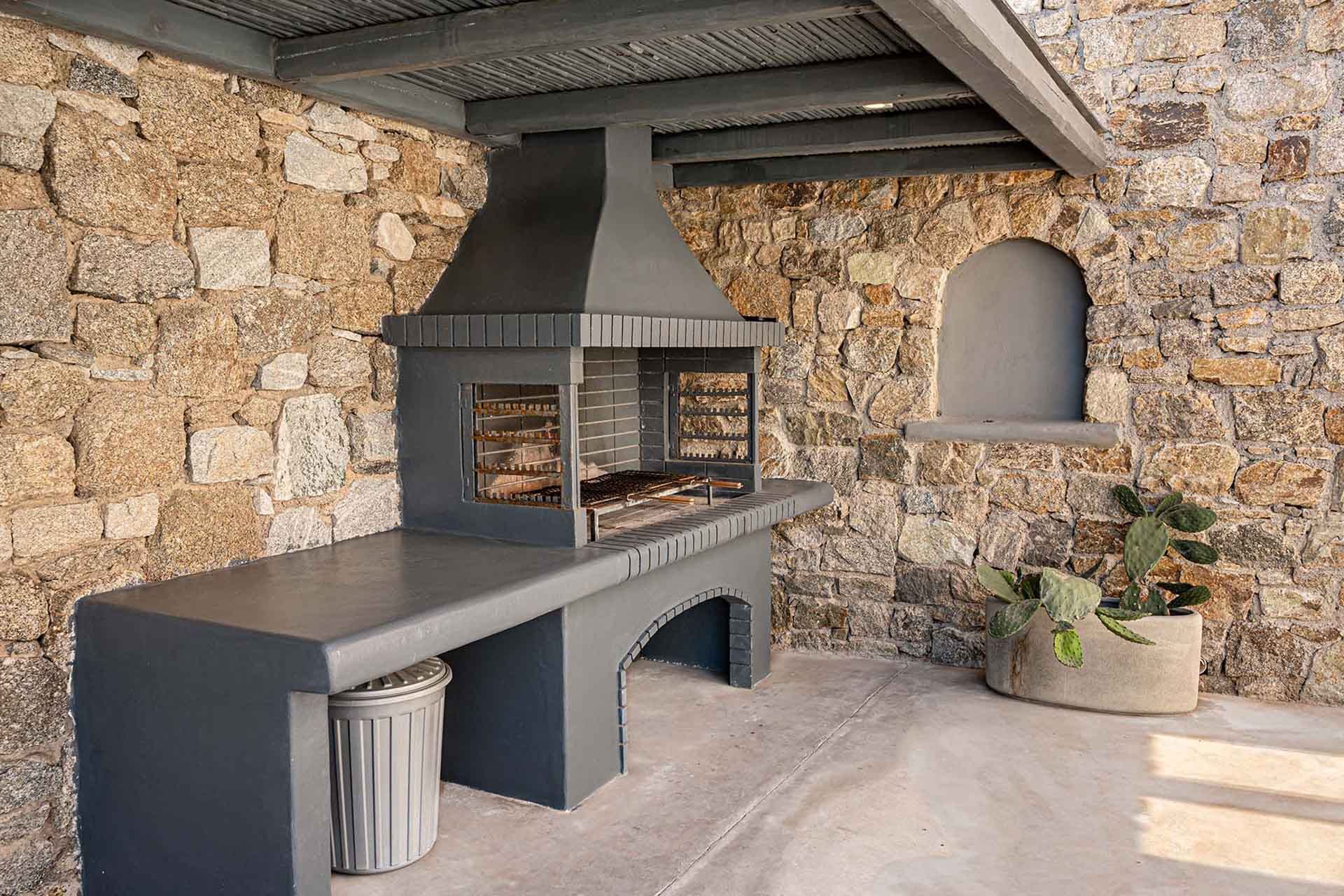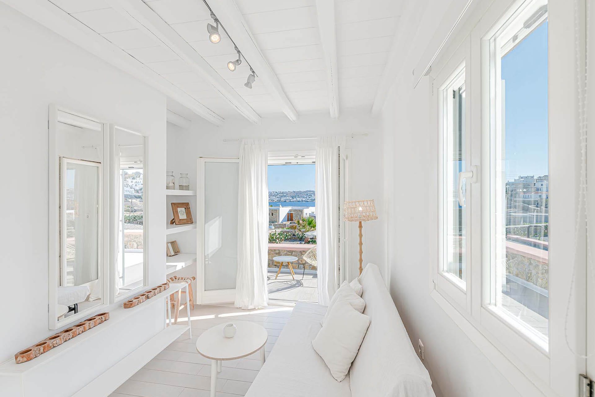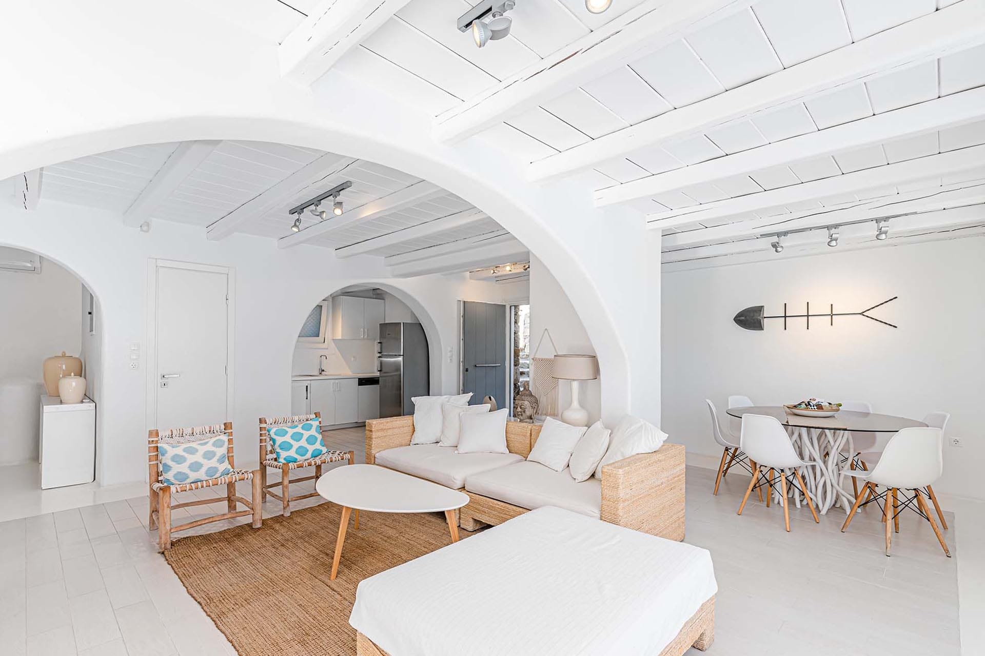 Aeneas is a wind-sheltered villa in Kanalia for up to 6 guests, with wide Aegean views reaching towards Mykonos Town. It’s well placed—about 4.8 km from town and a 5-minute drive to Korfos Beach. Outdoors, a private terrace wraps around a saltwater pool, with umbrella-shaded loungers, a pergola, and a wood-fired BBQ with alfresco dining for long meals. Indoors stays calm and Cycladic-inspired in neutral tones, with beamed ceilings, an open-plan living/dining area and a fully equipped kitchen. Sleeping includes two en-suite queen bedrooms in the main house plus a separate guesthouse double for extra privacy, and there’s also a gym. Baby equipment is available.