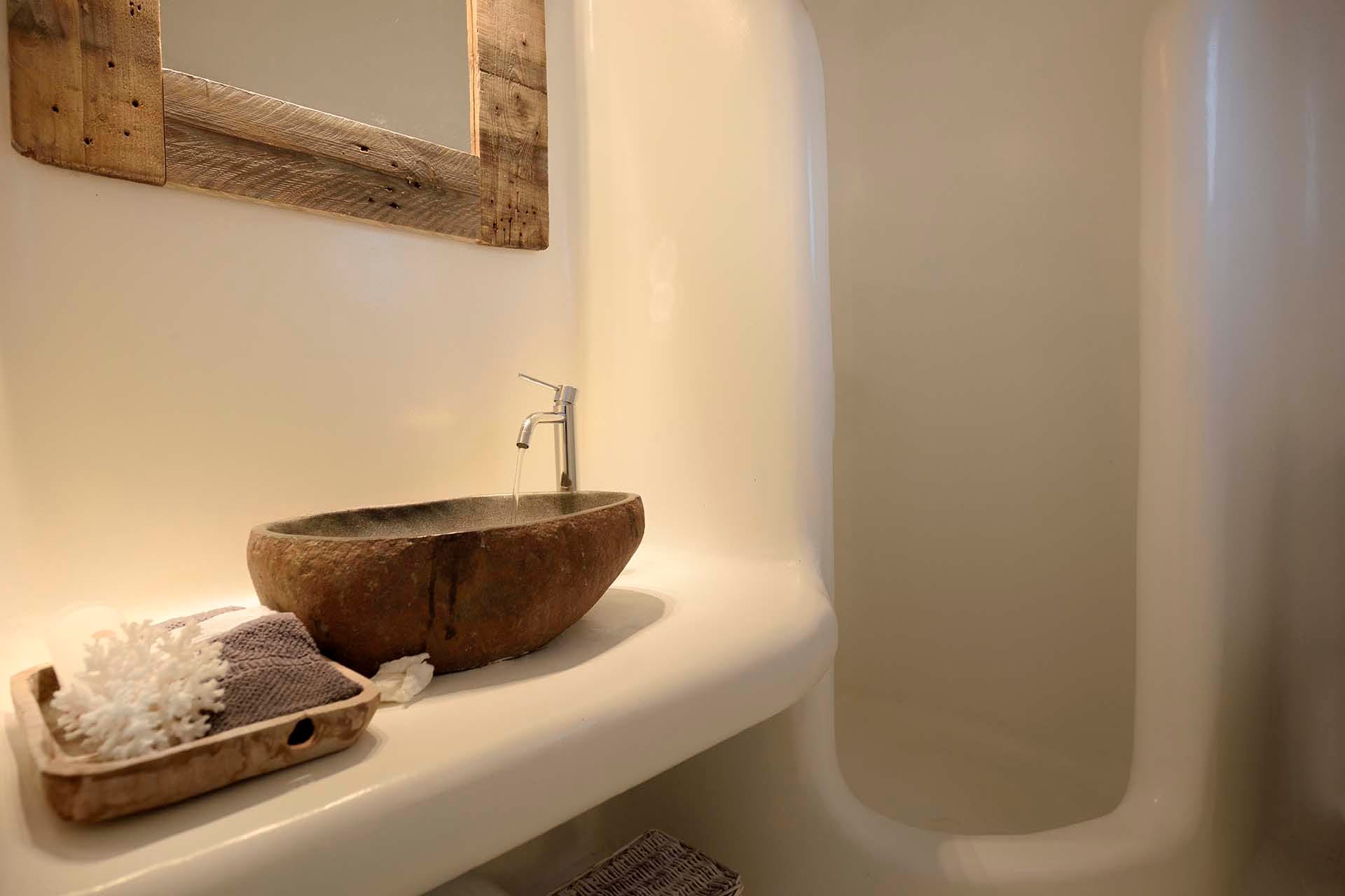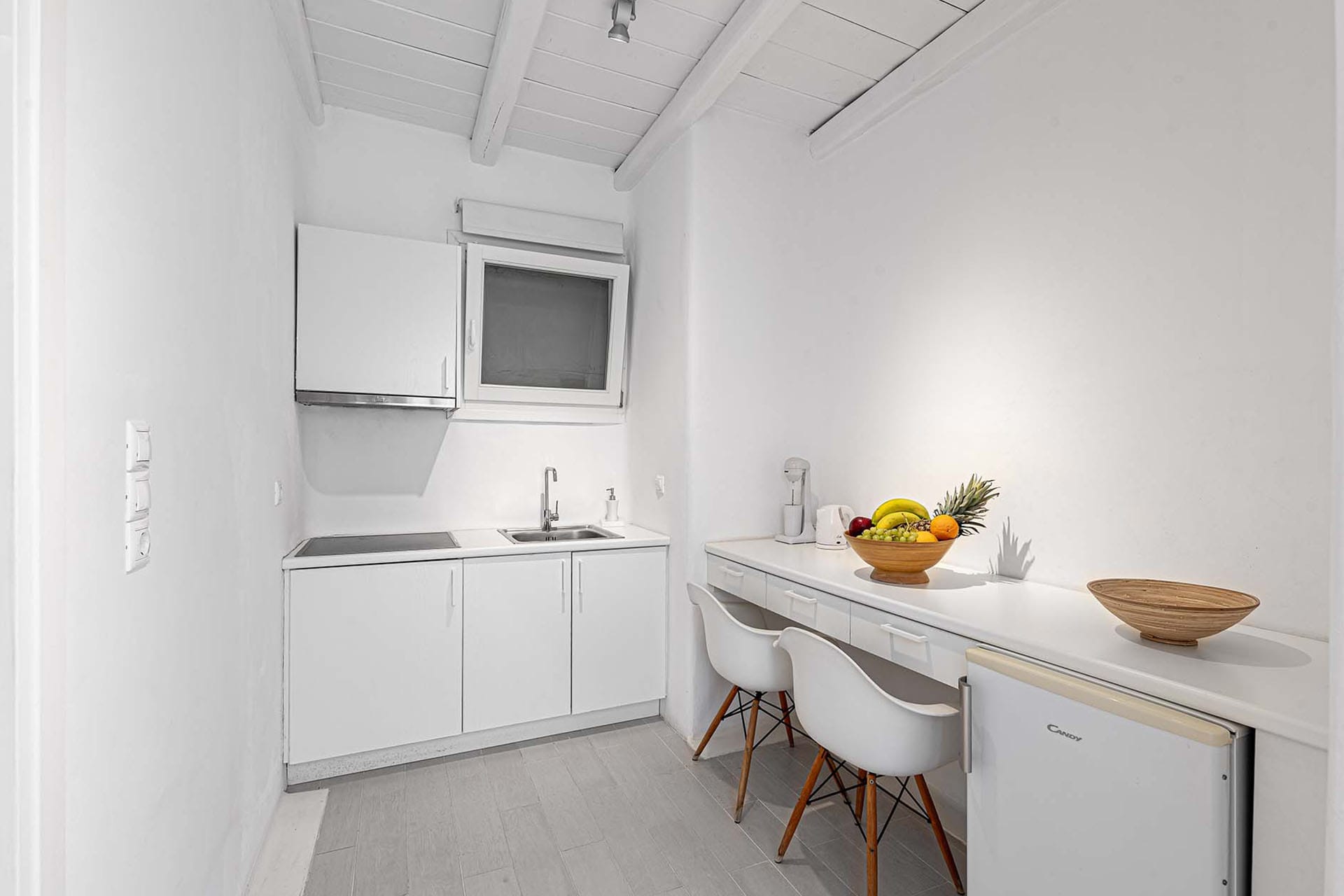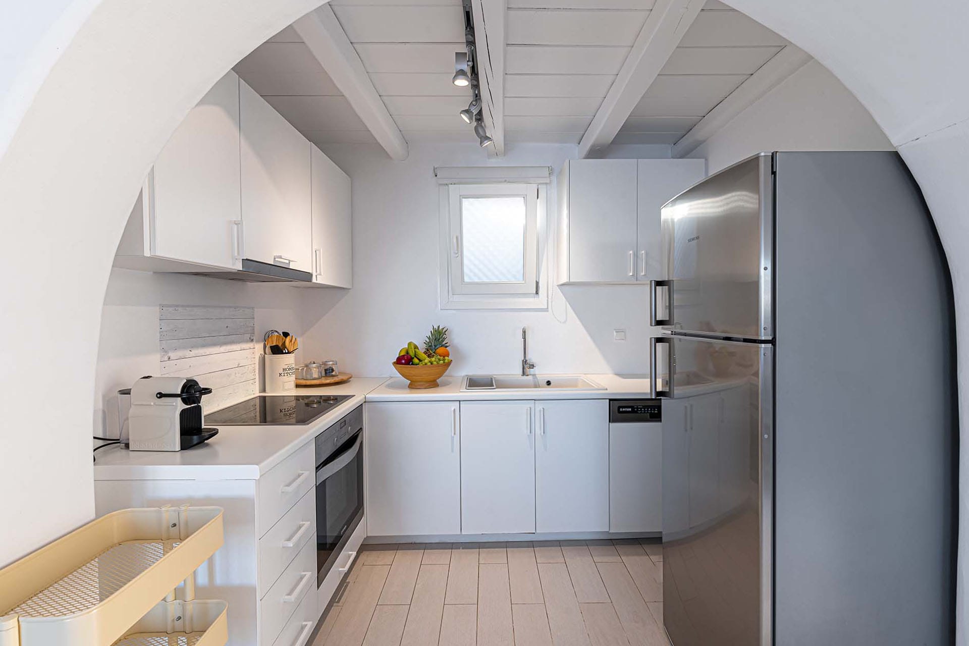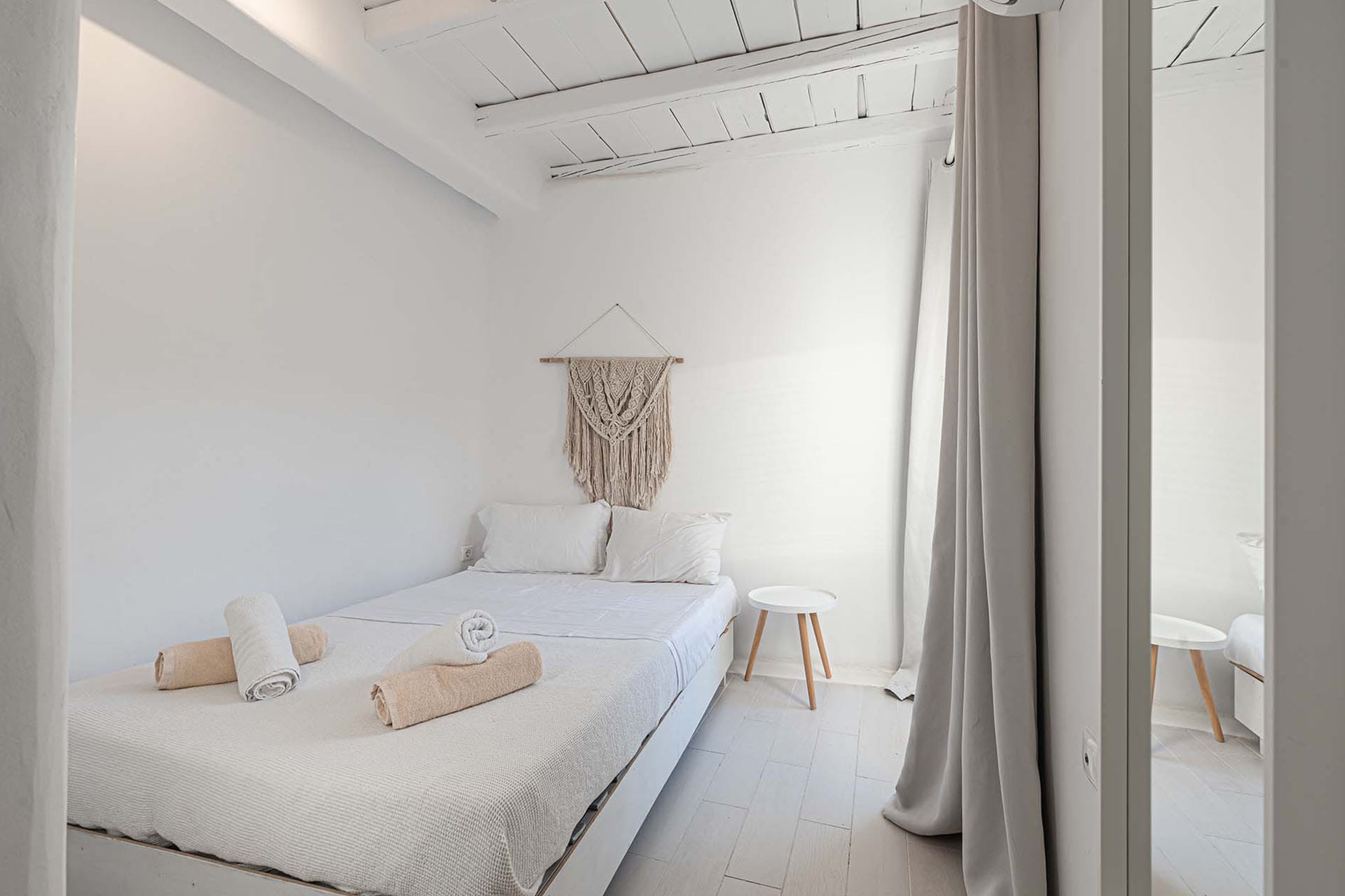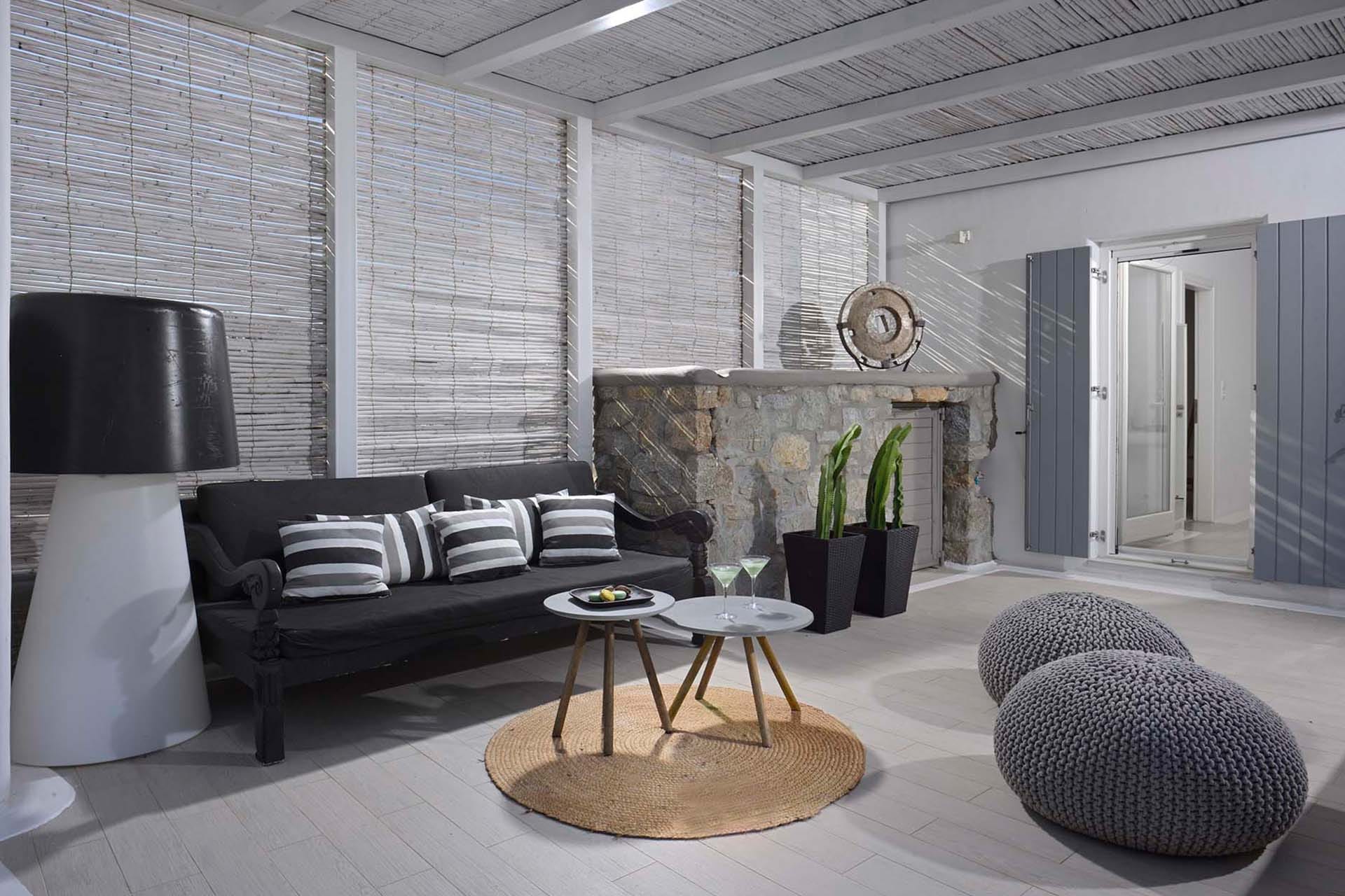 Aeneas is a wind-sheltered villa in Kanalia for up to 6 guests, with wide Aegean views reaching towards Mykonos Town. It’s well placed—about 4.8 km from town and a 5-minute drive to Korfos Beach. Outdoors, a private terrace wraps around a saltwater pool, with umbrella-shaded loungers, a pergola, and a wood-fired BBQ with alfresco dining for long meals. Indoors stays calm and Cycladic-inspired in neutral tones, with beamed ceilings, an open-plan living/dining area and a fully equipped kitchen. Sleeping includes two en-suite queen bedrooms in the main house plus a separate guesthouse double for extra privacy, and there’s also a gym. Baby equipment is available.