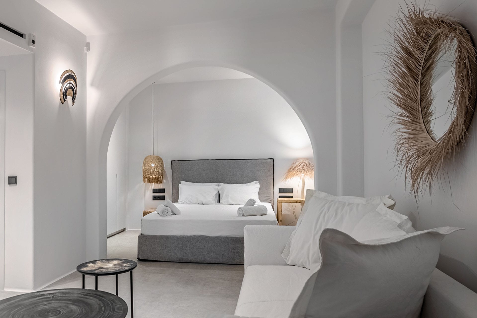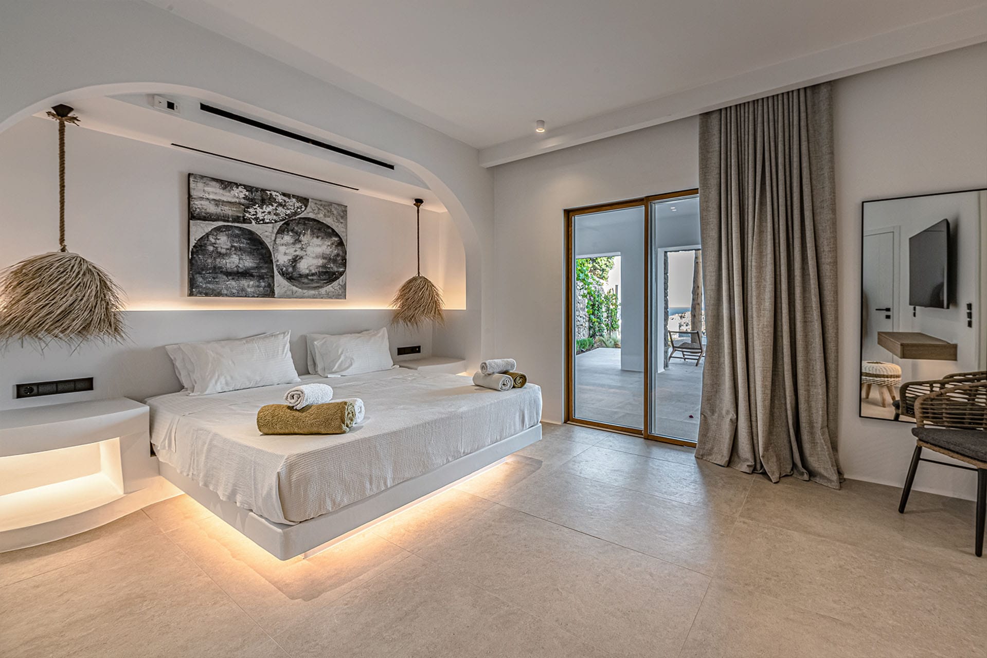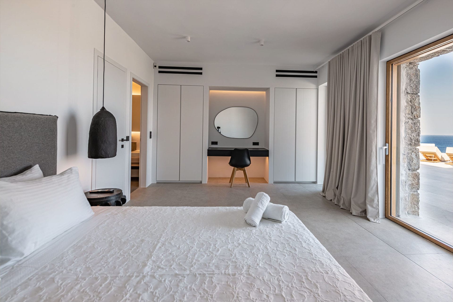 Perched in Aleomandra, just 200 meters from the beach, Bluebell is a stylish retreat designed for effortless island living. Hosting up to 12 guests in six ensuite bedrooms—five in the main villa and one in a private guest house—it offers smart TVs, A/C, and elegant bathrooms throughout. Upstairs, an open-plan living room and sleek kitchen bathe in Mykonian light. Outdoors, a heated pool, jacuzzi, pergola lounges, BBQ, and pool bar set the laid-back tone, while the gym equipment and the charming private chapel round out this luxury retreat.