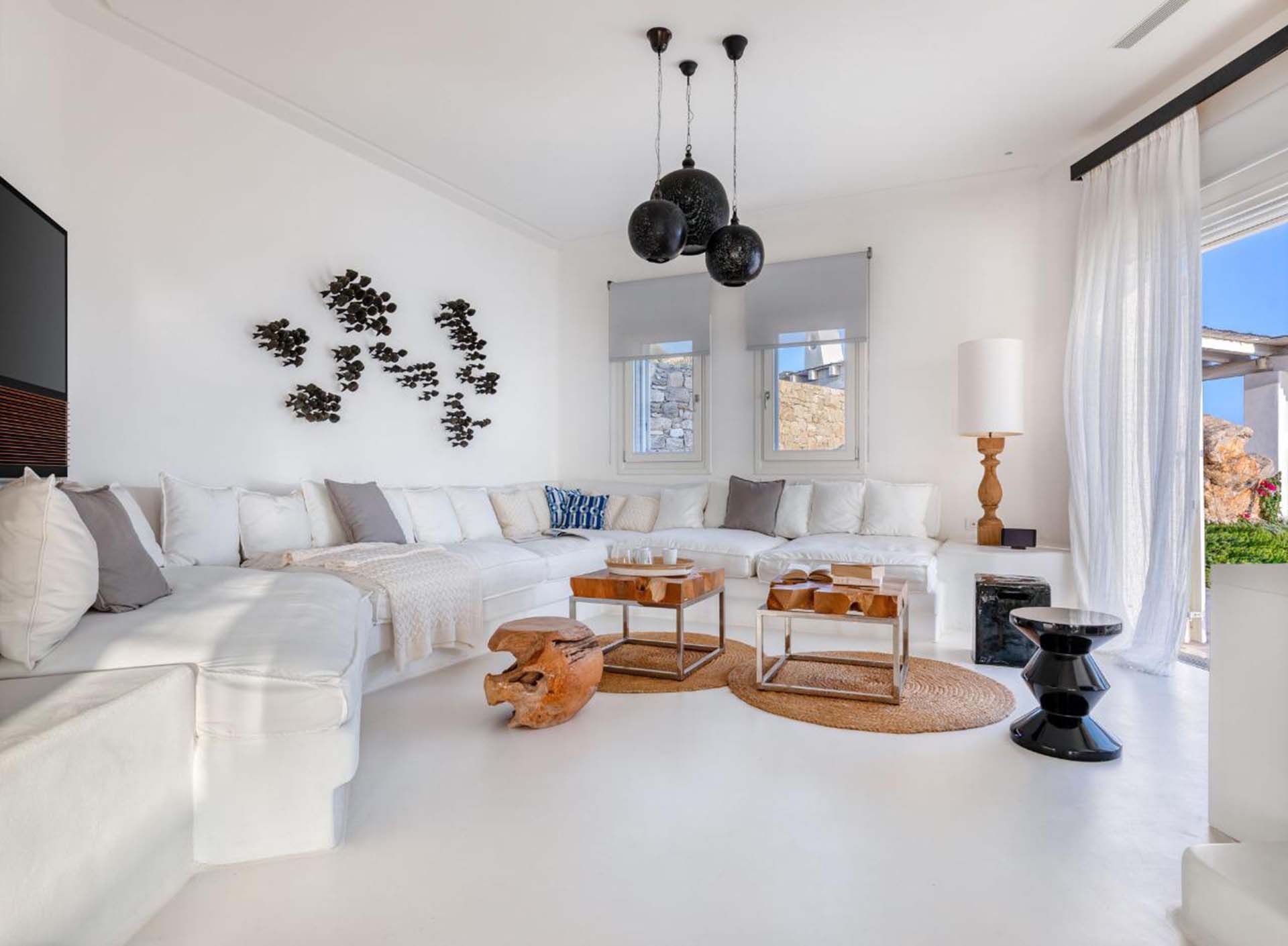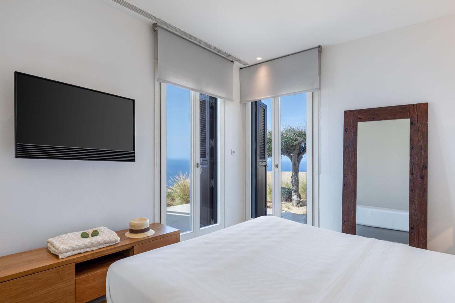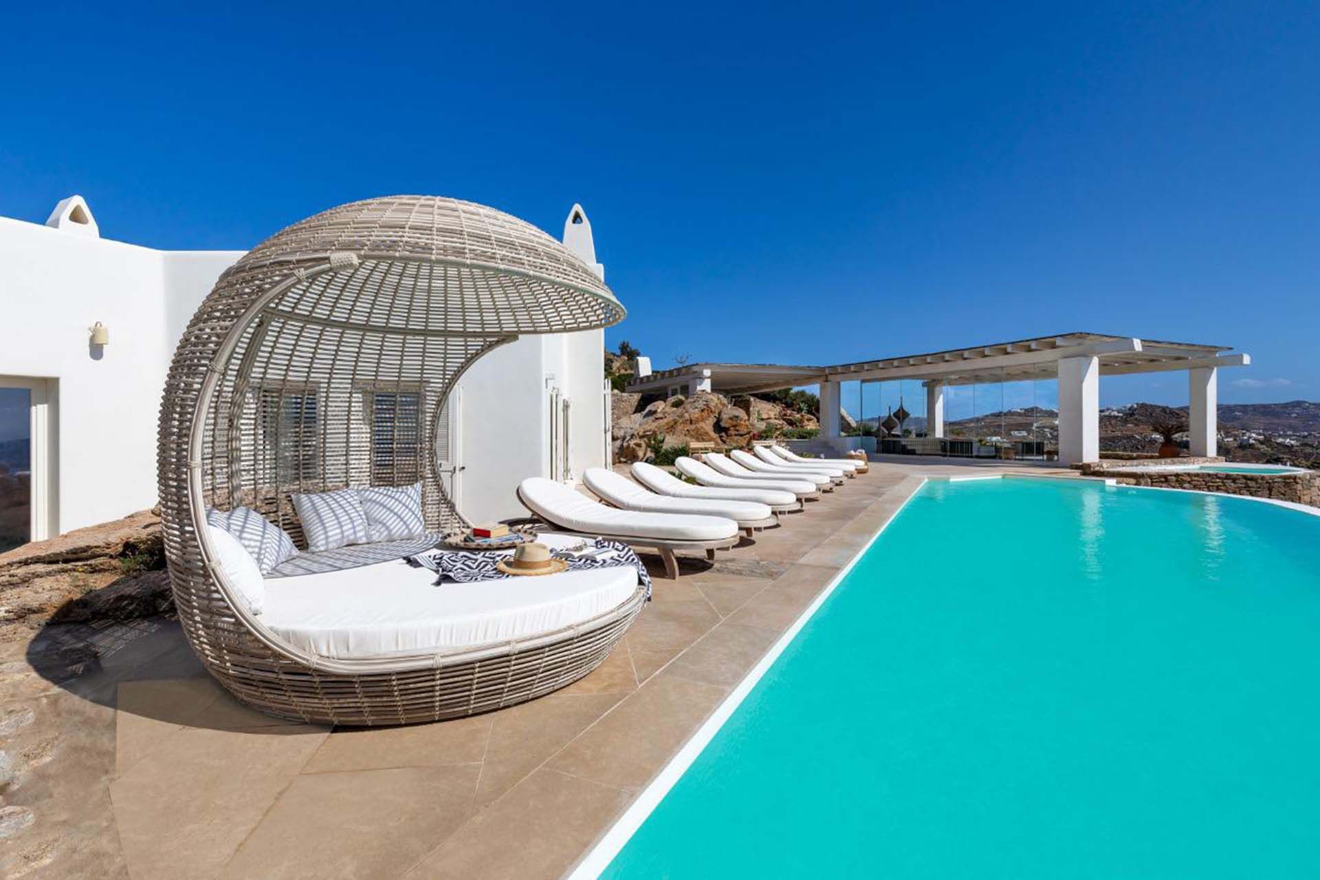 Delphine works well for guests who value simplicity and light: six en-suite bedrooms, whitewashed living areas, and multiple nooks that draw attention to the view. The layout provides plenty of room to relax and mingle. The heated pool and jacuzzi act as focal points, surrounded by shaded dining and casual lounges for long, unhurried afternoons. Practical extras, including a helipad and private parking, make arrivals simple, while Agios Stefanos beach and Mykonos Town are within easy reach for swimming, dining, and evening strolls.