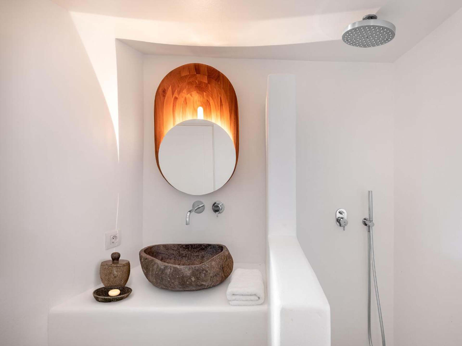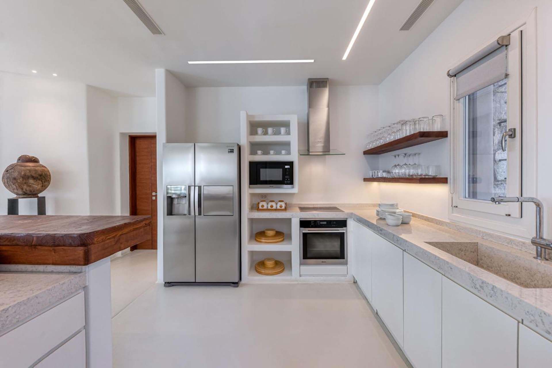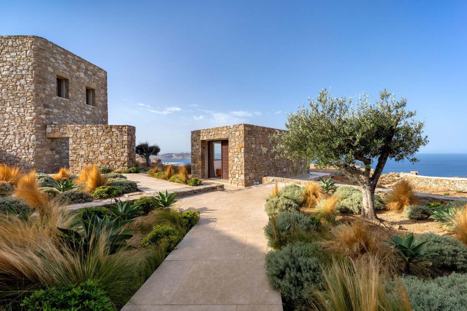Delphine works well for guests who value simplicity and light: six en-suite bedrooms, whitewashed living areas, and multiple nooks that draw attention to the view. The layout provides plenty of room to relax and mingle. The heated pool and jacuzzi act as focal points, surrounded by shaded dining and casual lounges for long, unhurried afternoons. Practical extras, including a helipad and private parking, make arrivals simple, while Agios Stefanos beach and Mykonos Town are within easy reach for swimming, dining, and evening strolls.