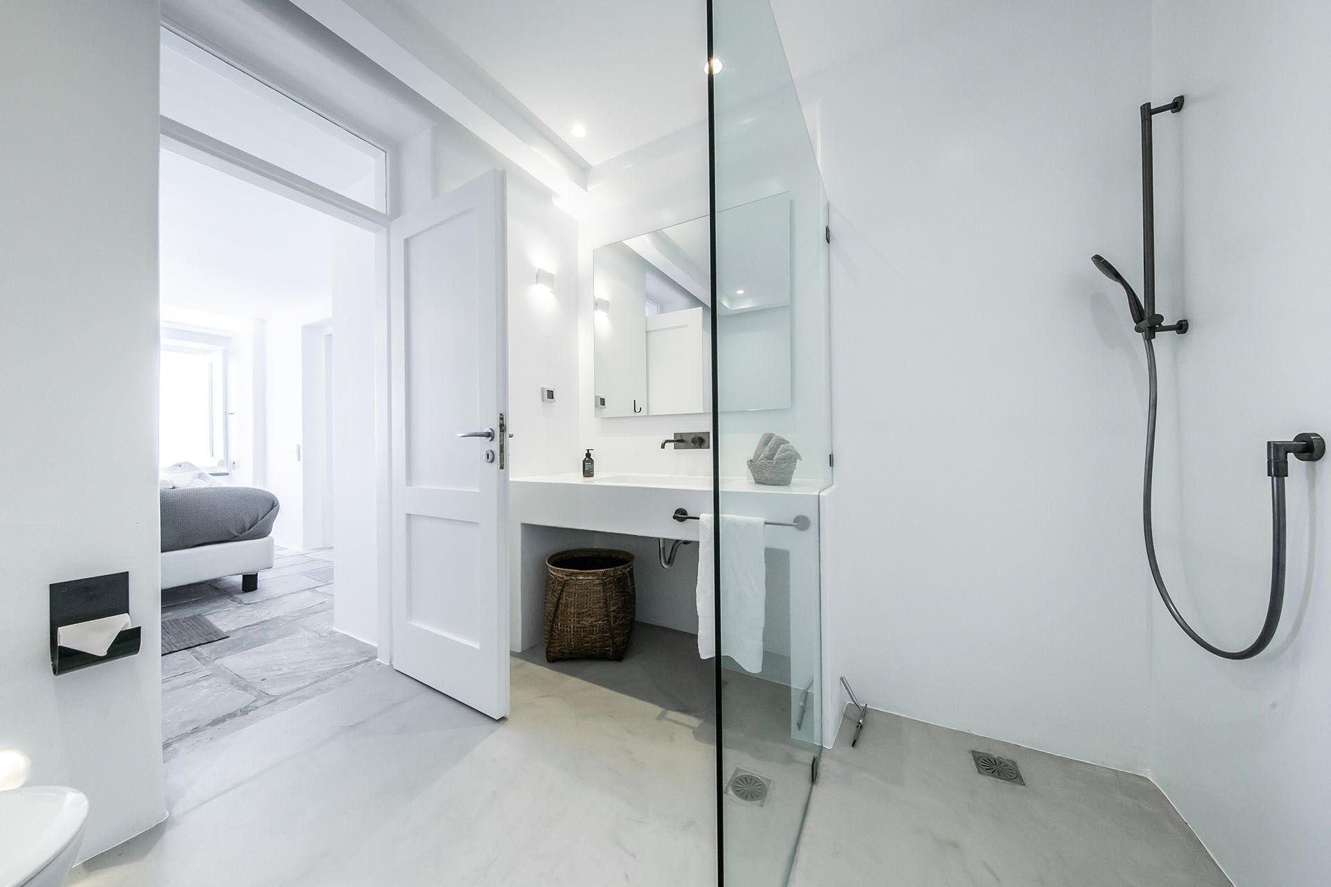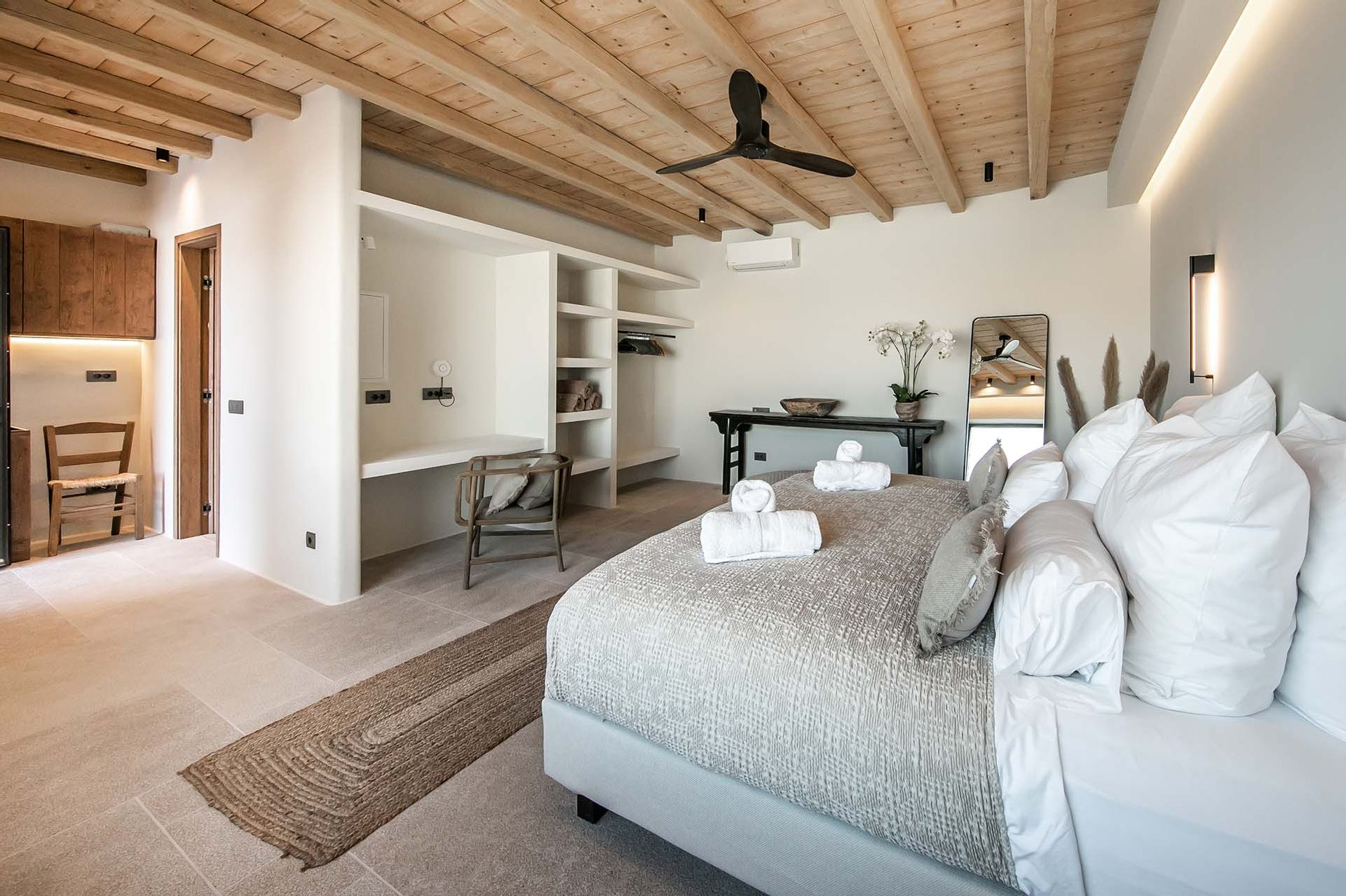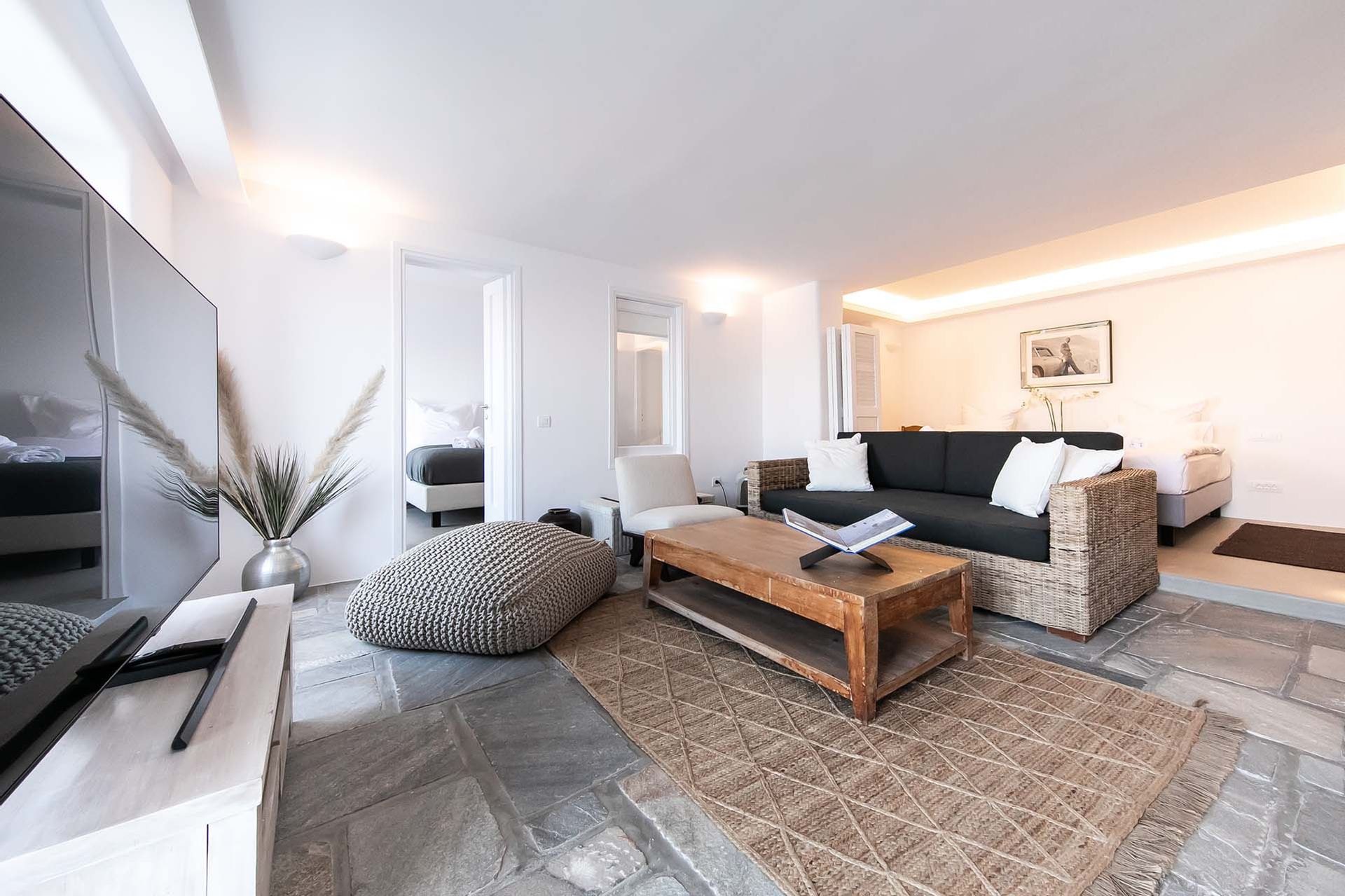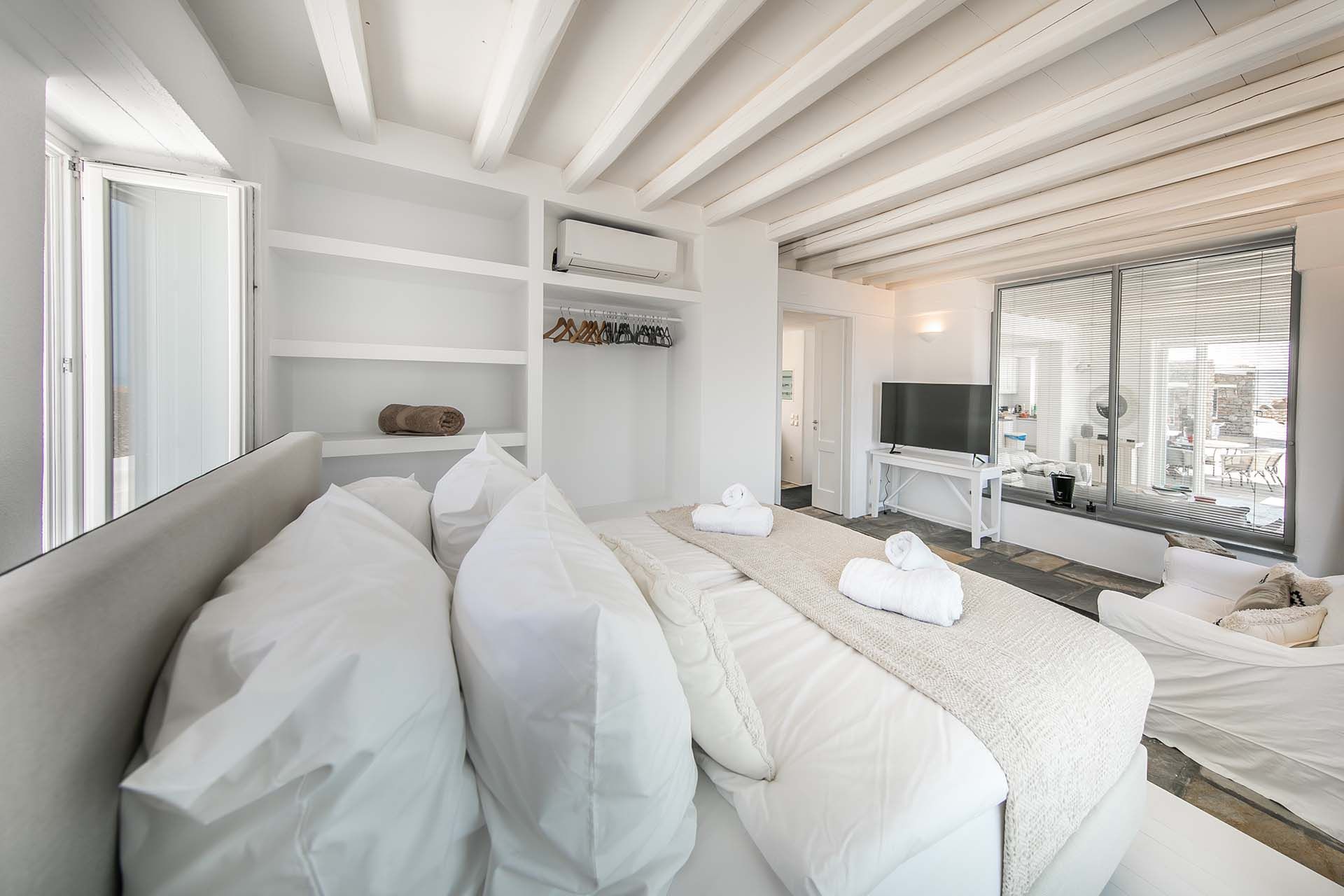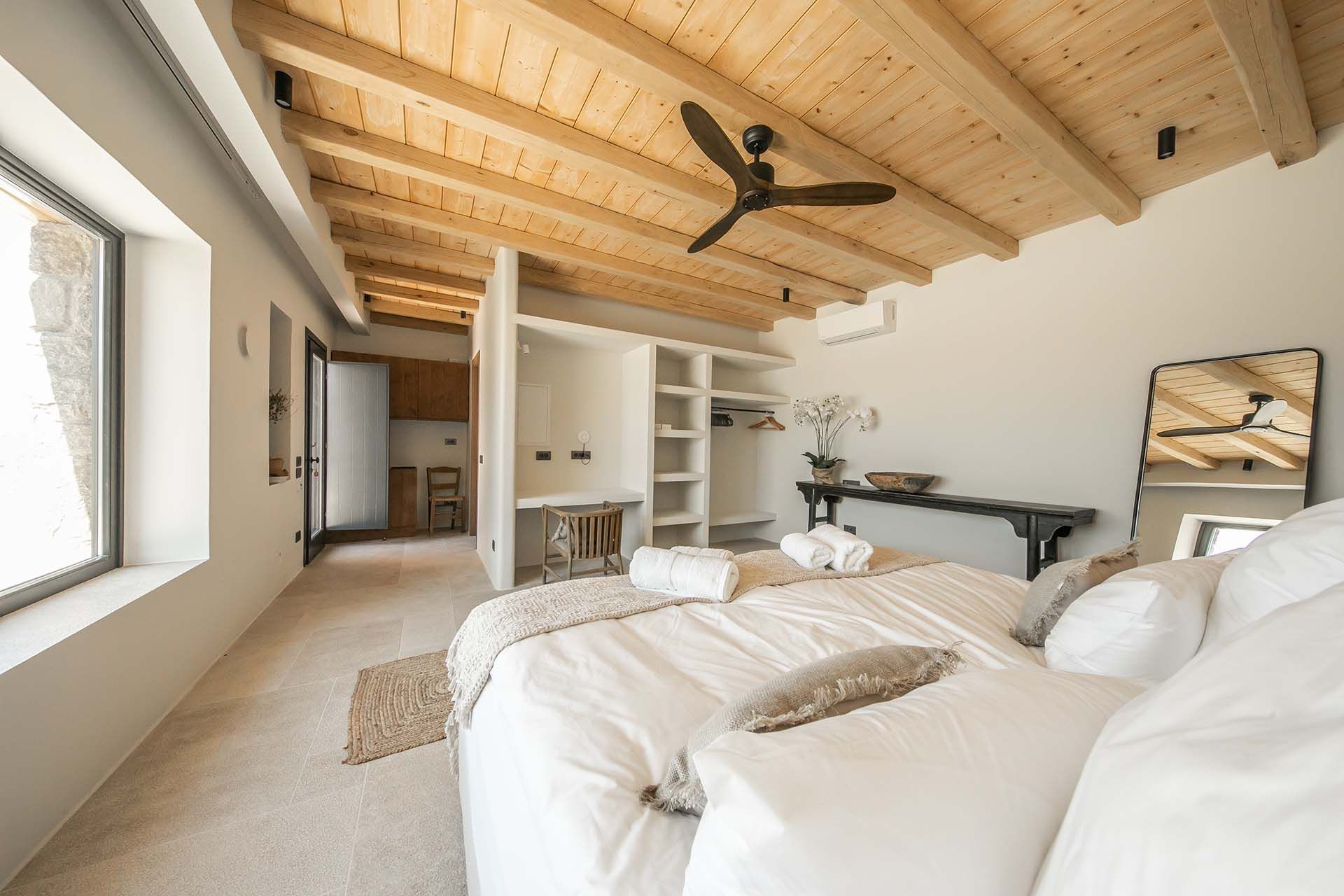 Destiny’s design is modern and uncluttered. Nine suites spread over two villas in Ftelia, with contemporary art and neutral palettes that never compete with the sea views. Outdoors include a main pool (heatable on request), a pool bar, a quieter plunge pool, a BBQ, and a sound system—arrangements that suit both lively gatherings and wellness retreats. A poolside annex with an indoor dining room for fourteen makes local food tastings effortless, and when you crave a change of pace, Alemagou’s beach bar is a short drive away.