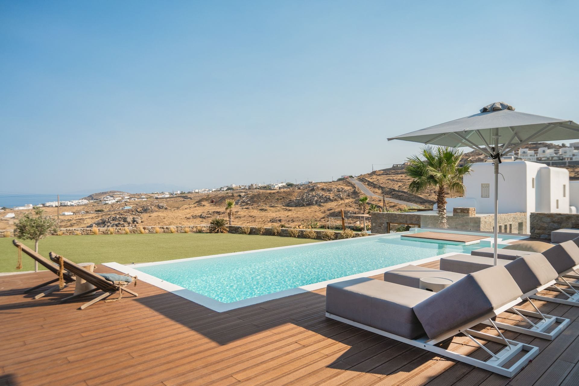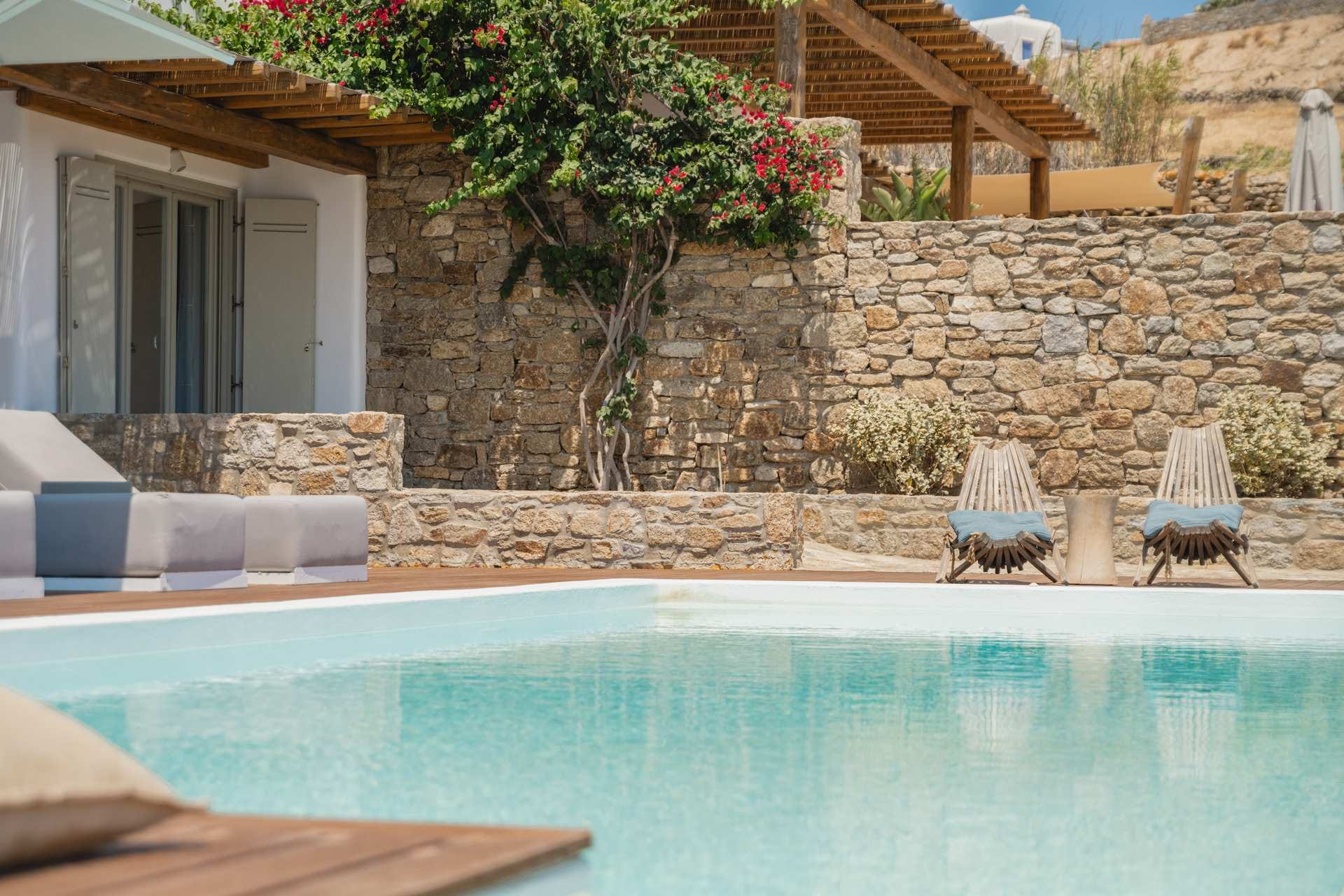 Villa Silk is a large, contemporary estate in Kalafatis, Mykonos, designed for multi-generational stays and big groups. Two neighbouring villas host up to 22 guests across eleven ensuite bedrooms, with flexible layouts that suit families and friends alike. Outdoors, two private pools, a heated jacuzzi, pool bar, BBQ stations, and shaded dining areas support easygoing days al fresco. Close to sandy beaches and a short drive from Mykonos Town, the estate is also pet-friendly on request, offers private parking, and full concierge support.