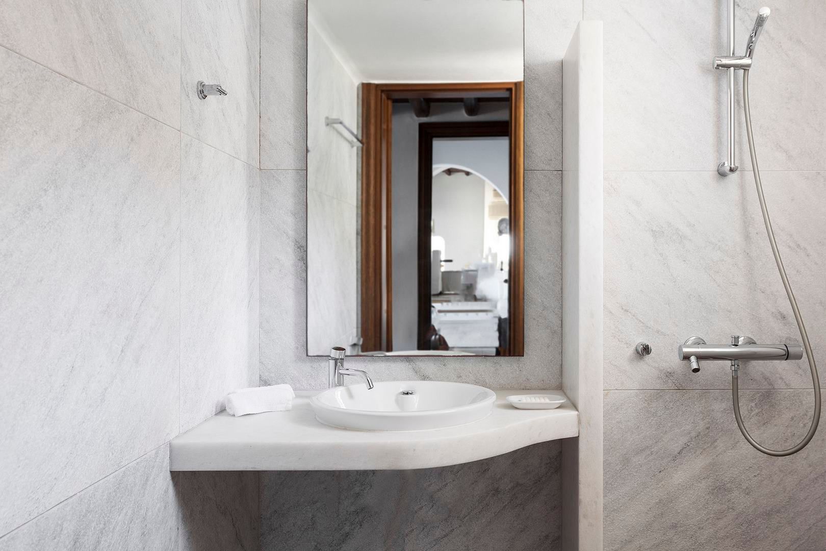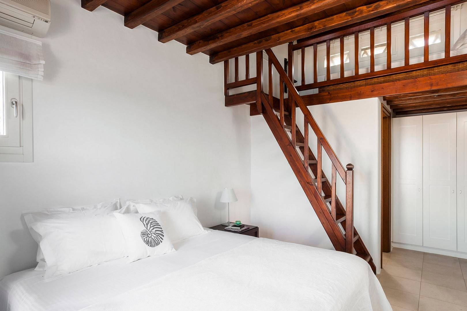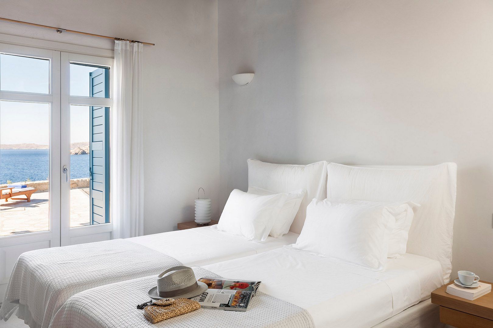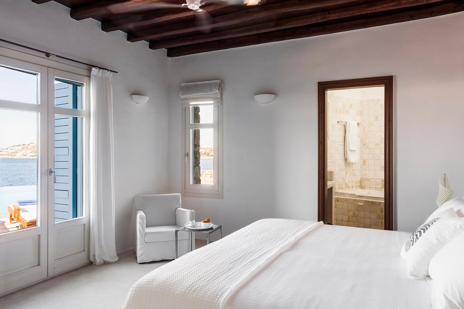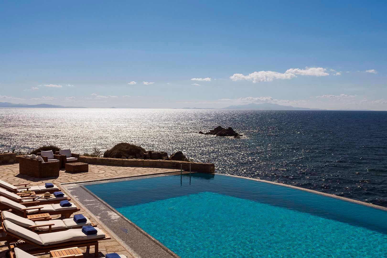 Villa Lugano is set on a wind-protected rock above Agios Lazaros Bay, with uninterrupted sea views stretching to Paros and Naxos. It hosts up to 11 guests and keeps you close to the island’s energy without losing calm—Mykonos Town is around 5 km away and Psarou is about a 10-minute drive. Outdoors, an infinity pool anchors the terrace, supported by elegant lounge areas, Mediterranean planting, several outdoor dining spots and a BBQ for easy alfresco meals. Inside, the mood is bright and understated with white walls, wooden ceilings and a fully equipped kitchen. Bedrooms are designed for rest, offering king-size beds, en-suite bathrooms and sea-view windows. A rock-carved staircase leads down to a quiet rocky dock with sunbeds for sea swims.