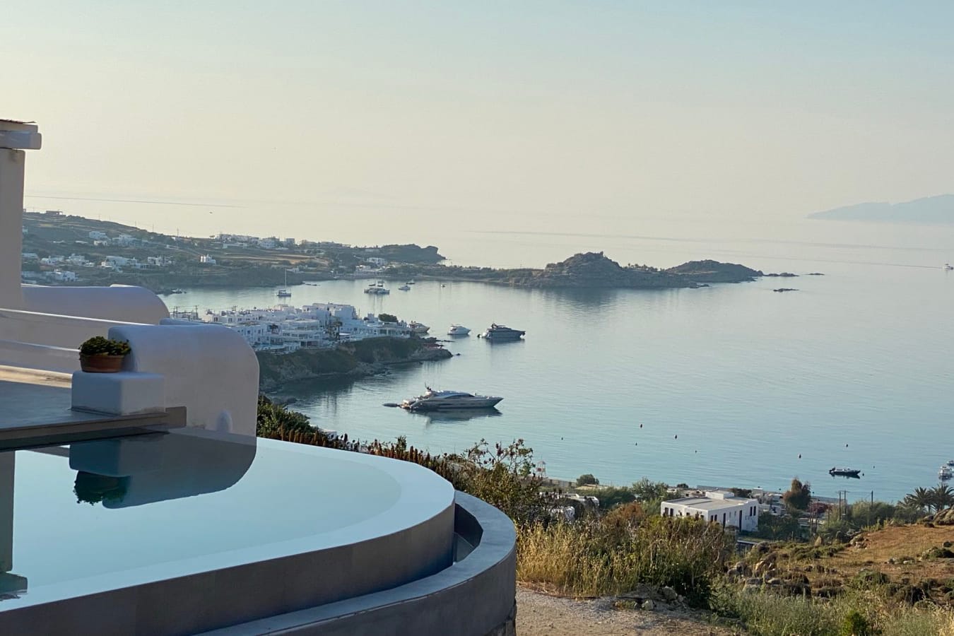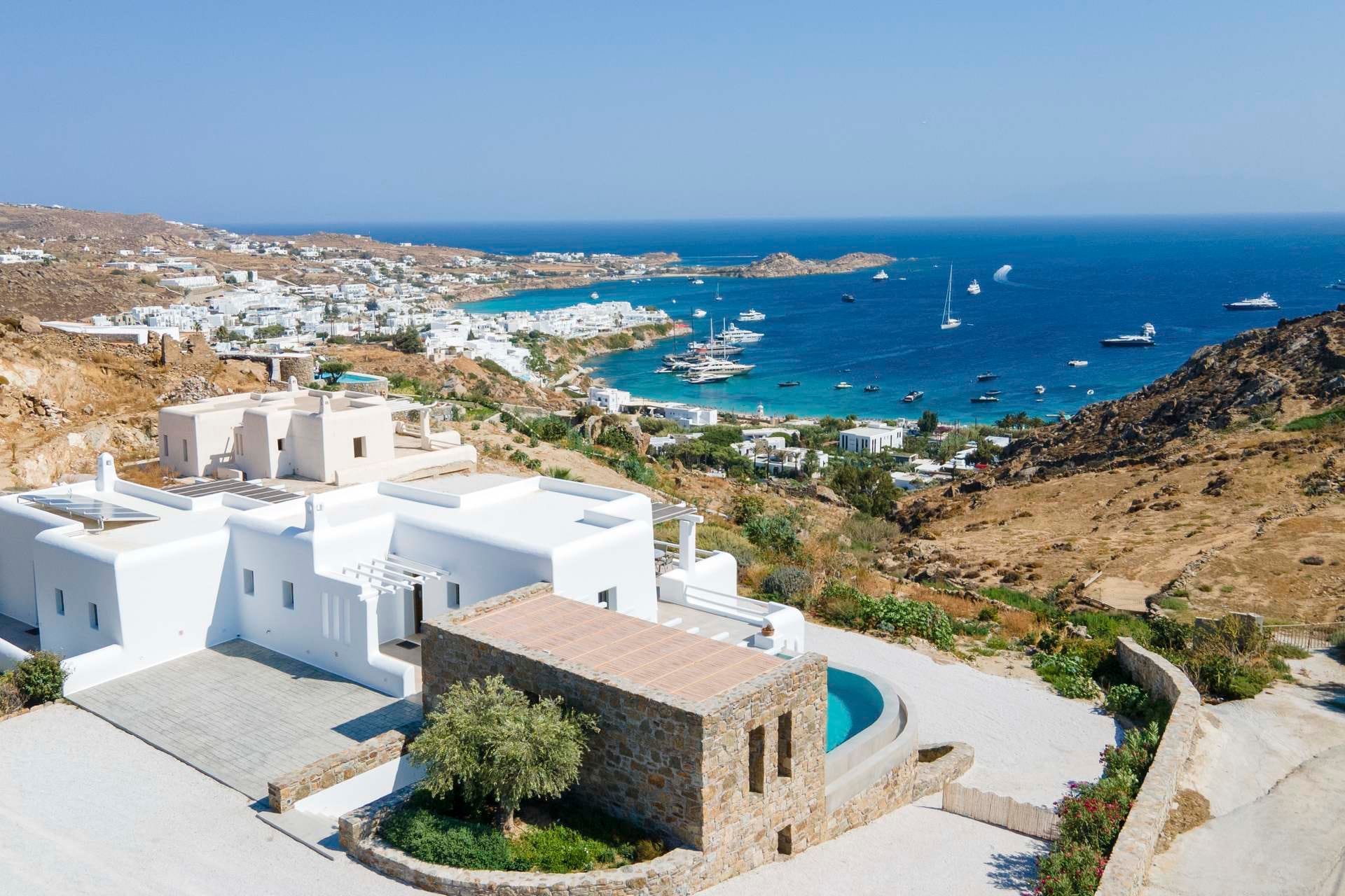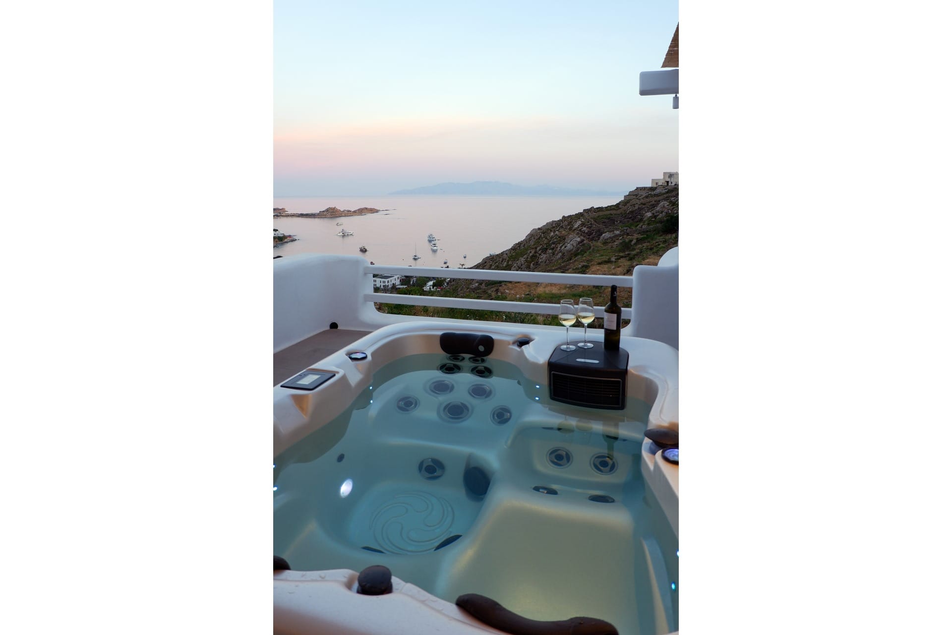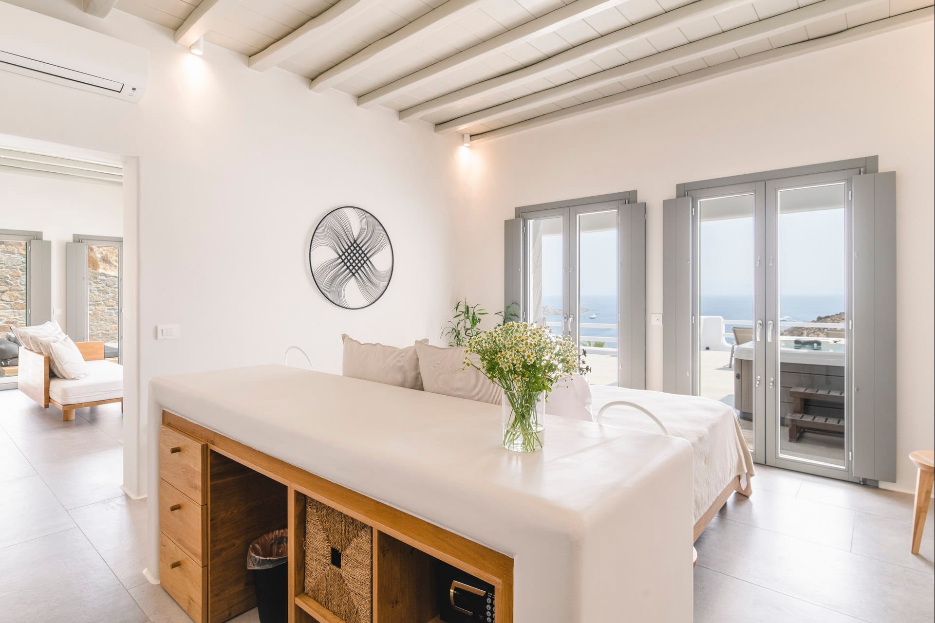 Marshmallow is an intimate Psarou hideaway made up of two cozy villas for a total of 6 guests. The focus is firmly on outdoor living: two infinity pools at the terrace edge, two open-air jacuzzis, loungers, and shaded dining corners that catch the breeze and the view. Indoors, light-filled rooms, minimal Cycladic touches, and three sea-view bedrooms keep things easy and unfussy. With Nammos and Mykonos Town a short drive away, it balances seclusion with easy access to the hotspots.