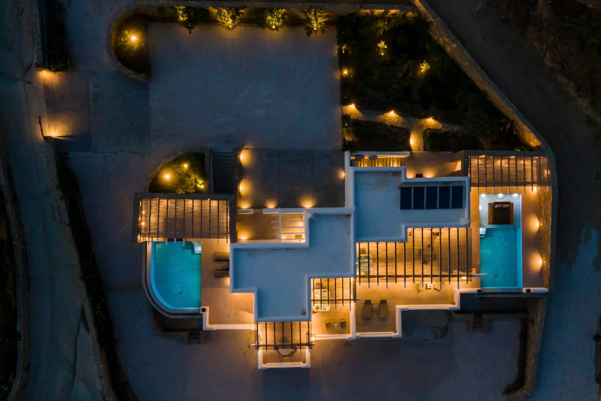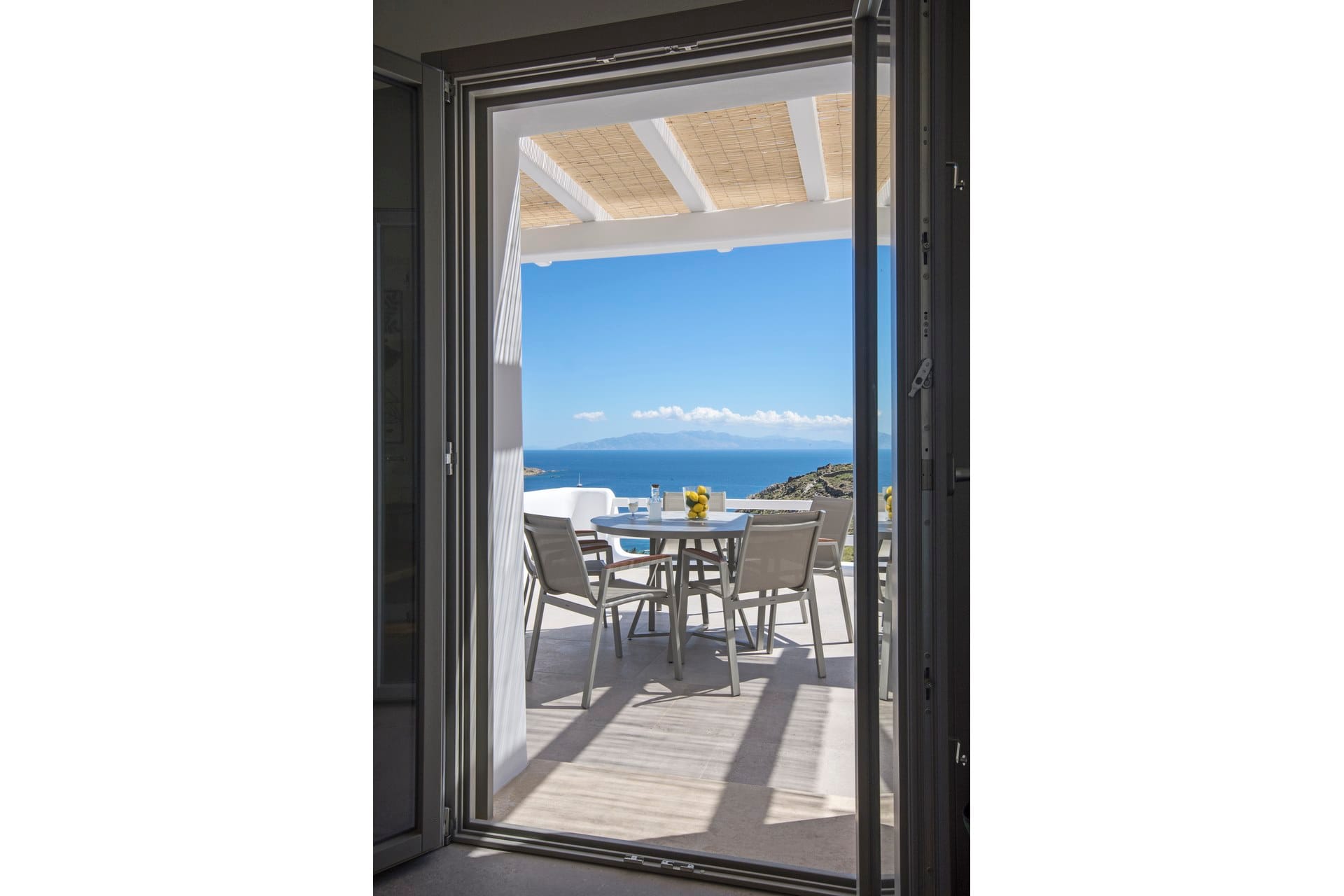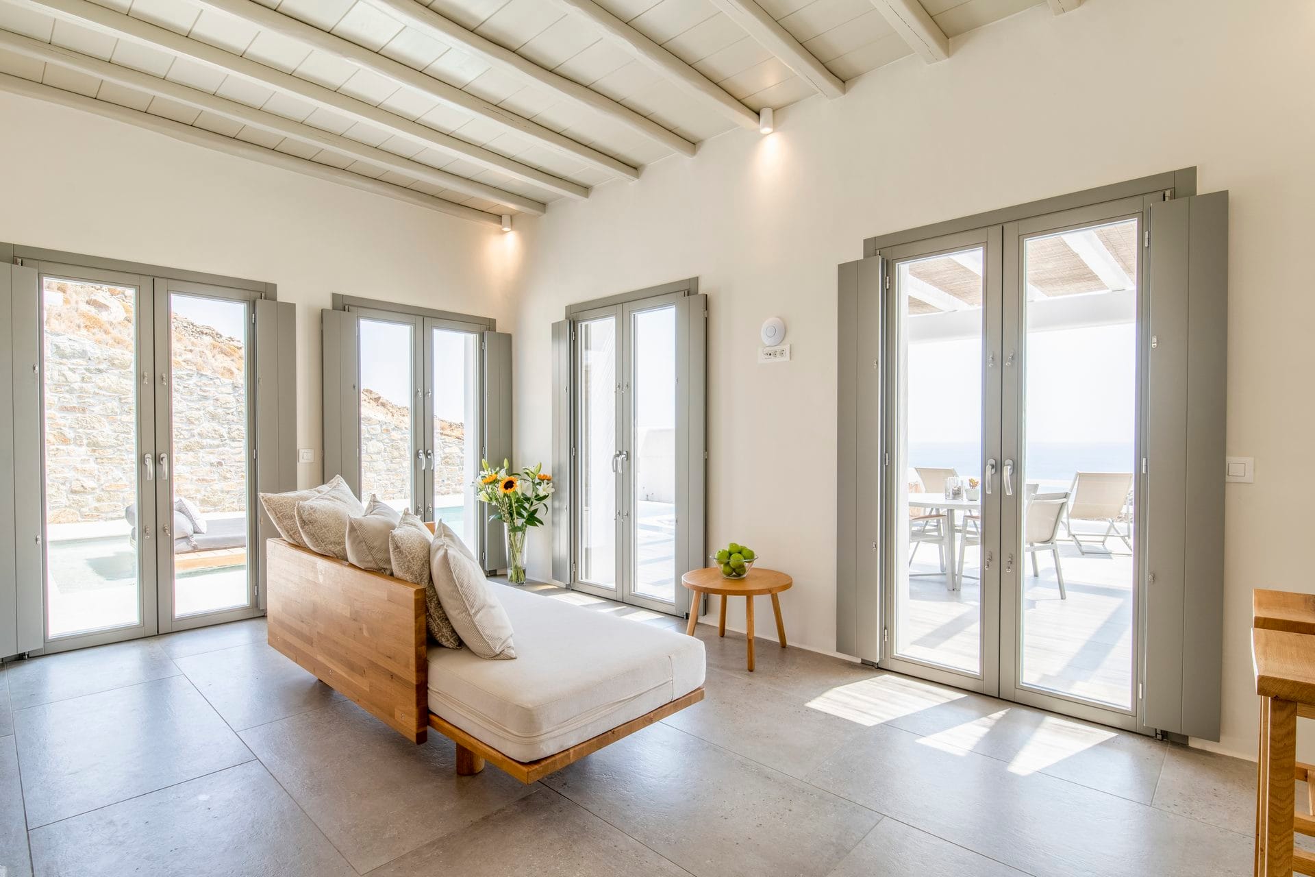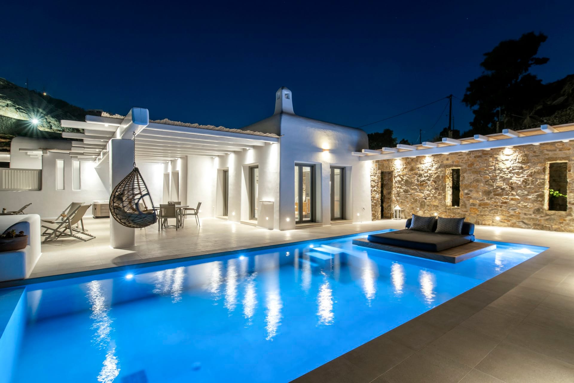 Marshmallow is an intimate Psarou hideaway made up of two cozy villas for a total of 6 guests. The focus is firmly on outdoor living: two infinity pools at the terrace edge, two open-air jacuzzis, loungers, and shaded dining corners that catch the breeze and the view. Indoors, light-filled rooms, minimal Cycladic touches, and three sea-view bedrooms keep things easy and unfussy. With Nammos and Mykonos Town a short drive away, it balances seclusion with easy access to the hotspots.