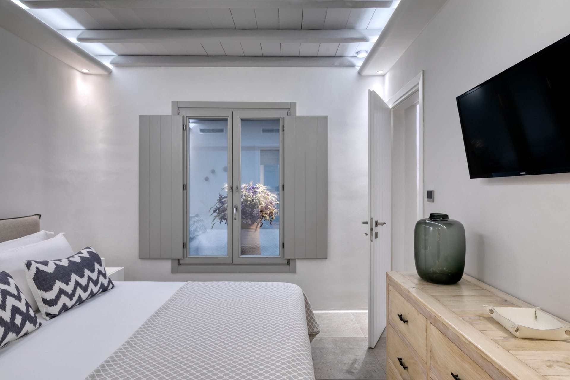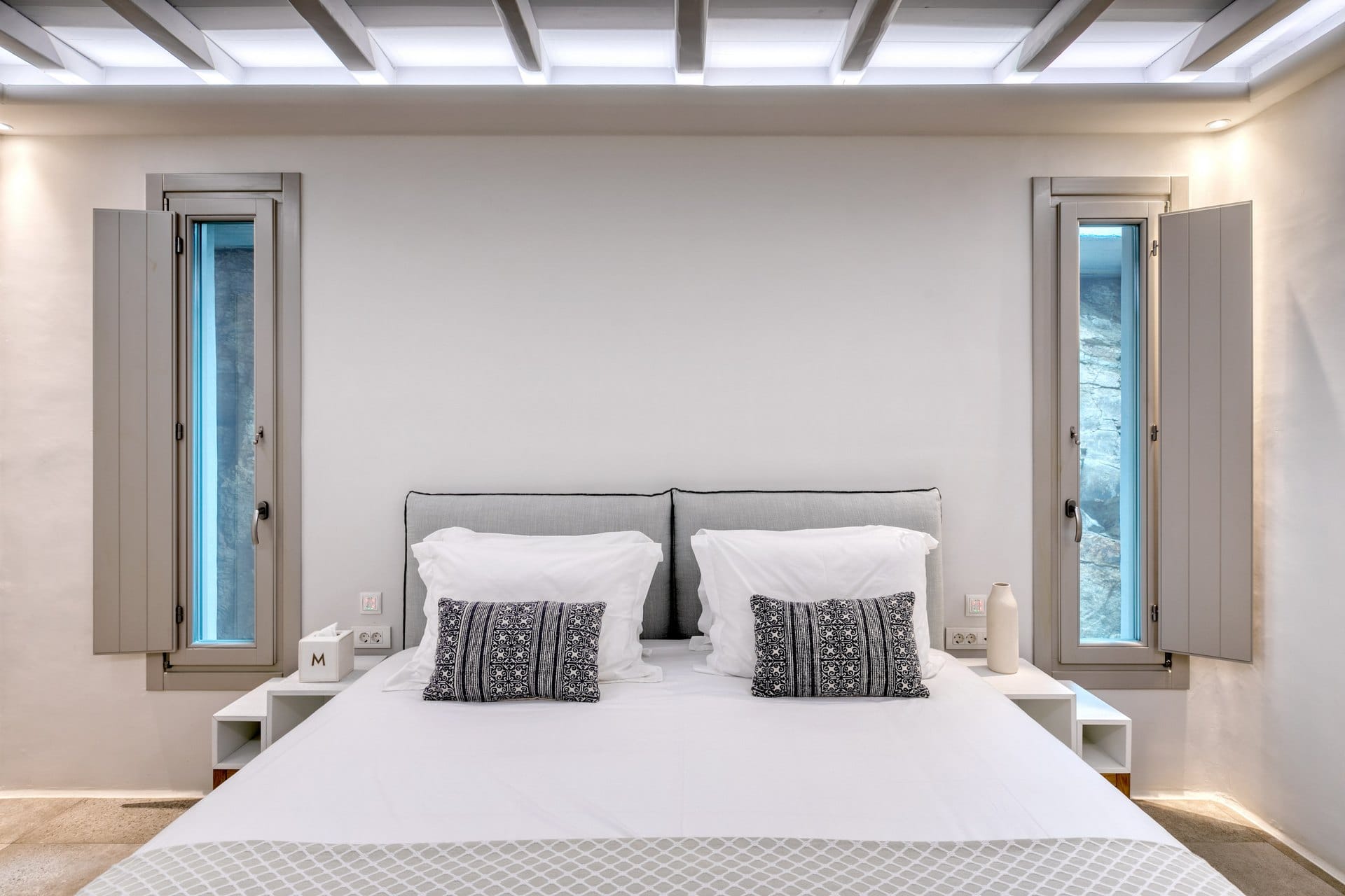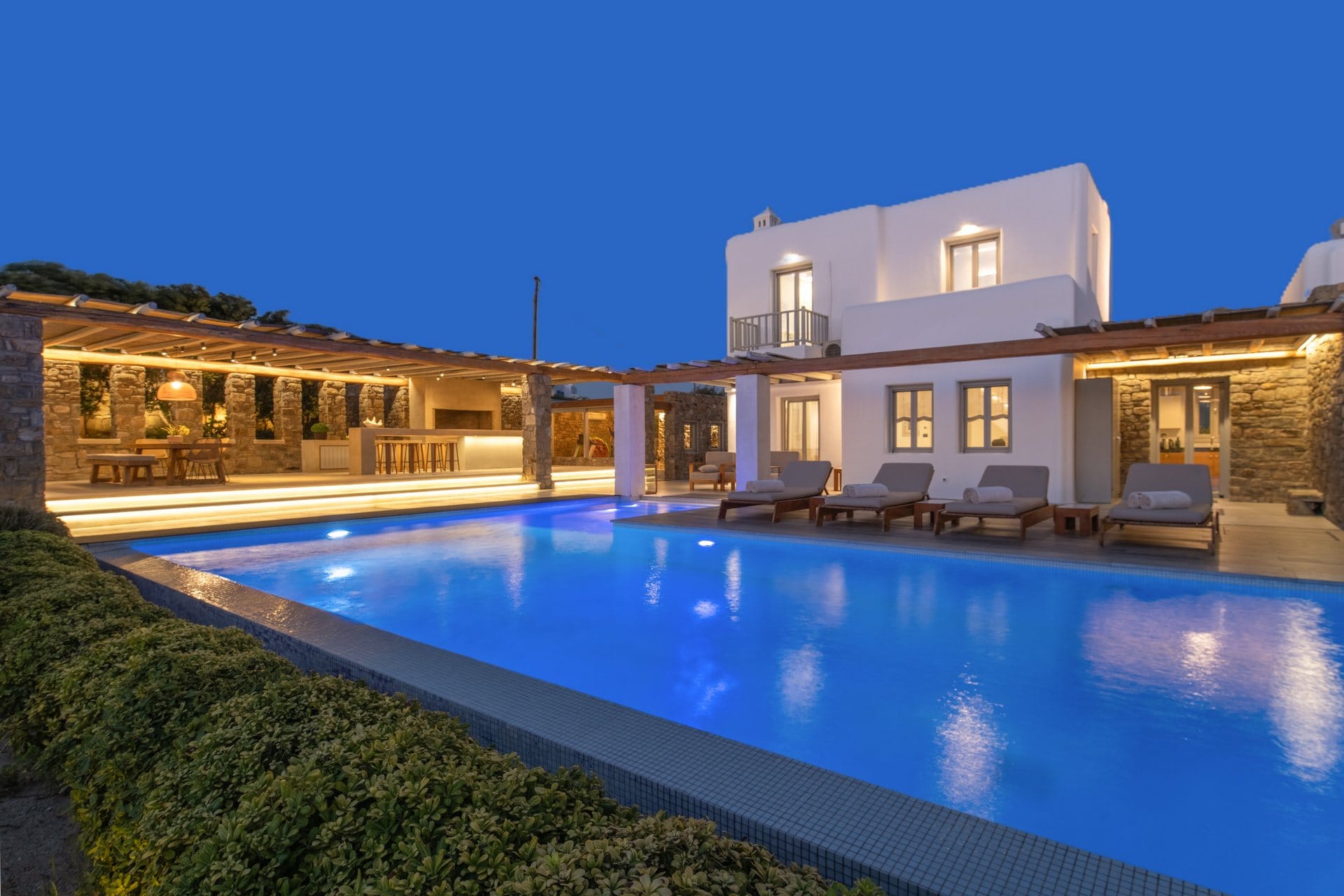 M One is a contemporary villa in Agia Sofia for up to 8 guests, built as a calm family base around 4 km from Mykonos Town. It pairs open Aegean views with a sheltered pool terrace, landscaped gardens and a heated swimming pool for morning dips and late-afternoon lounging. Outdoor dining is set under a large pergola beside the BBQ, keeping meals easy at home. Inside, Cycladic curves and exposed beams sit within a clean white palette and sophisticated minimal style, with a comfortable living/dining area and a fully equipped kitchen. All bedrooms are en-suite, and extra spaces add flexibility—a playroom for kids (or a family hangout) plus a fully equipped private gym outdoors.
