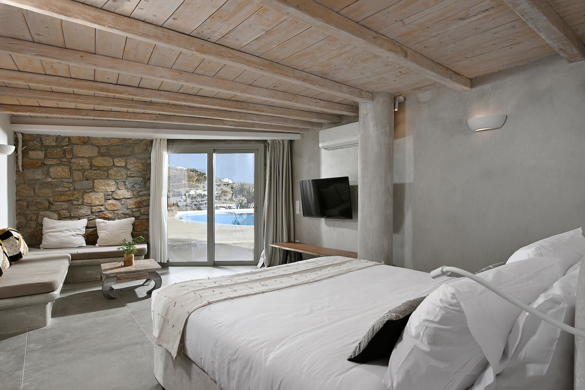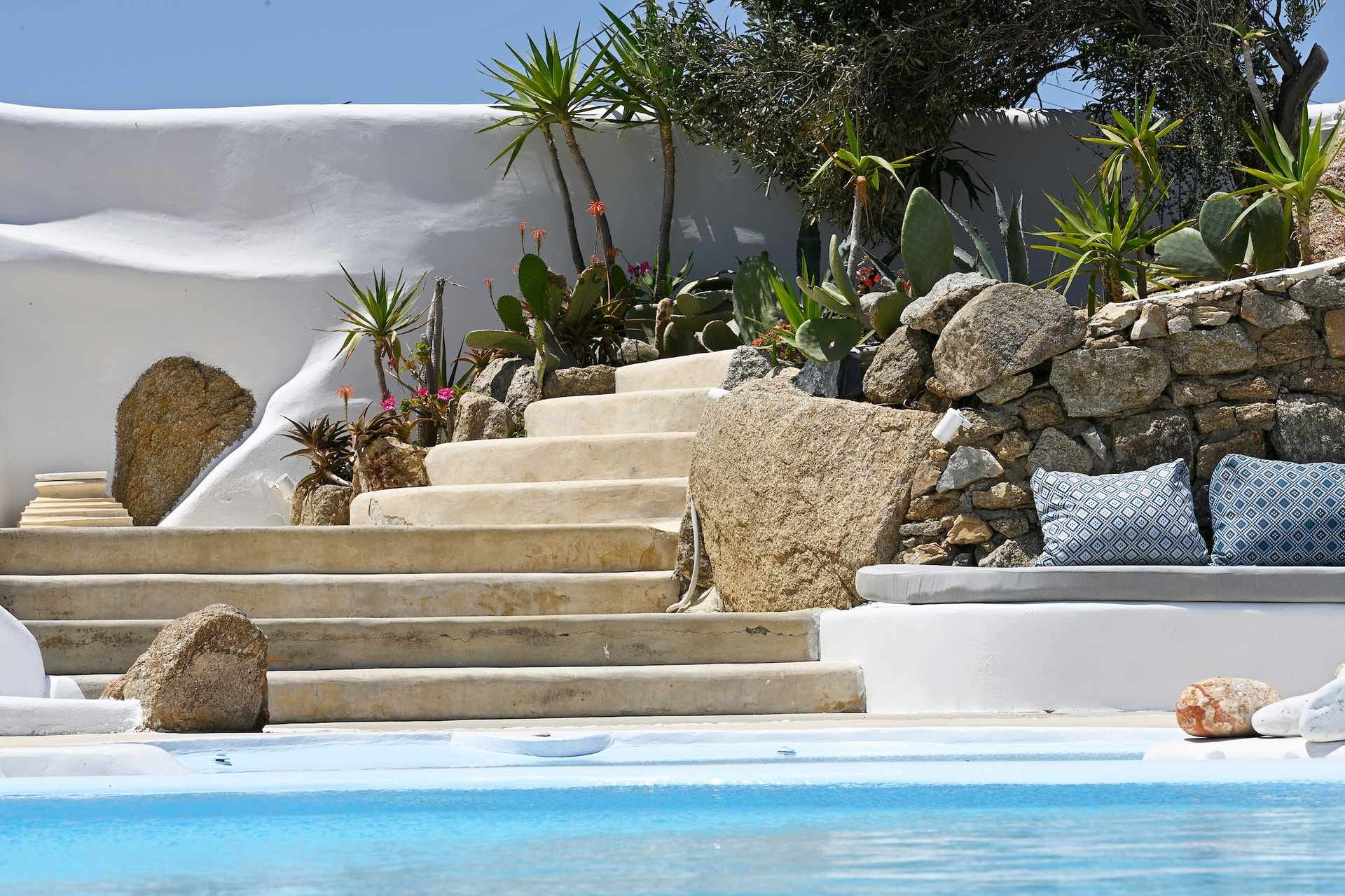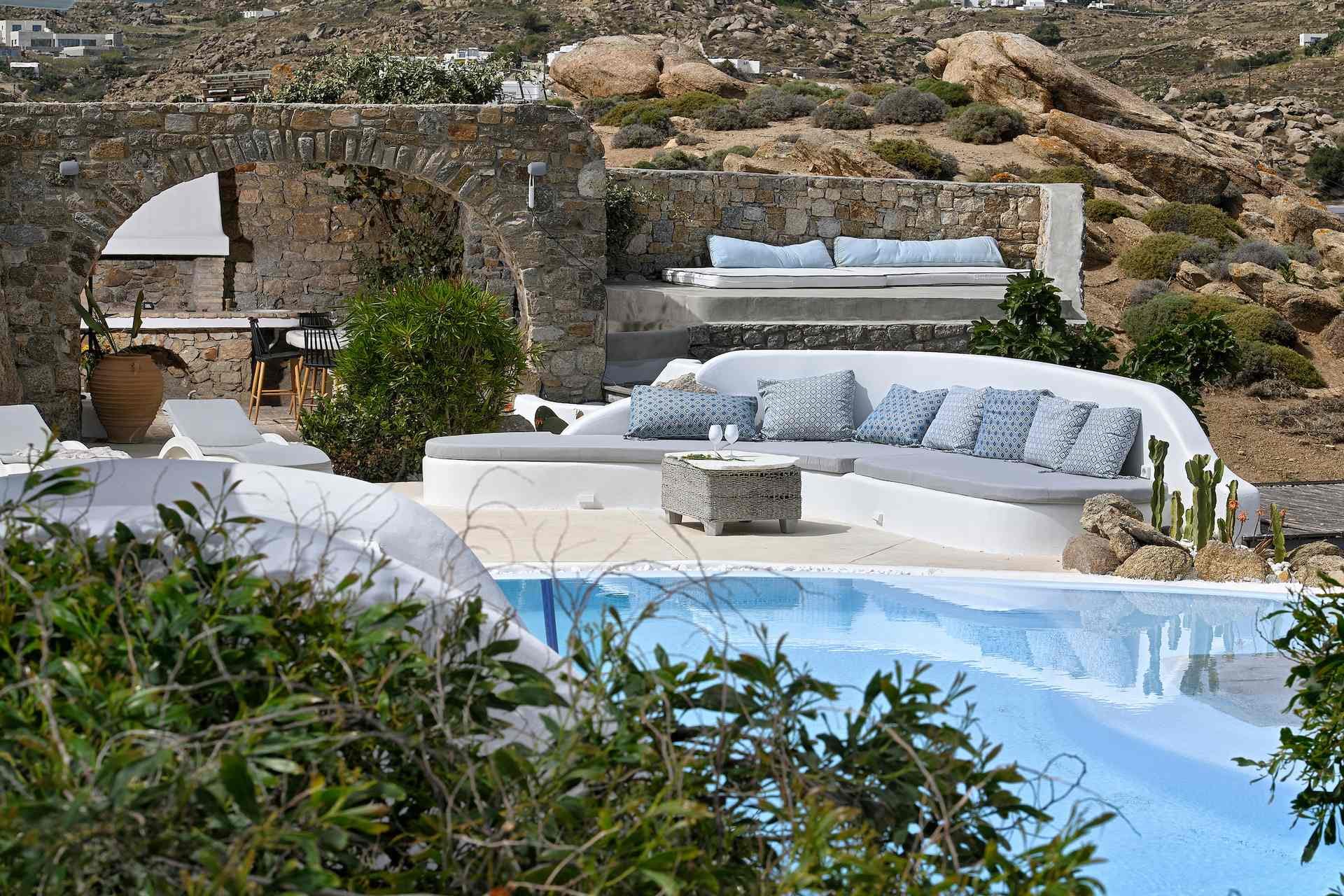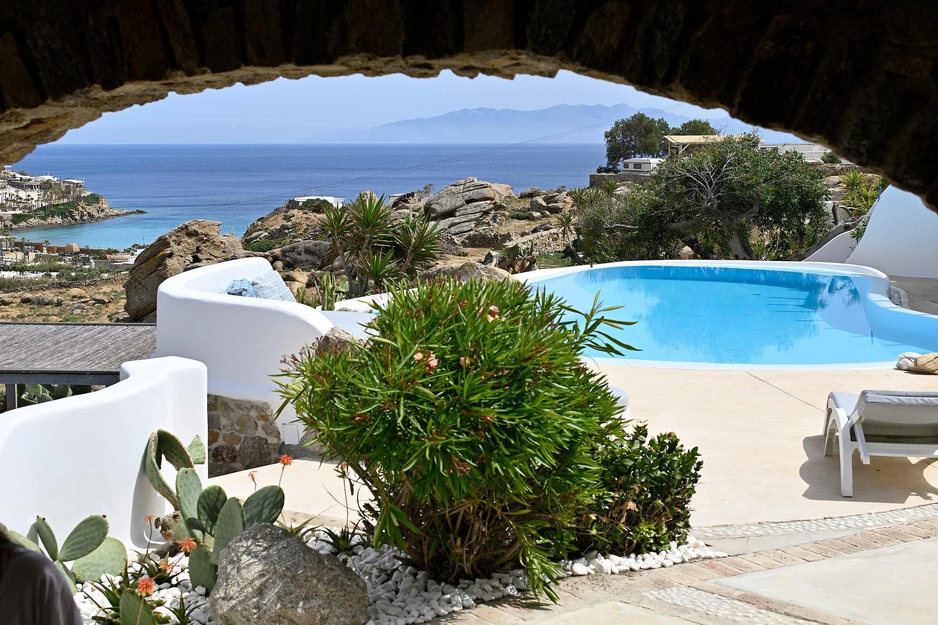 Rubith is a cliffside retreat in Paraga that feels like it grew out of the landscape itself. Two villas share sweeping sea views, sculpted terraces, and private infinity pools where you can float above the Aegean. Inside, light-filled open spaces combine rustic wood, natural textures, and sea-inspired artwork for a warm, coastal vibe. With 13 luxurious bedrooms and plenty of shaded outdoor areas, it’s a flexible option for big groups who want both quiet moments and easy access to Paradise and Paraga beaches.
