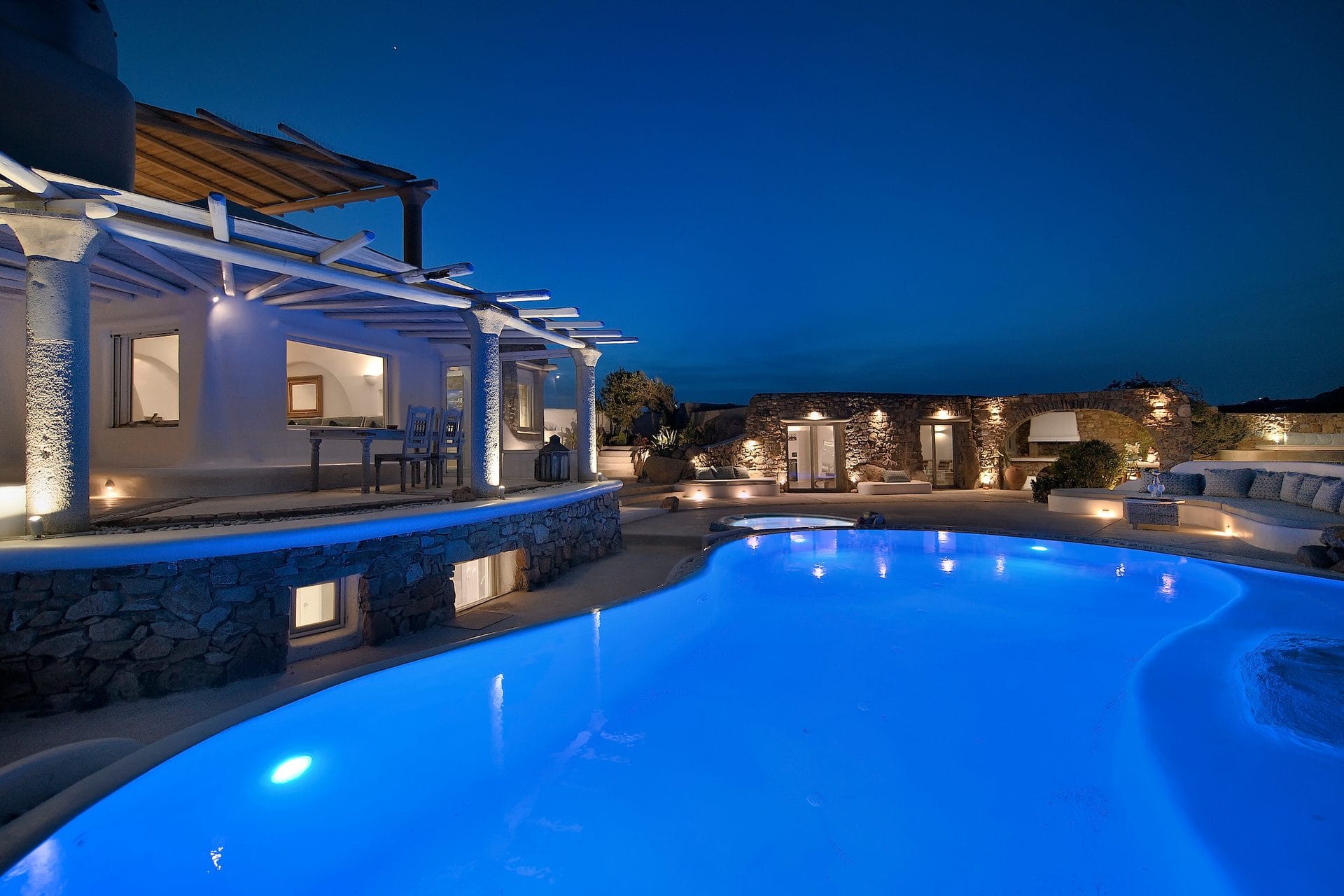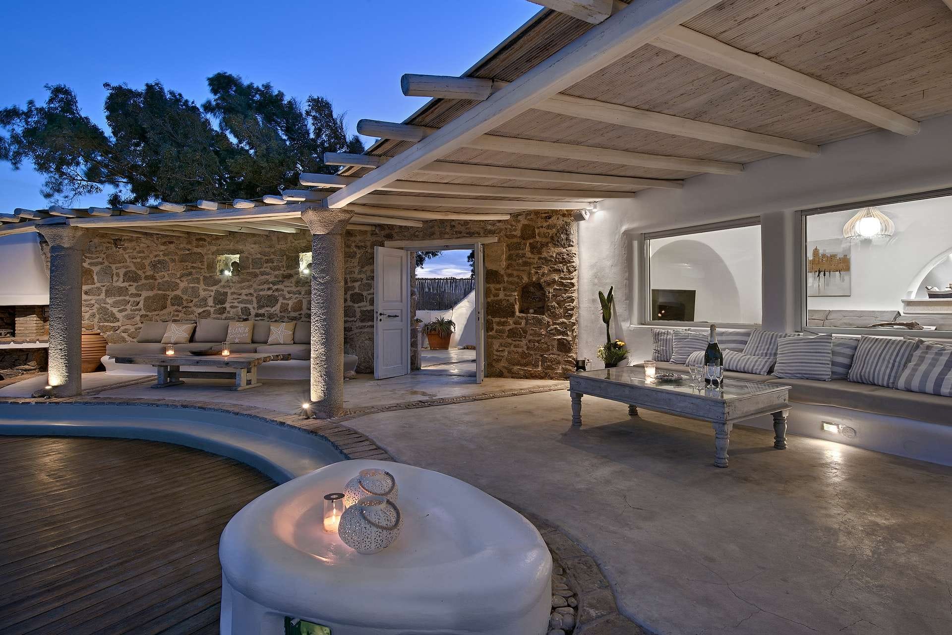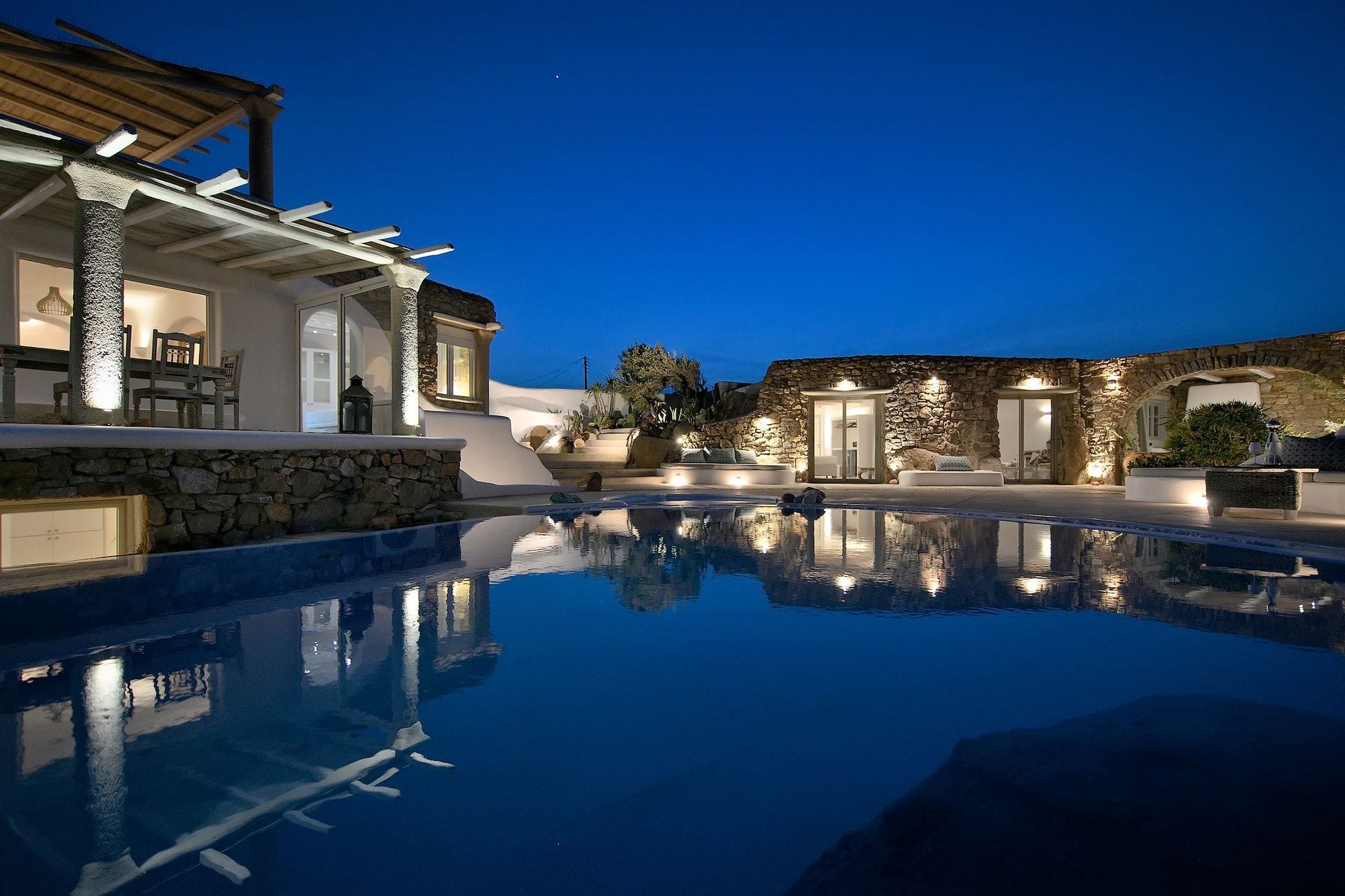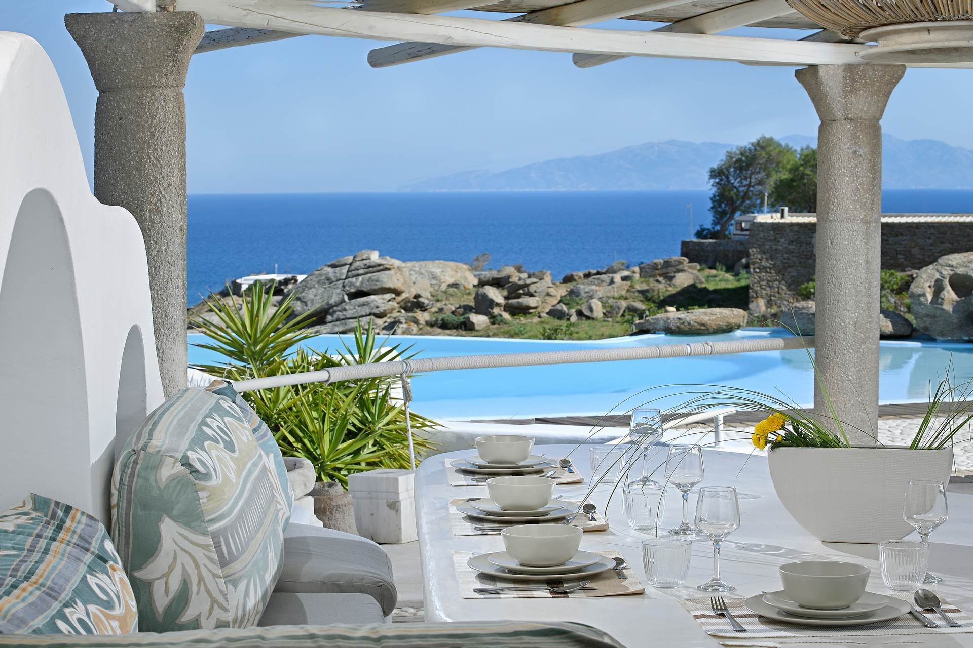 Rubith is a cliffside retreat in Paraga that feels like it grew out of the landscape itself. Two villas share sweeping sea views, sculpted terraces, and private infinity pools where you can float above the Aegean. Inside, light-filled open spaces combine rustic wood, natural textures, and sea-inspired artwork for a warm, coastal vibe. With 13 luxurious bedrooms and plenty of shaded outdoor areas, it’s a flexible option for big groups who want both quiet moments and easy access to Paradise and Paraga beaches.