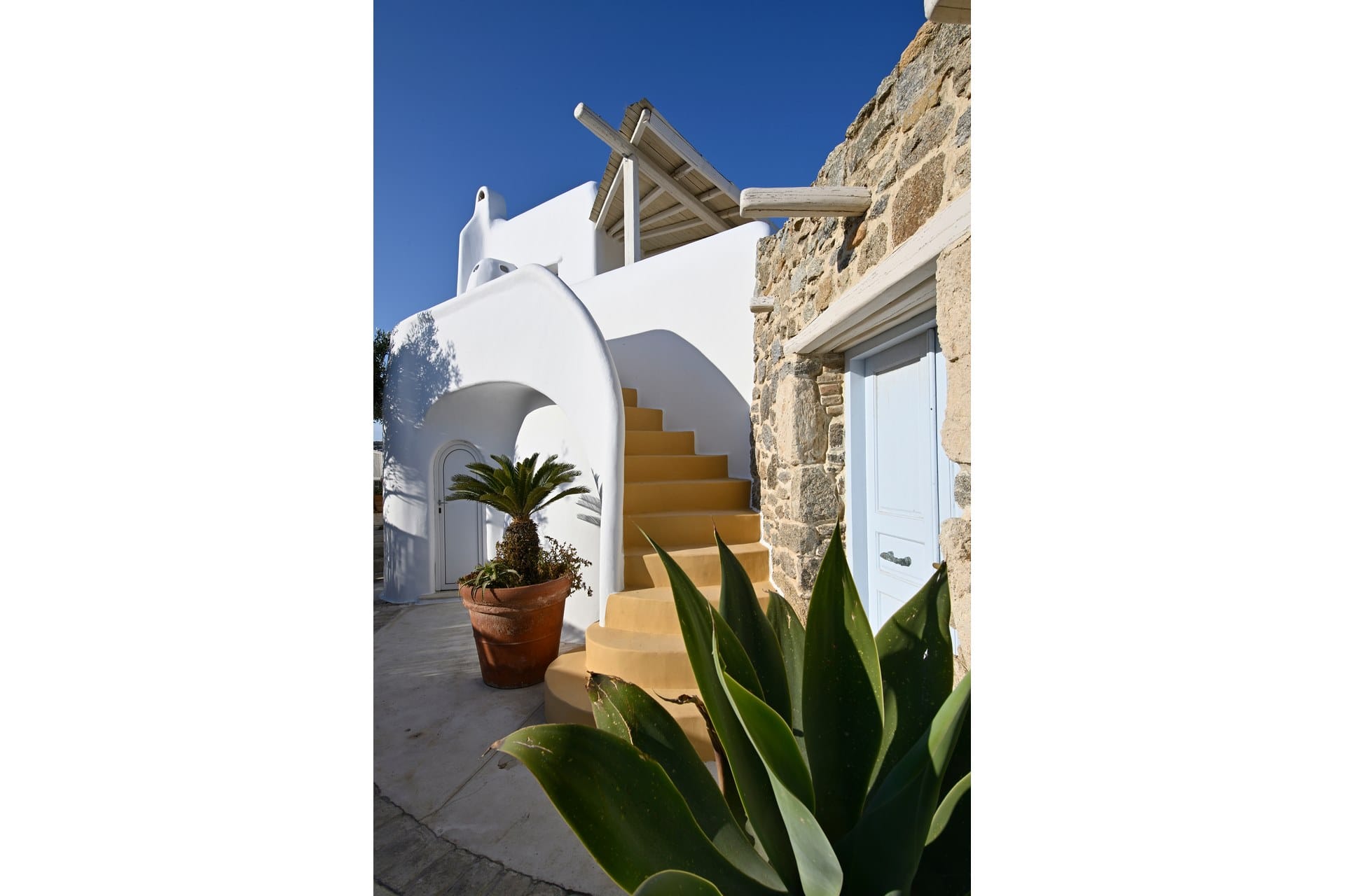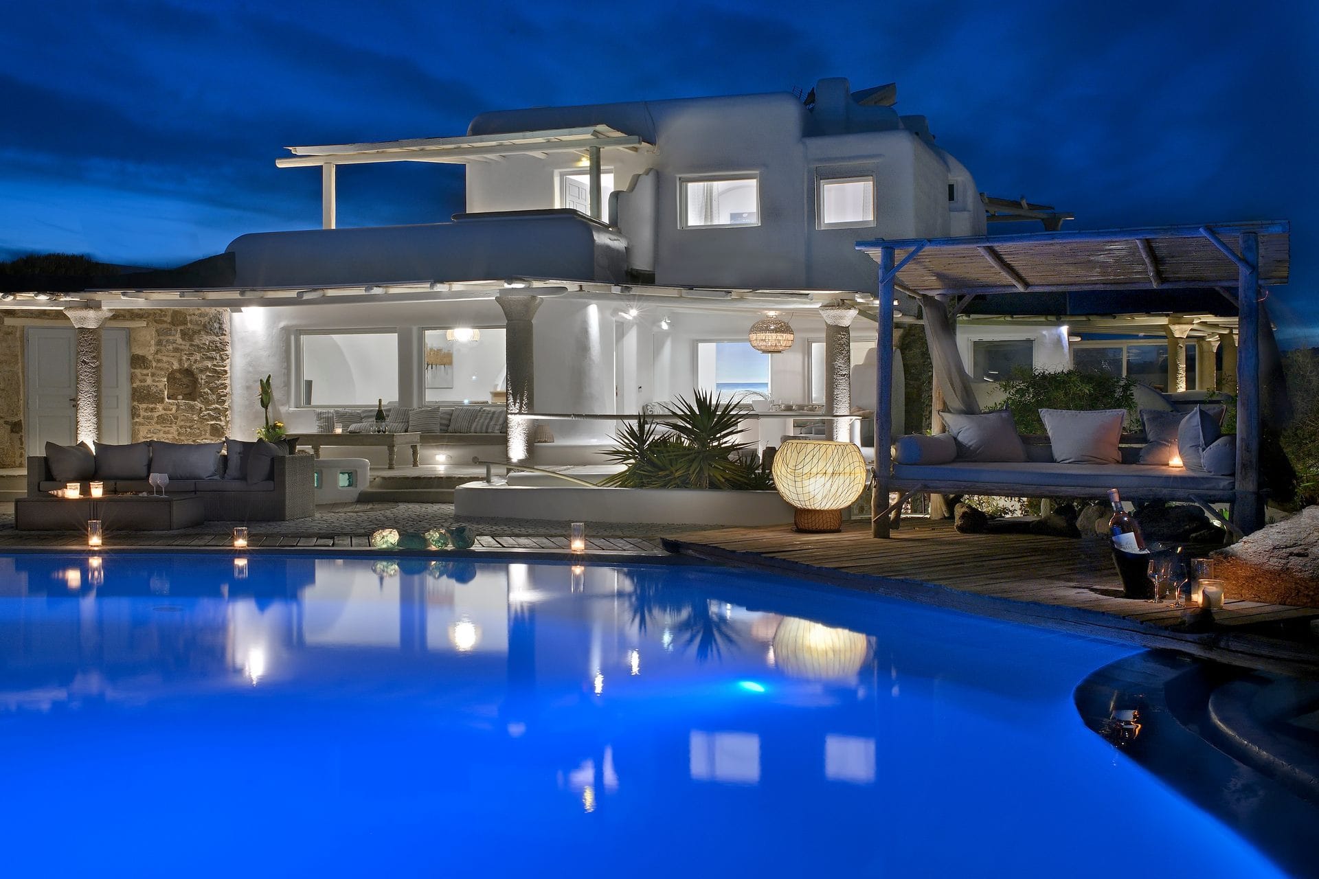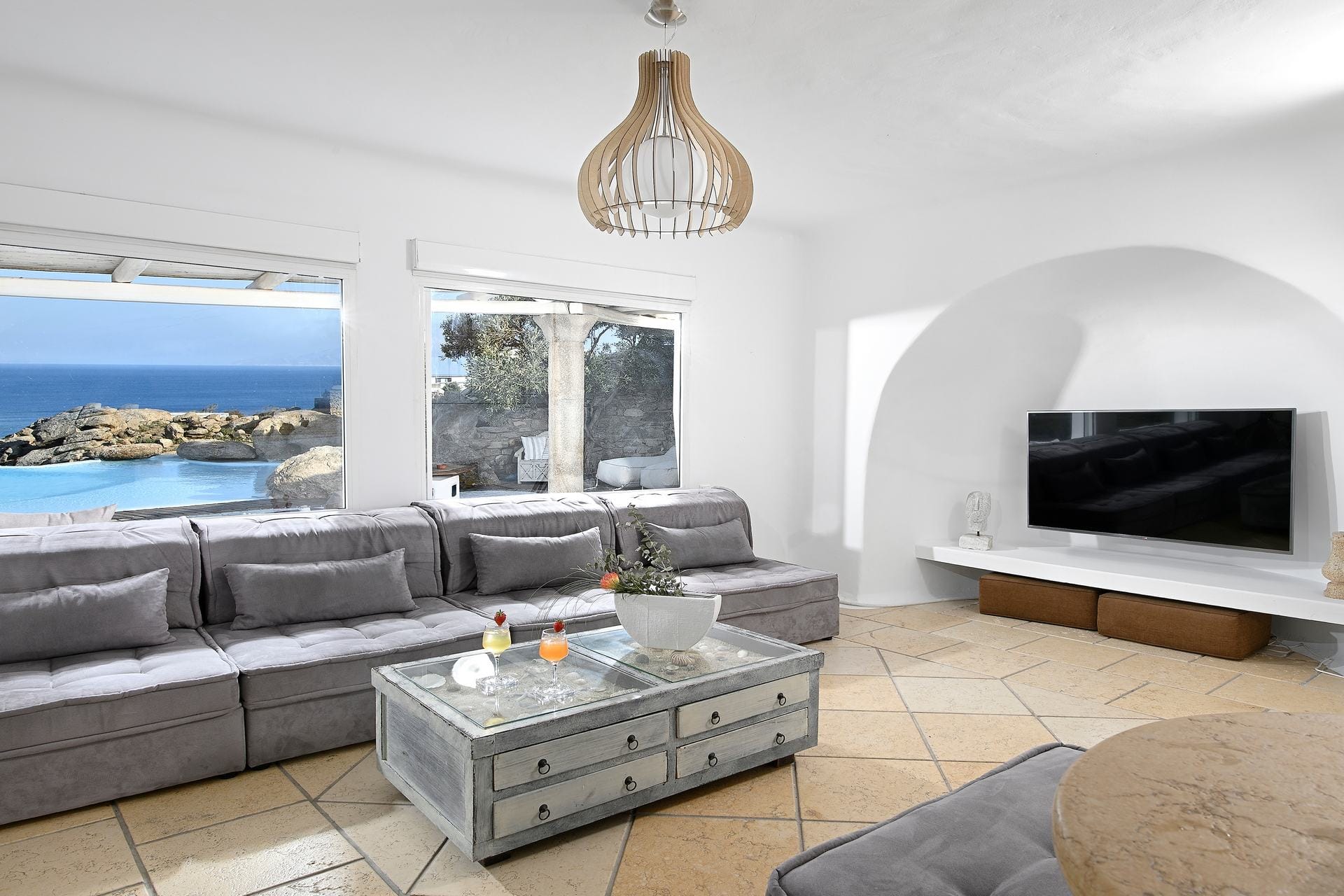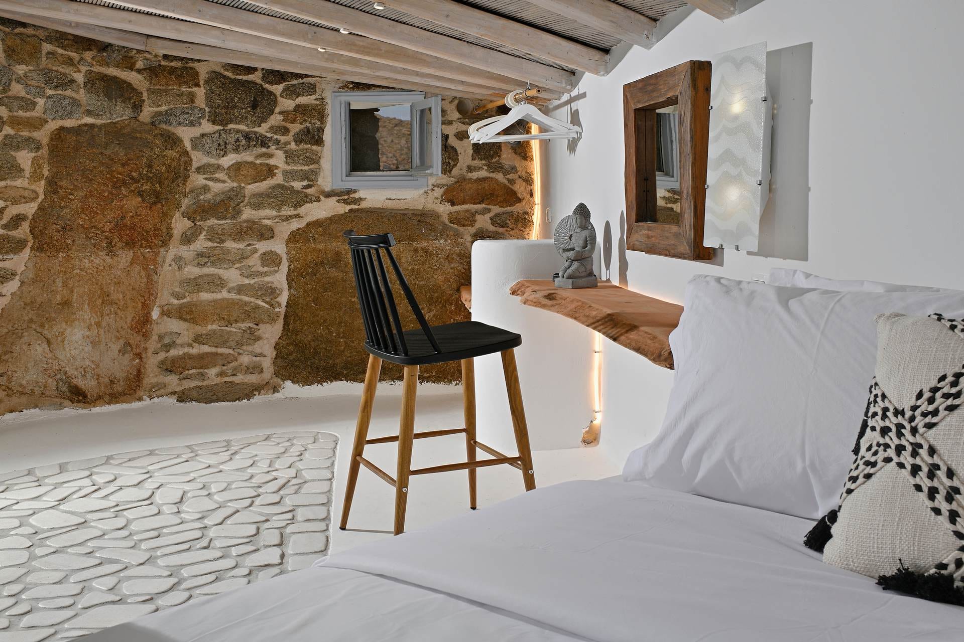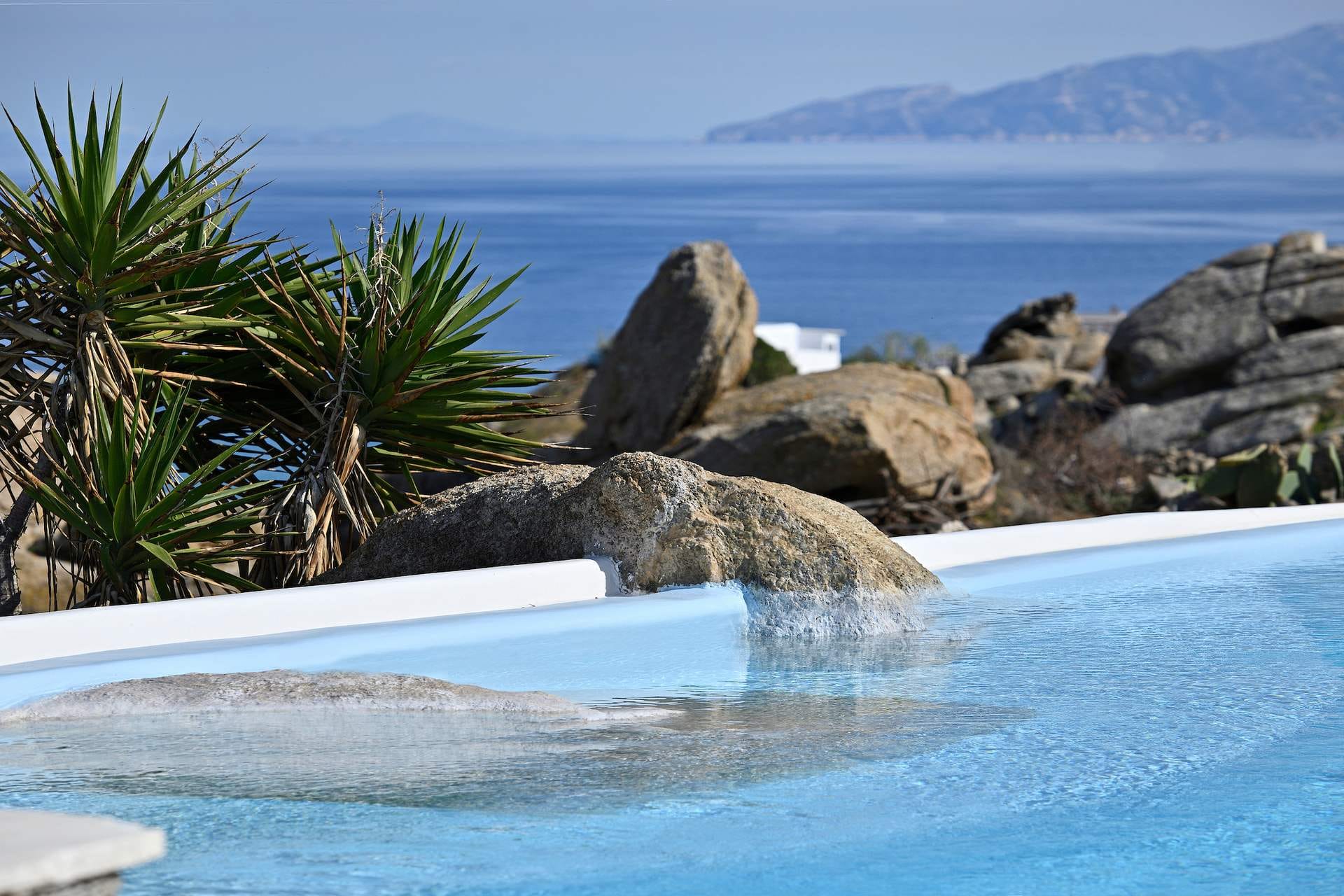 Rubith is a cliffside retreat in Paraga that feels like it grew out of the landscape itself. Two villas share sweeping sea views, sculpted terraces, and private infinity pools where you can float above the Aegean. Inside, light-filled open spaces combine rustic wood, natural textures, and sea-inspired artwork for a warm, coastal vibe. With 13 luxurious bedrooms and plenty of shaded outdoor areas, it’s a flexible option for big groups who want both quiet moments and easy access to Paradise and Paraga beaches.
