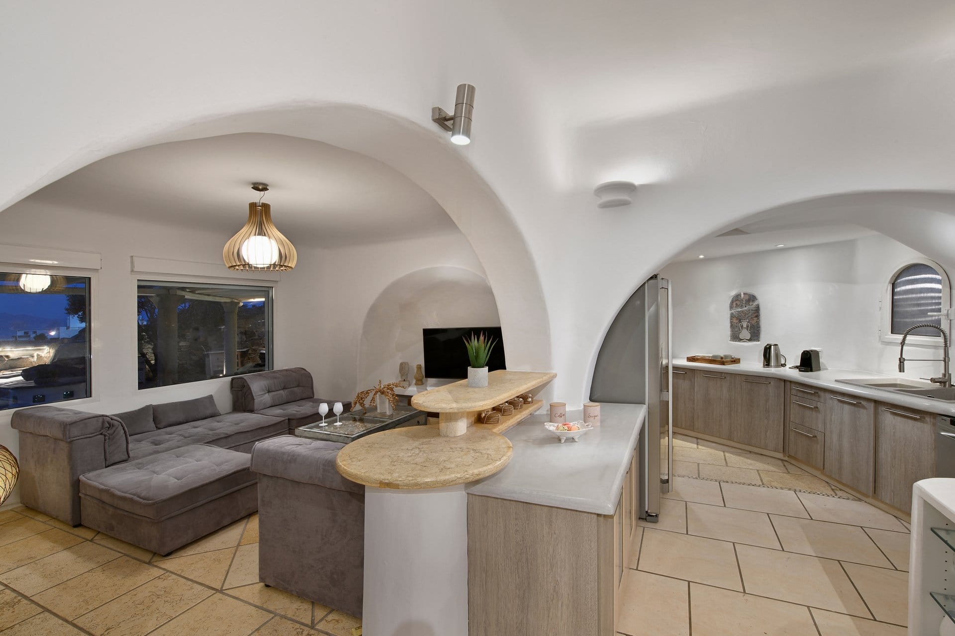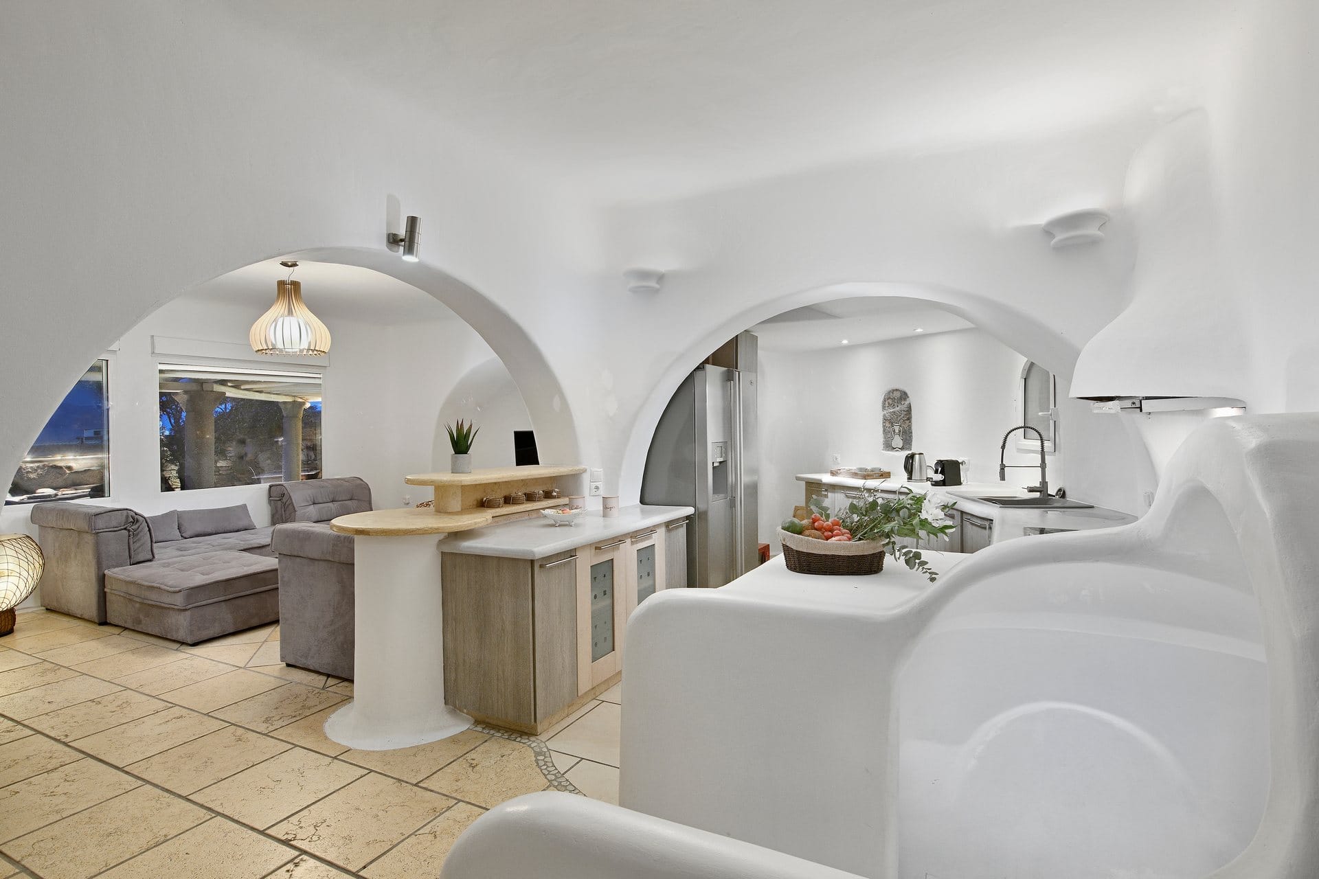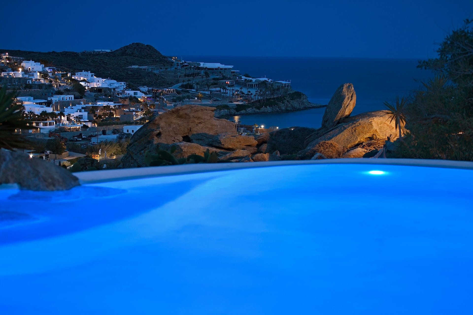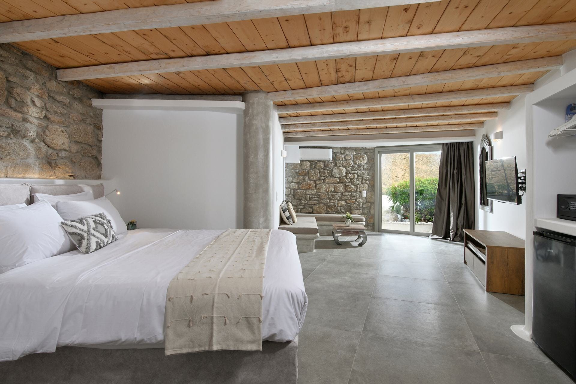 Rubith is a cliffside retreat in Paraga that feels like it grew out of the landscape itself. Two villas share sweeping sea views, sculpted terraces, and private infinity pools where you can float above the Aegean. Inside, light-filled open spaces combine rustic wood, natural textures, and sea-inspired artwork for a warm, coastal vibe. With 13 luxurious bedrooms and plenty of shaded outdoor areas, it’s a flexible option for big groups who want both quiet moments and easy access to Paradise and Paraga beaches.