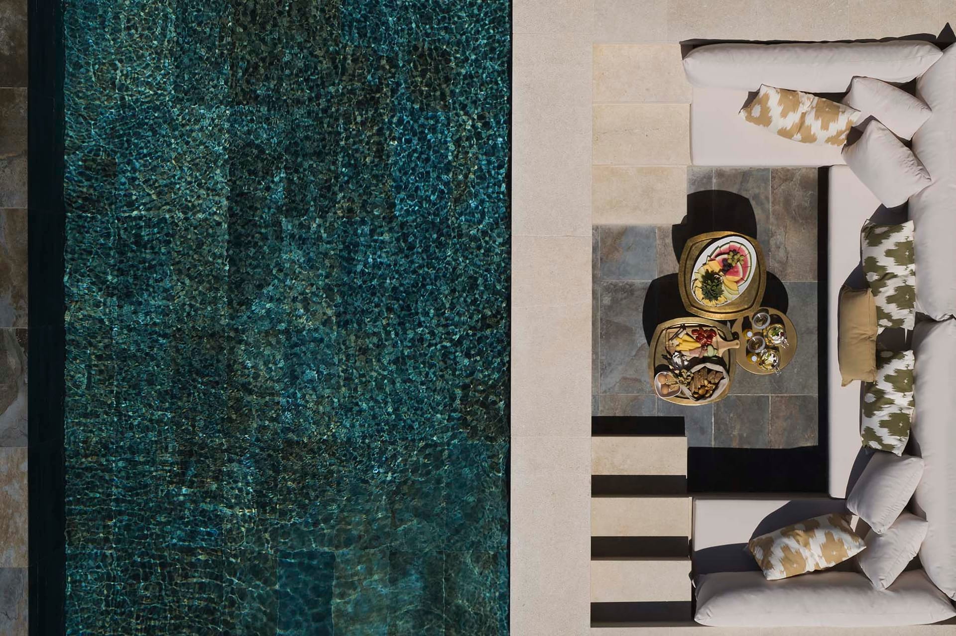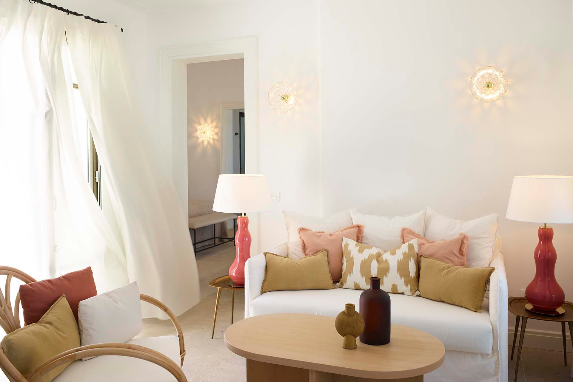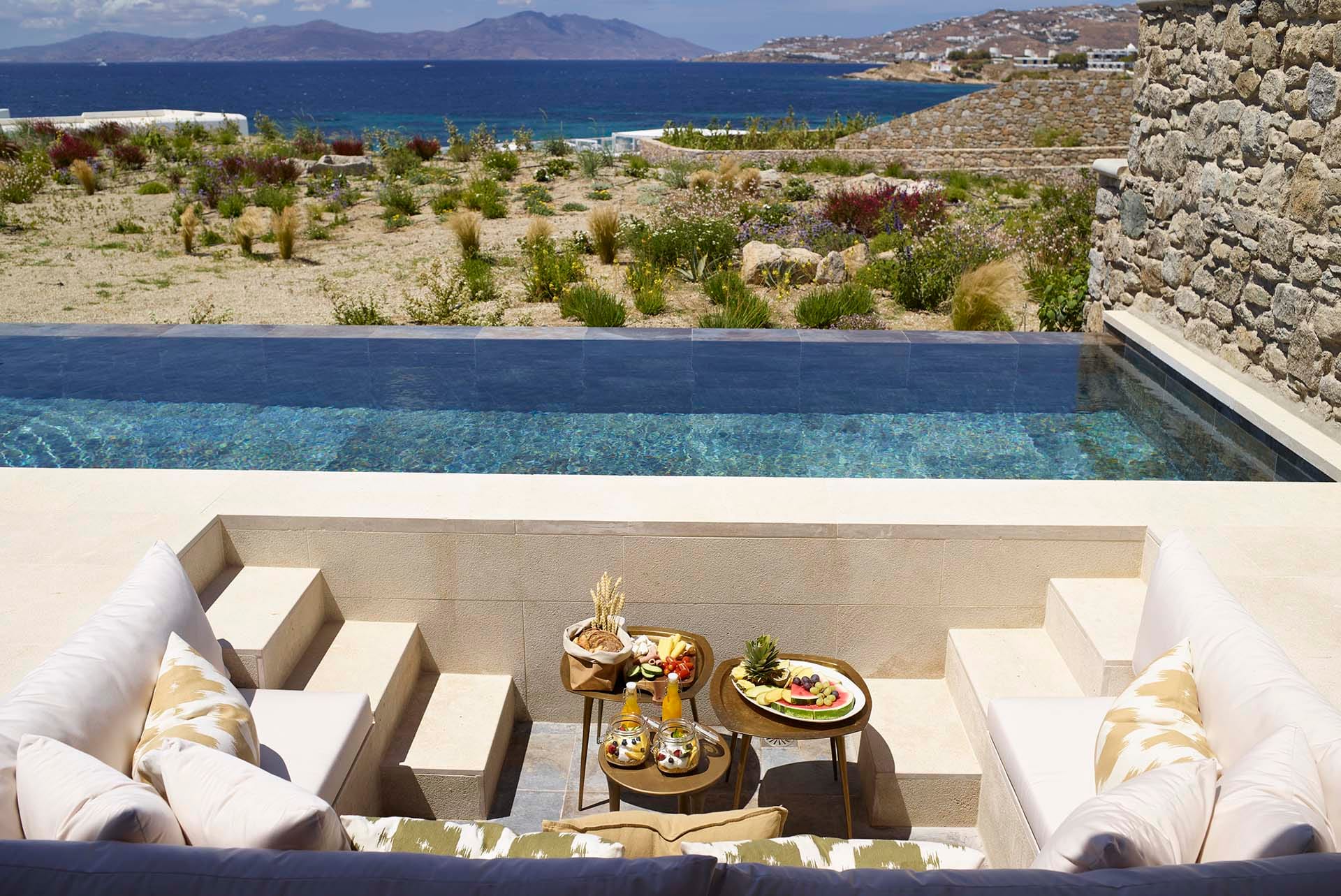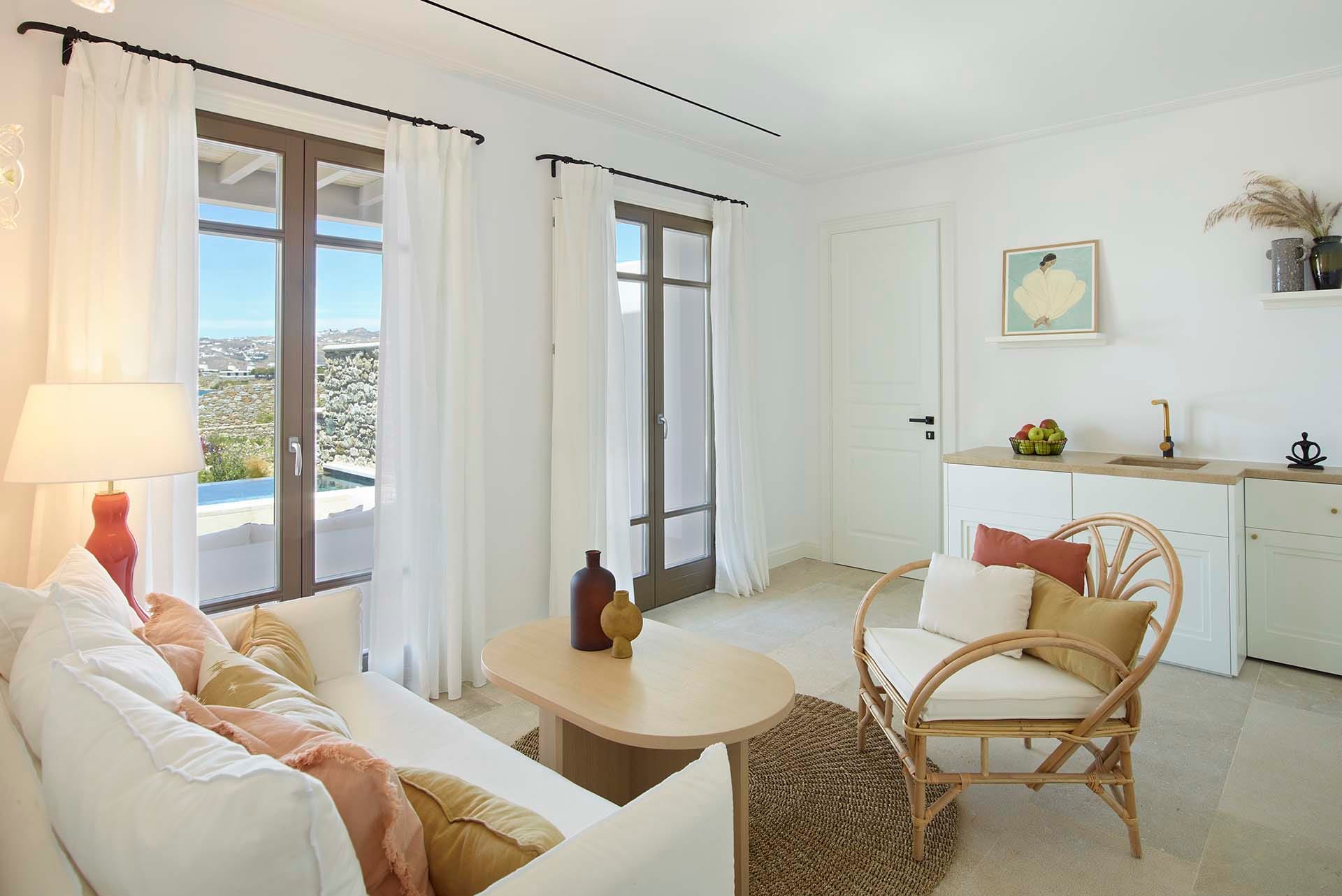 Ruby sits right by Megali Ammos beach with views stretching over to Mykonos town windmills. Designed for a couple, it blends a quiet, minimal interior—king bedroom, compact living and kitchenette—with a private terrace that looks straight to the sea. Days fall into a rhythm around the heated pool and loungers; evenings shift to the built-in seating for an easy meal under the stars. Mykonos Town is close when plans turn outward, and the beach is always on your doorstep.