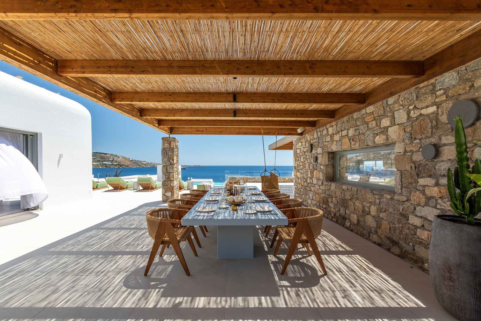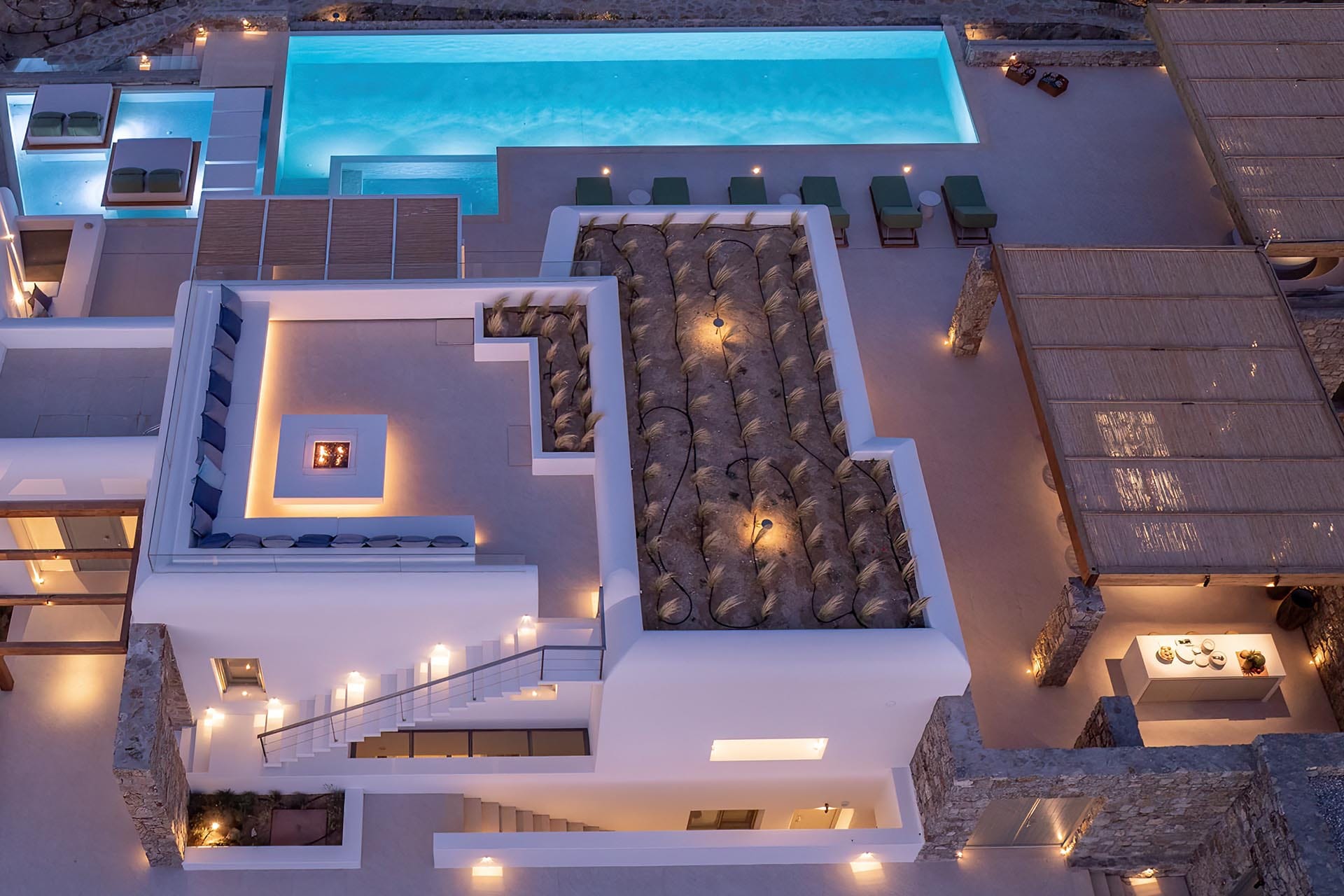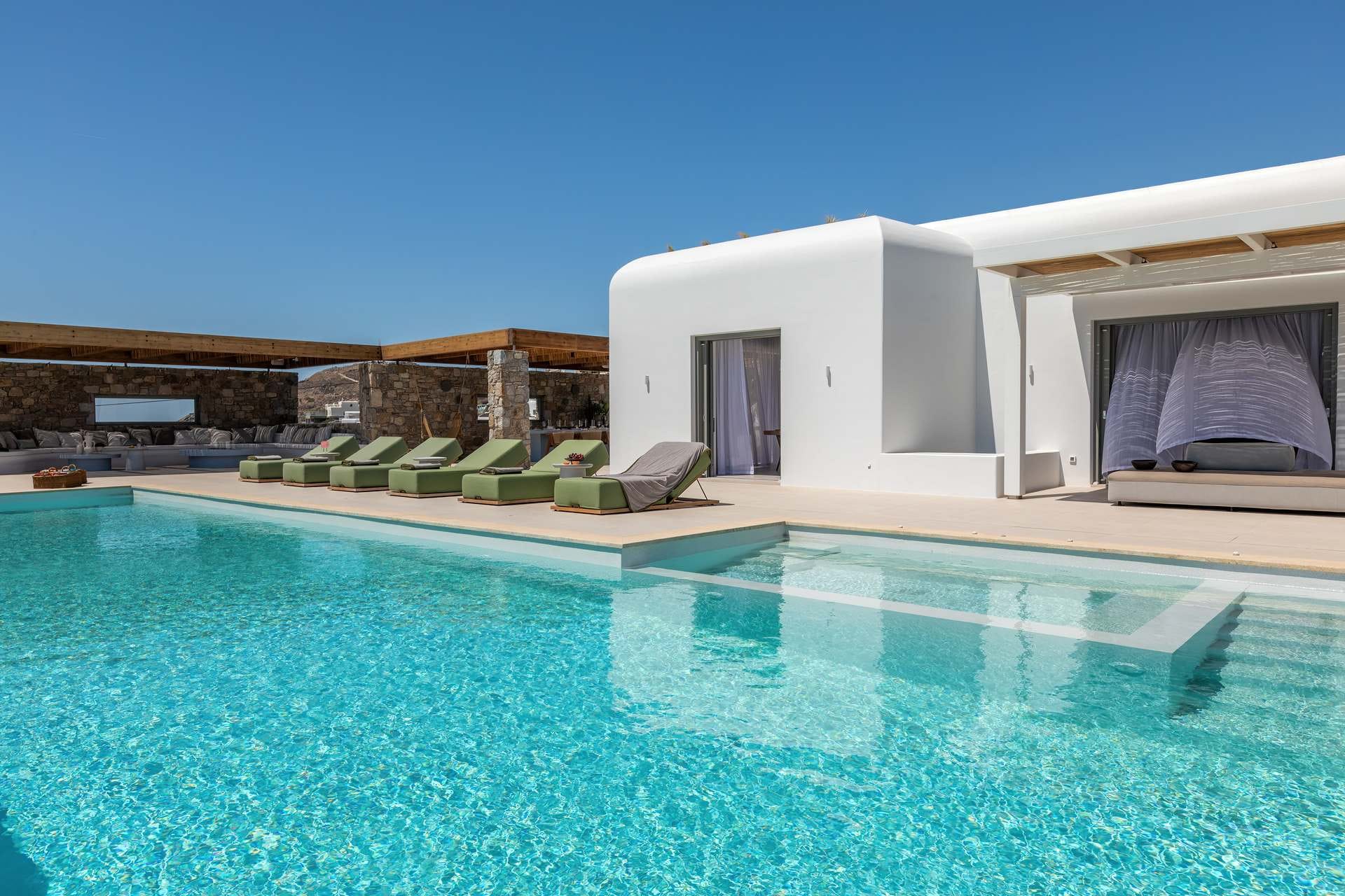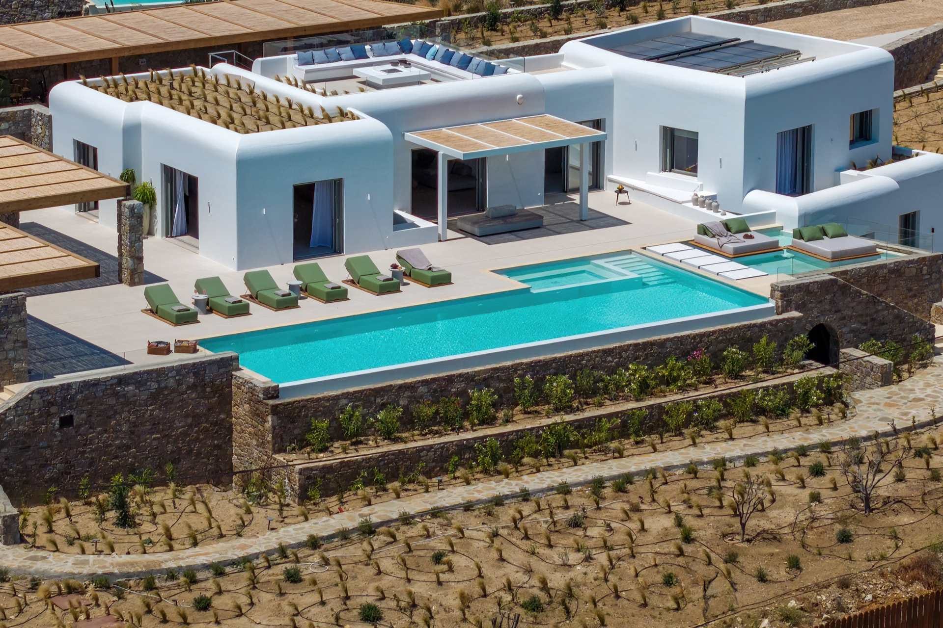 Tigerlily, a standout villa in our Signature Portfolio, welcomes twenty guests in ten king suites in Aleomandra. Outdoors, it features two pools, a 360-view rooftop patio with a fire pit, and access to a private dock for easy boat transfers. Indoors, you will find open living areas designed for comfort and flow, an elevator, a gym, and built-in music, elevating the experience. Secure and stylish, this haven stands within walking distance of Glyfadi Beach, inviting you to drift between villa and sea.