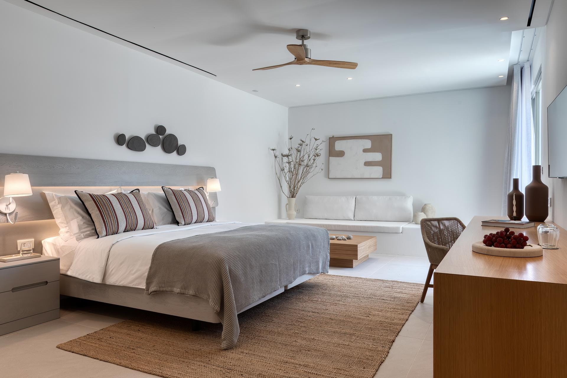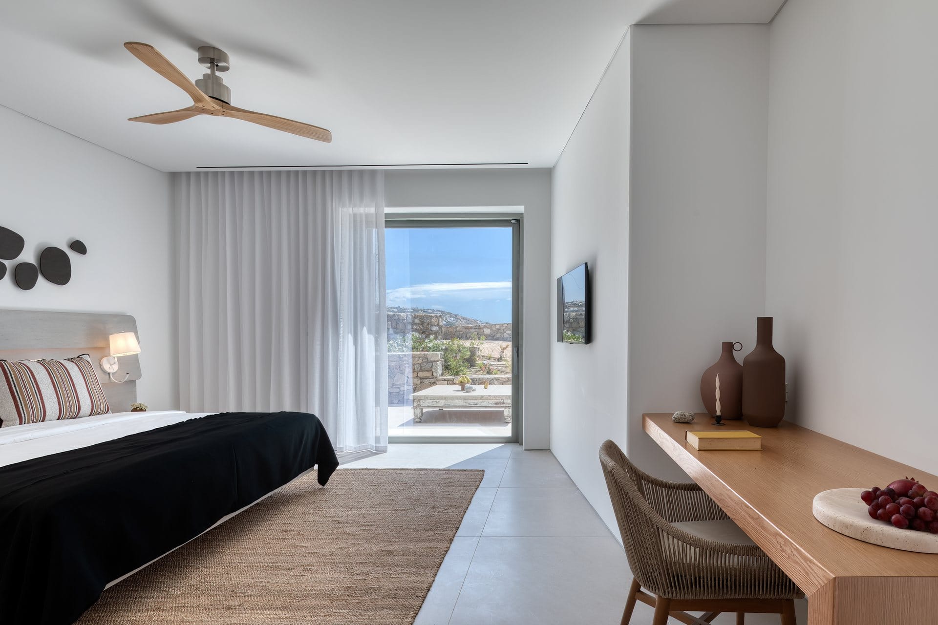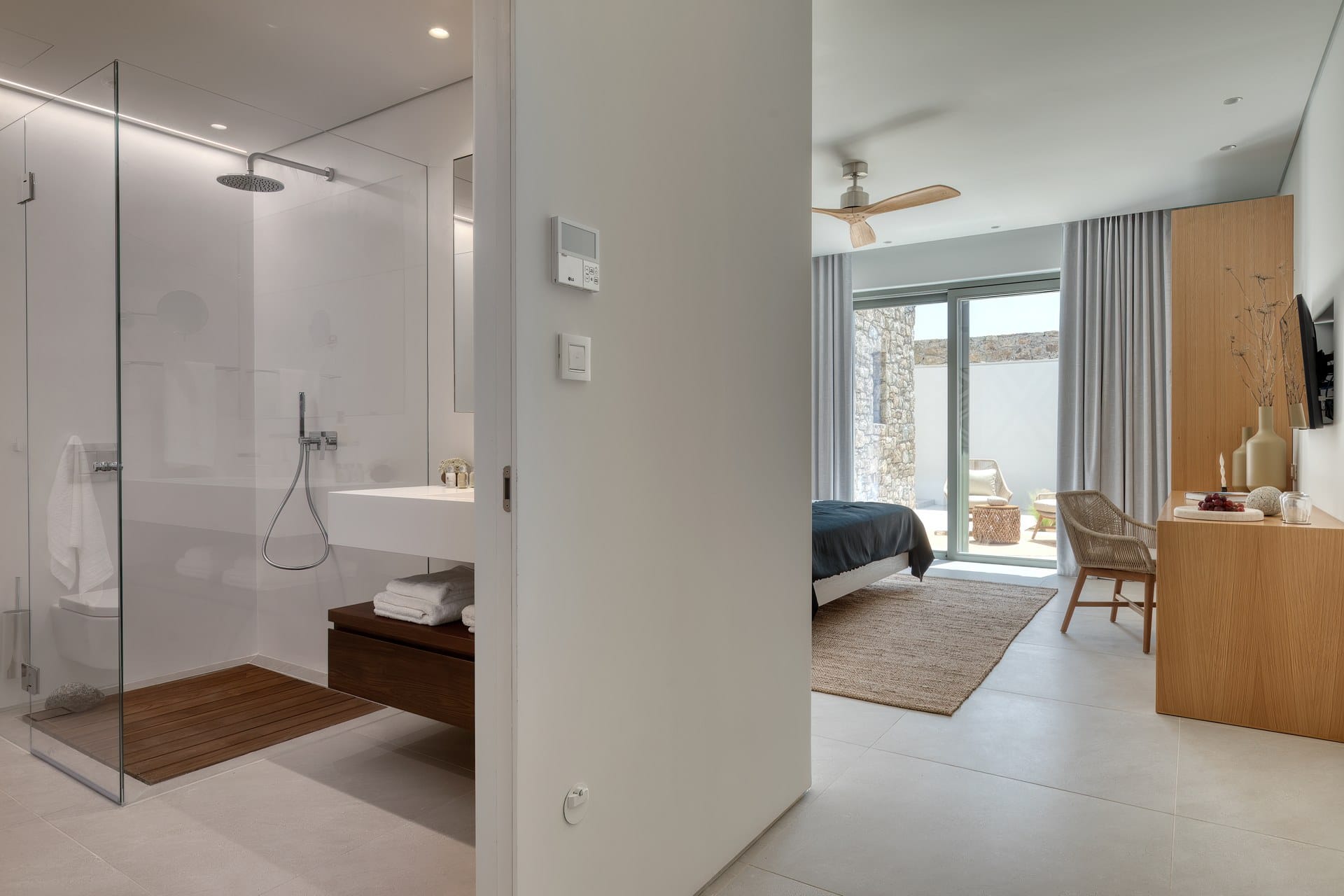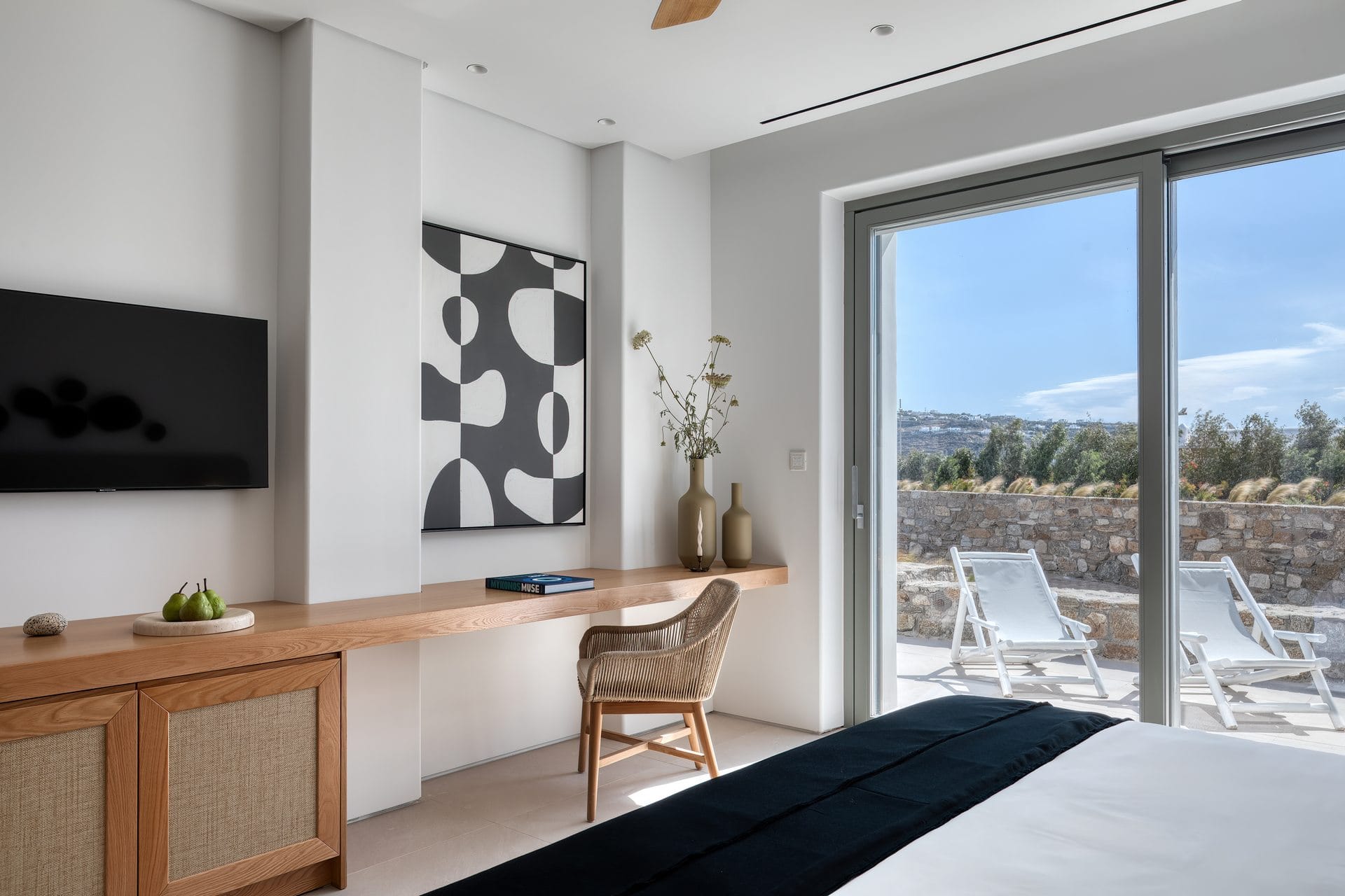 Tigerlily, a standout villa in our Signature Portfolio, welcomes twenty guests in ten king suites in Aleomandra. Outdoors, it features two pools, a 360-view rooftop patio with a fire pit, and access to a private dock for easy boat transfers. Indoors, you will find open living areas designed for comfort and flow, an elevator, a gym, and built-in music, elevating the experience. Secure and stylish, this haven stands within walking distance of Glyfadi Beach, inviting you to drift between villa and sea.
