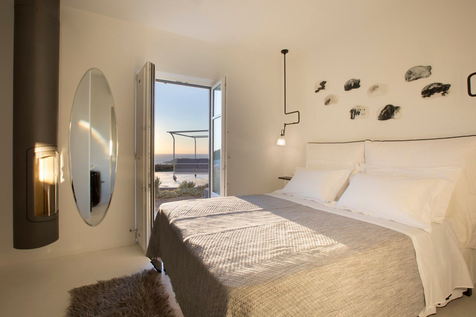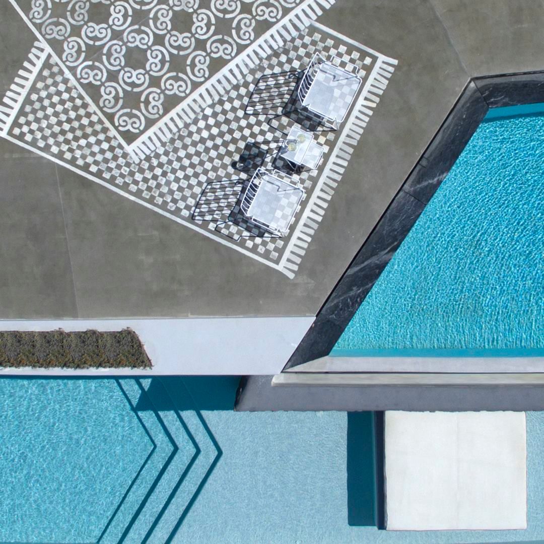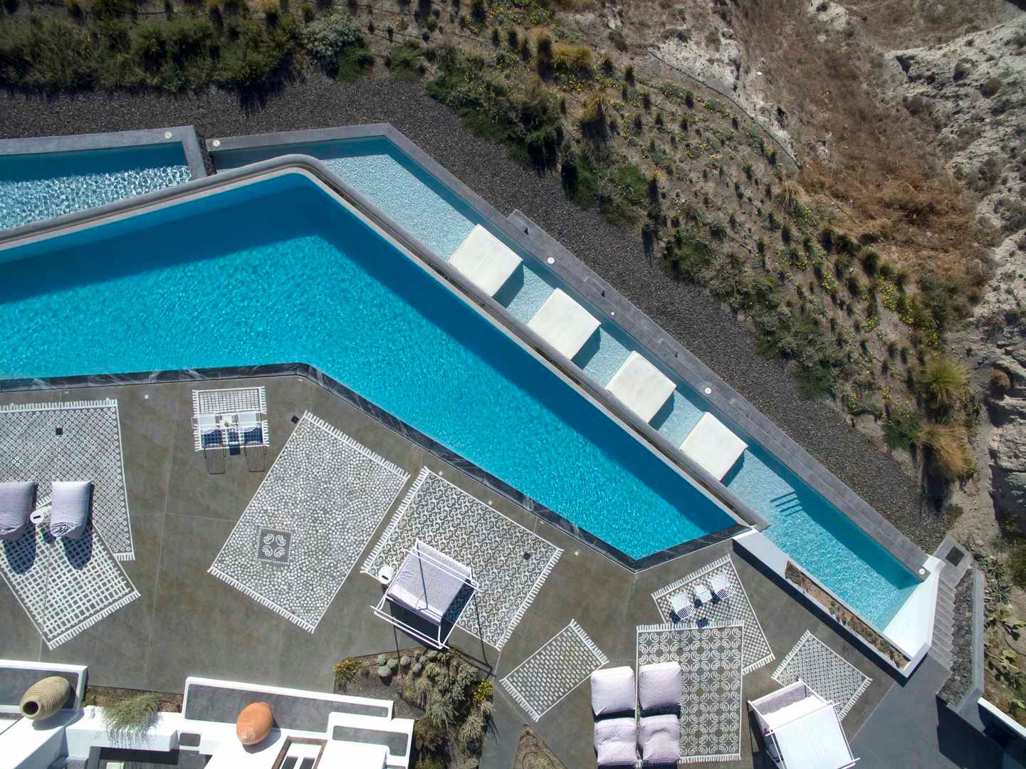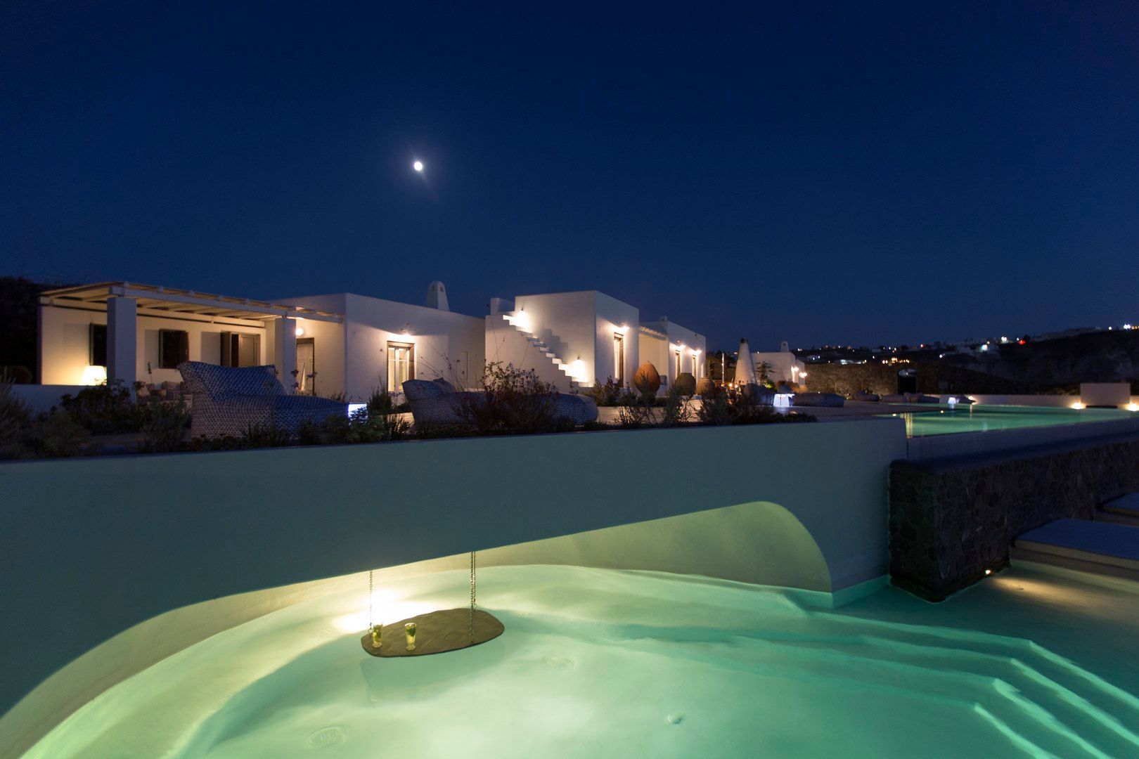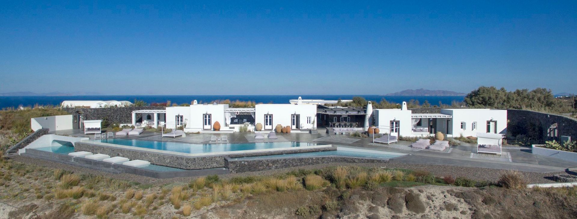 For guests who seek a fully serviced caldera retreat, Hypatia is an all-in-one hideaway in Messaria. The estate sits 300 metres above the sea with sweeping volcano views, centred on a vast, designer infinity pool and multiple outdoor areas. Five suites sleep 10 guests, each with high-end amenities, while one doubles as a spa suite with hammam and treatment room. Between the outdoor cinema, yoga platform, gardens, fire-pit lounges and chapel, there’s little reason to leave—especially with on-site staff, daily breakfast, chef experiences and curated activities included in the stay.
