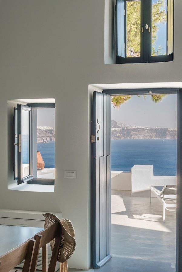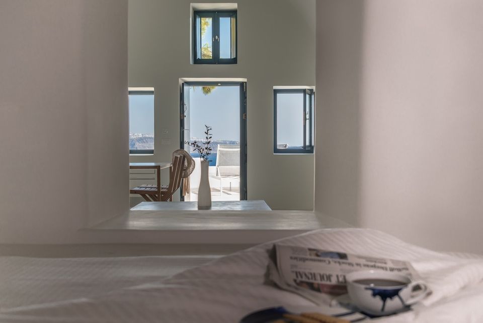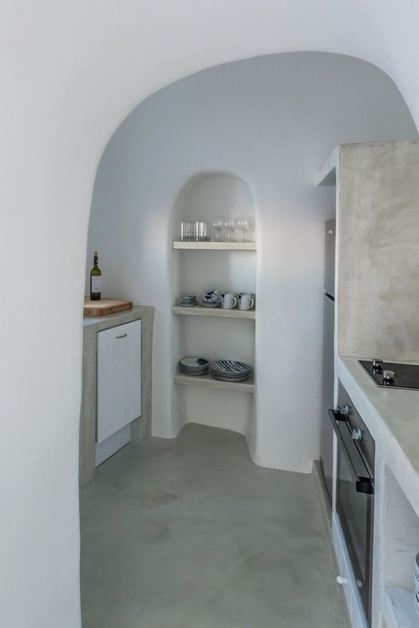 Lucien is an intimate luxury cave-house villa for two in Oia, set on the lower caldera paths with direct volcano views. As a classic canava renovation, it blends original arches and curves with clean contemporary touches around a private terrace. Outdoors, a plunge pool with jacuzzi jets, a stone-built sofa, and pine-tree shade create a calm platform over the Aegean. Indoors, skylights brighten white vaulted interiors with local stone floors, minimal furnishings, and an open-plan bedroom with en-suite rain shower.