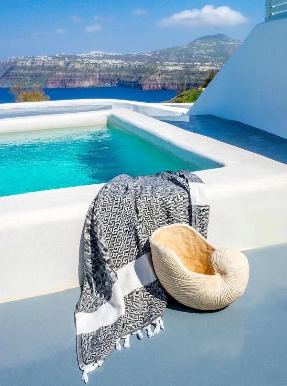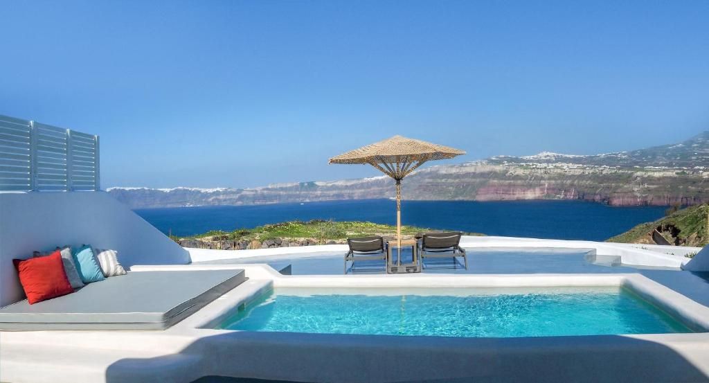If you seek the best sea view and want to experience a serene seclusion in the coziest, most romantic and comfortable suites (50sm). Relax in your large patio with the private plunge pool and comfy outdoor furniture. Enjoy the modern spaces with the stylish, Santorini inspired interiors which offer a colorful sitting and dining area, 2 flat screen TVs with satellite channels. And last but not least… dream in the ultra-romantic, pure white canava style bedroom with the distinctive Santorini architecture.