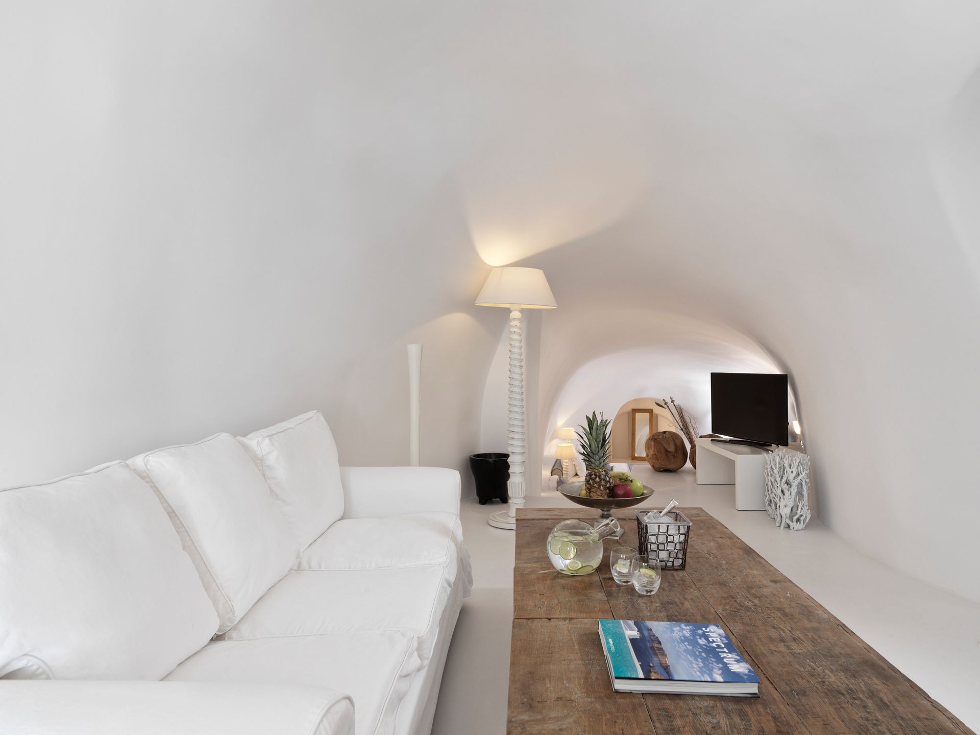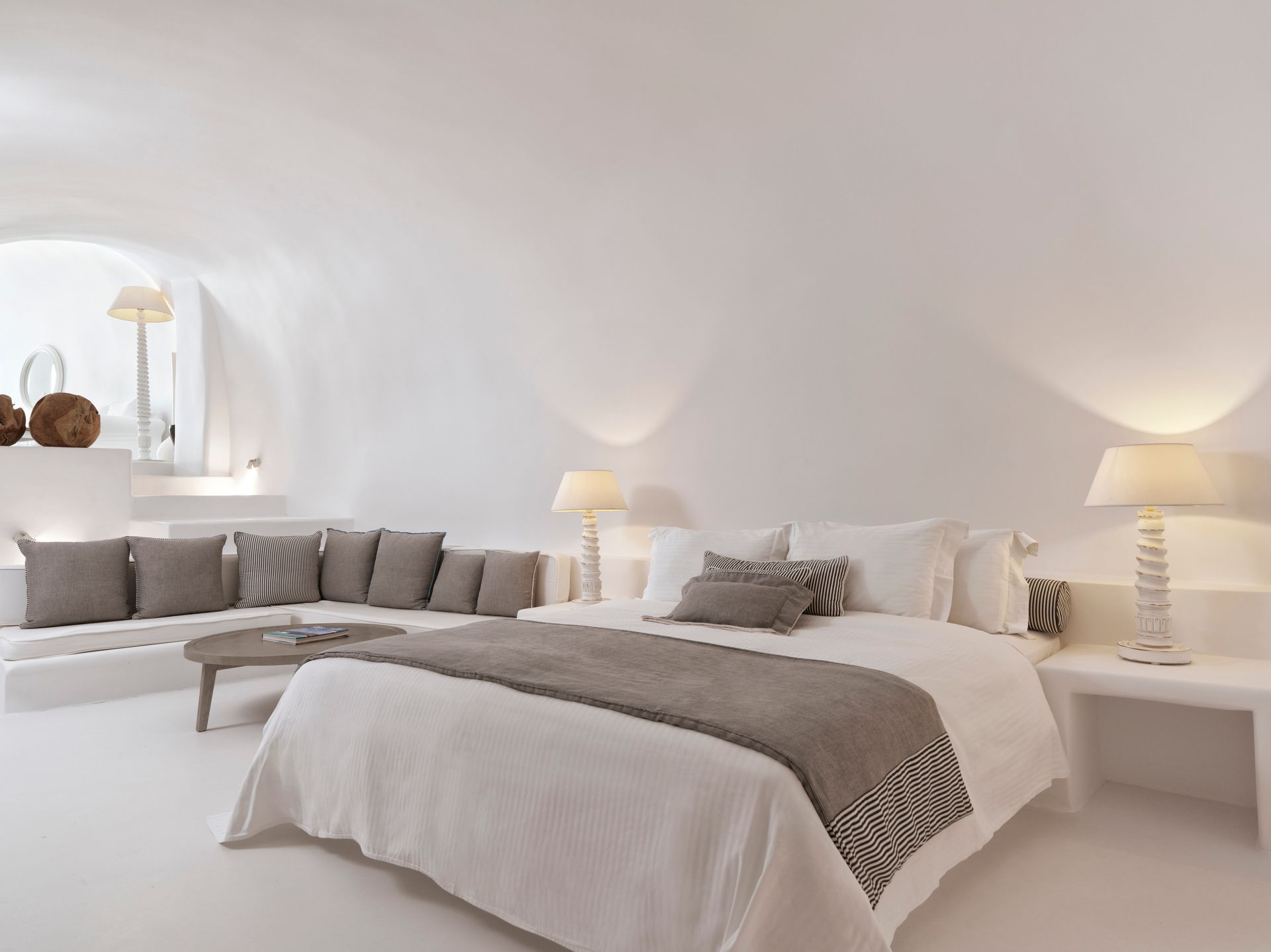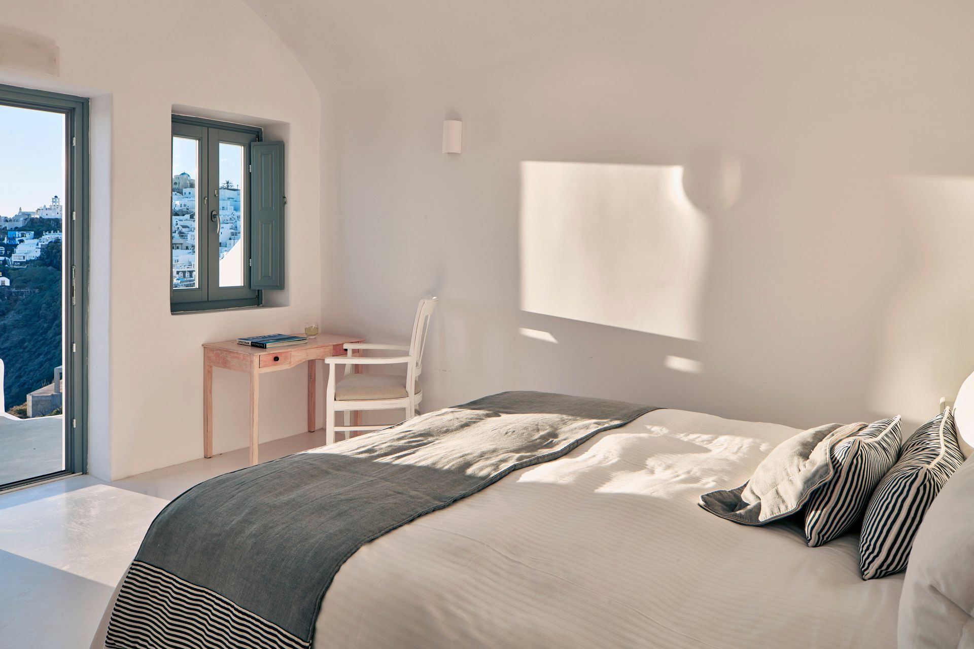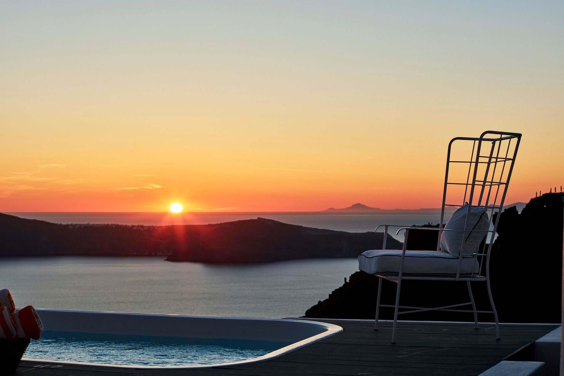Built on two levels, each of which has a balcony that extends its entirety overlooking the Caldera, the Villa features two bedrooms and four bathrooms. Being an ideal luxurious holiday space the main terrace features an outdoor plunge pool, best spot to enjoy the exclusive, sweeping views with your coffee from its outdoor dining tables or the unforgettable sunsets with a cocktail while relaxing on sun loungers. The approximate size of Chromata Villa is 165 sqm.