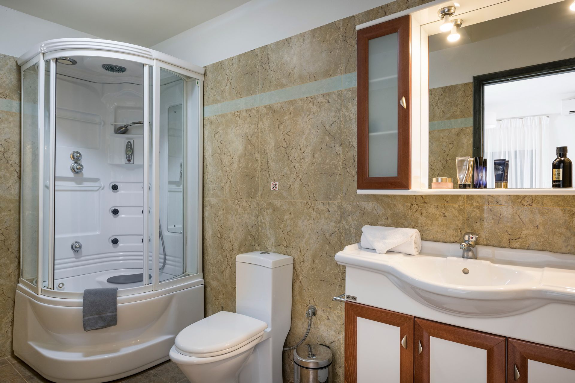 The villa has seven bedrooms and it can host up to 14 guests. Five bedrooms have en-suite bathrooms with Jacuzzi tub or Jacuzzi shower, and the rest two bedrooms share a common bathroom. Satellite TV and air conditioning are provided in all areas.
