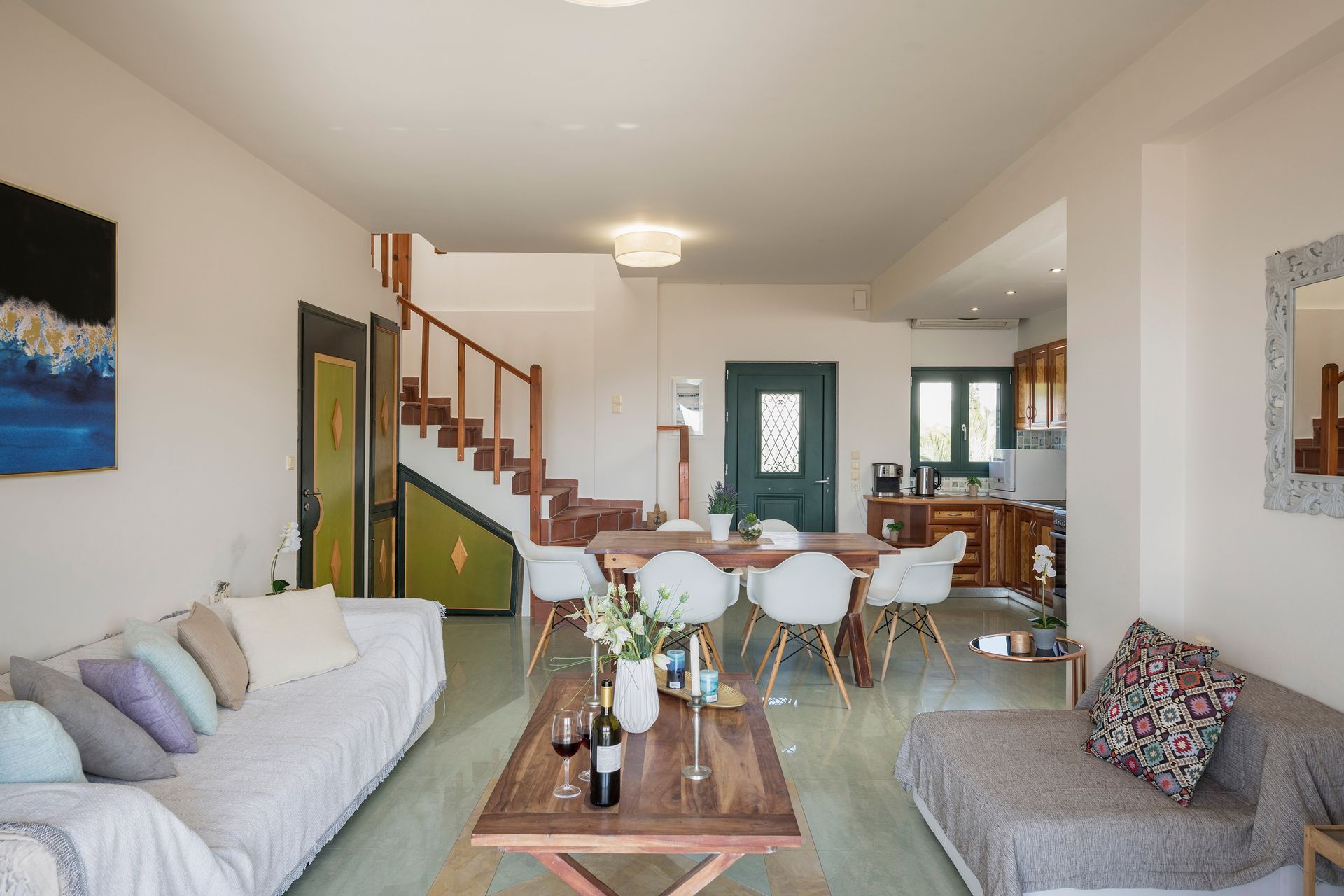 An open plan, fully equipped kitchen and the main living room area are located on the ground floor.