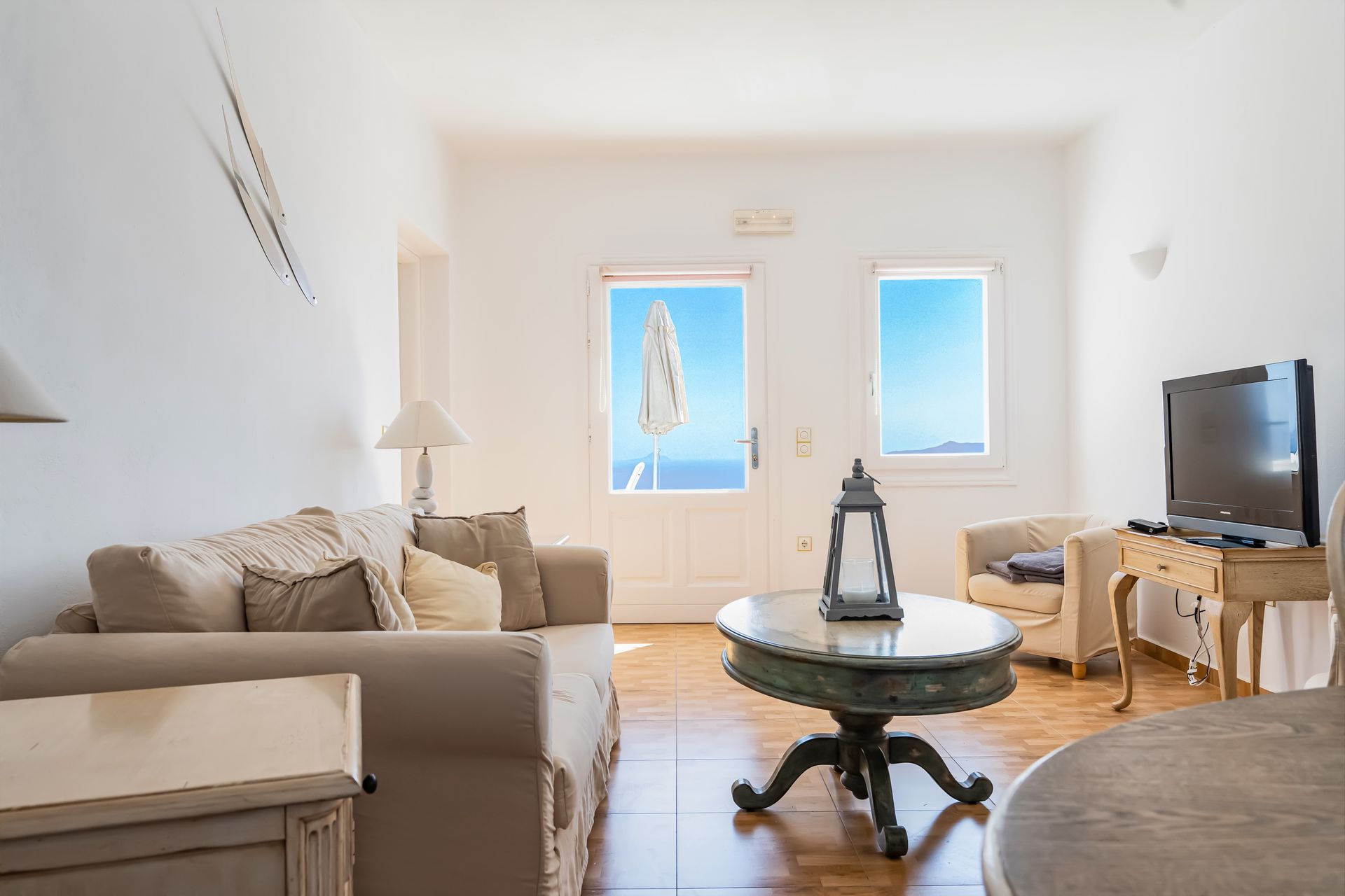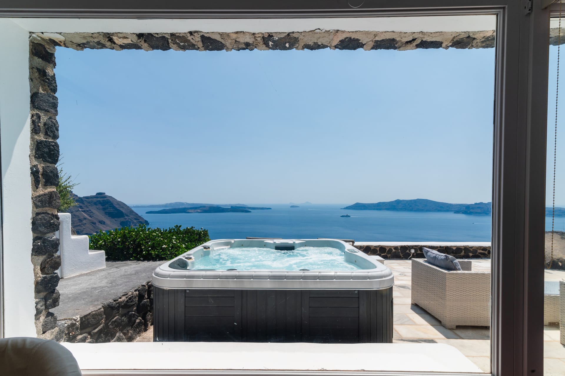 A bedroom with King size bed, bathroom with jet shower, open plan spacious living room and dinning room and gym area in a penthouse with a second bathroom with jet shower. Private veranda with sun beds and outdoor Jacuzzi and an amazing view of the volcano and the caldera area.