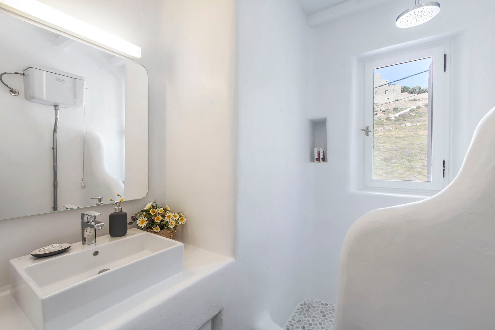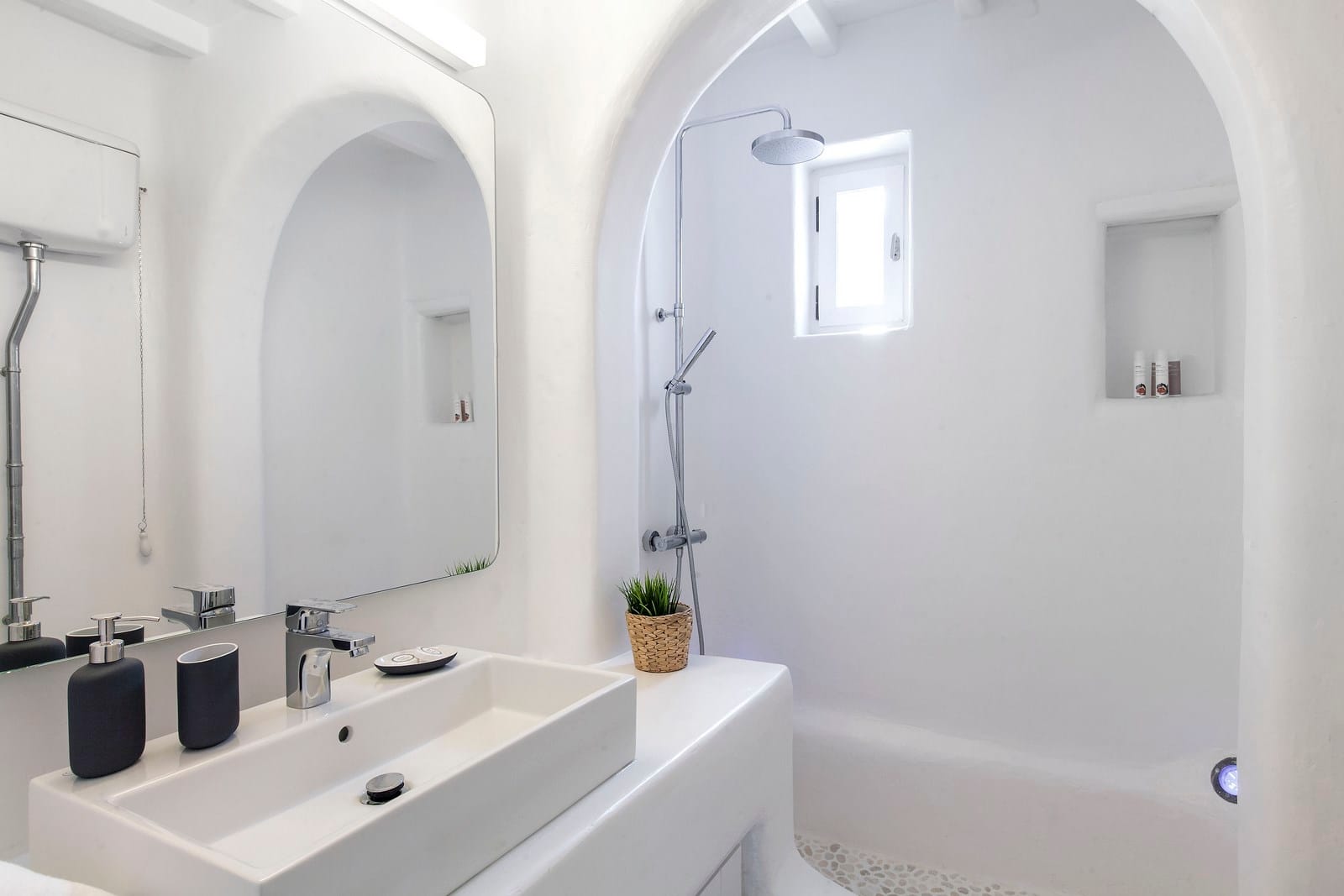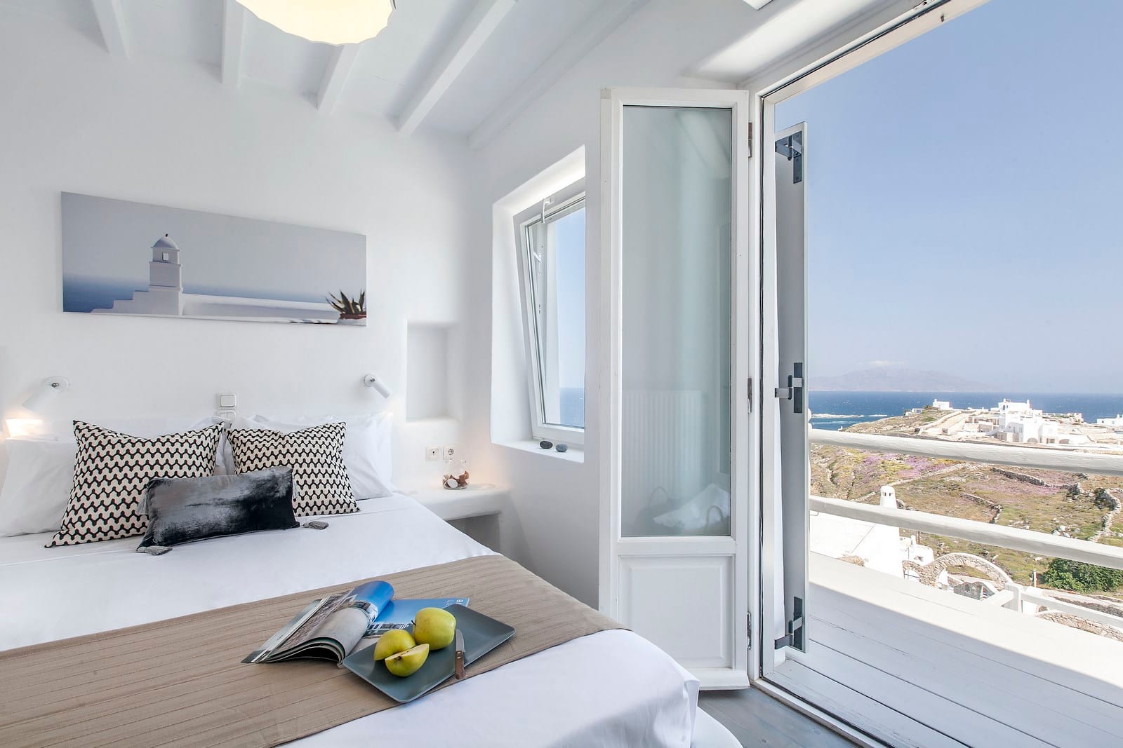 The flexible sleeping arrangements make it a breeze for parents with children or couples traveling without to find their private space in this gorgeous villa. The purity of the white walls inside and out lends the structure a dream-like, ethereal feeling with modern yet minimalist furniture and finishes throughout. Arches and double-pane windows and patio doors grace the villa and let welcome sunshine in, while enjoying a warm awakening.