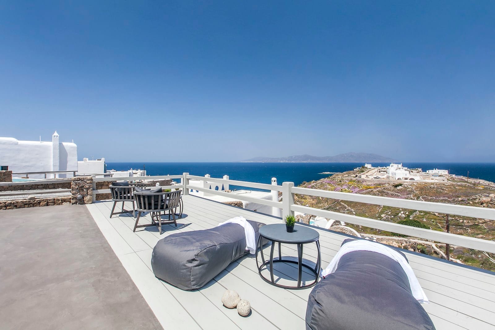 Ornos beach is only a five-minute drive from the villa…lovely! Lovelier so is the fact that after a fun-filled day out exploring the island, one can take an evening dip in the pool and rest on the inviting plush sun-beds. Villa Claire I offers beautiful exterior landscaping complete with breathtaking pool resting at the crest of the Villa’s grounds, unobstructed sea views, shaded dining area as well as wooden deck with lounge areas. Yours to spoil your senses!