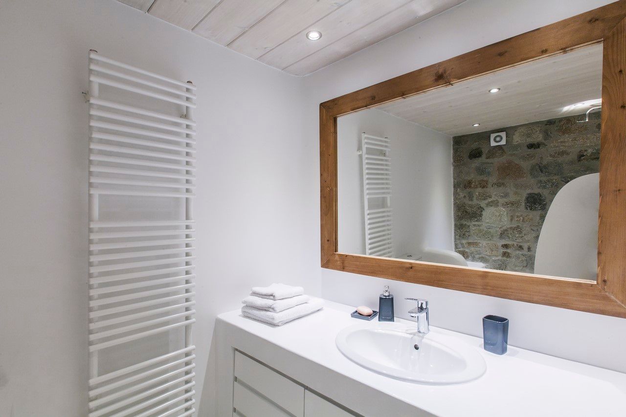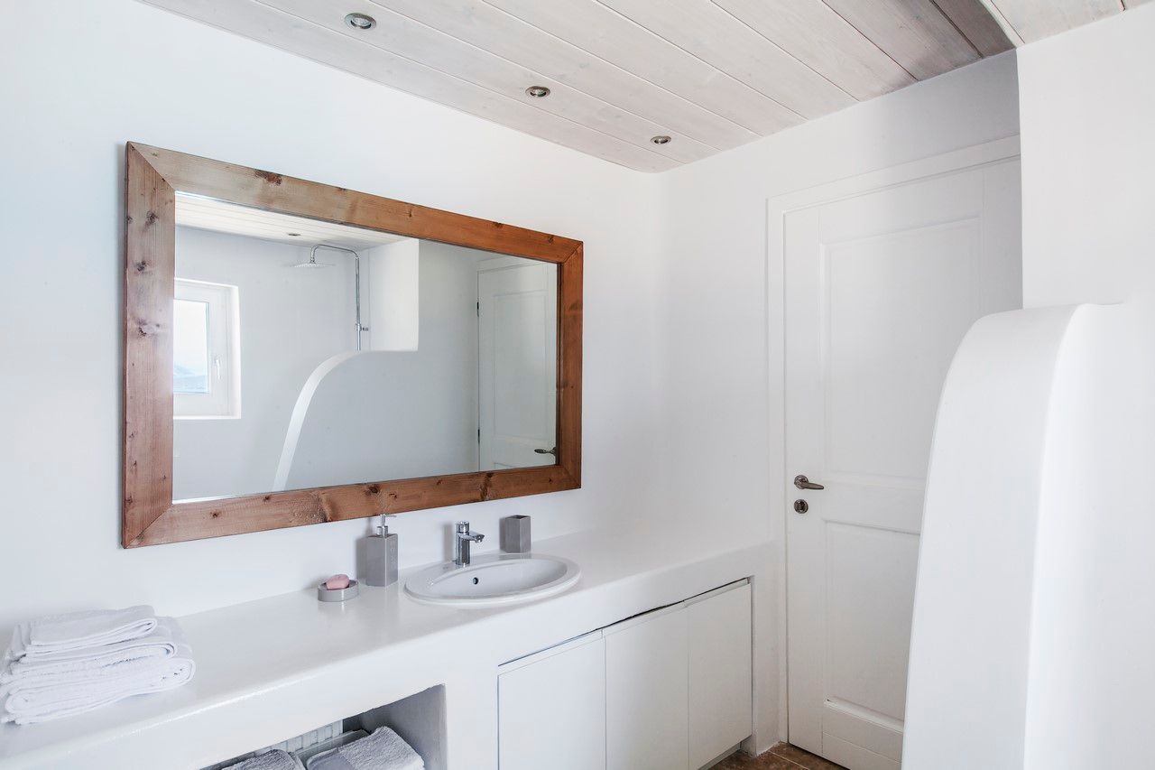 The elegant interiors, with meticulous attention to detail, blend harmoniously the Cycladic architecture with minimal aesthetics and modern art. All white-washed and generously sized with large picture windows, traditional wooden beams on the ceilings and sandy marbles on the floors, compose an impressive scenery. Even more the authentic paintings and sculptures determine the inviting atmosphere of the villa: Both calm and luxurious for you who are longing for a unique vacation home! The open plan living room around the fireplace, with white sofas and hand-made carpets is the first to start the inspiring composition. The nearby dining room and the fully equipped kitchen will undoubtedly attract you to spend time also indoors. As for the six bedrooms, all with en-suite bathrooms, they are suitable for sleeping in comfort and style, looking directly at the sea even when you are lying in bed. Decorated and furnished in earth light tones, each one differs from the others, tailored to meet the highest expectations.