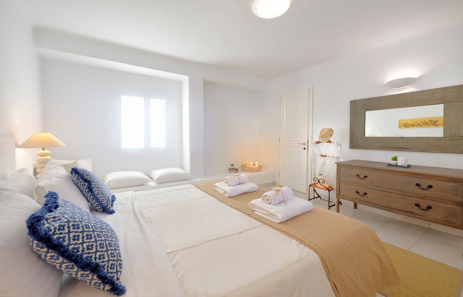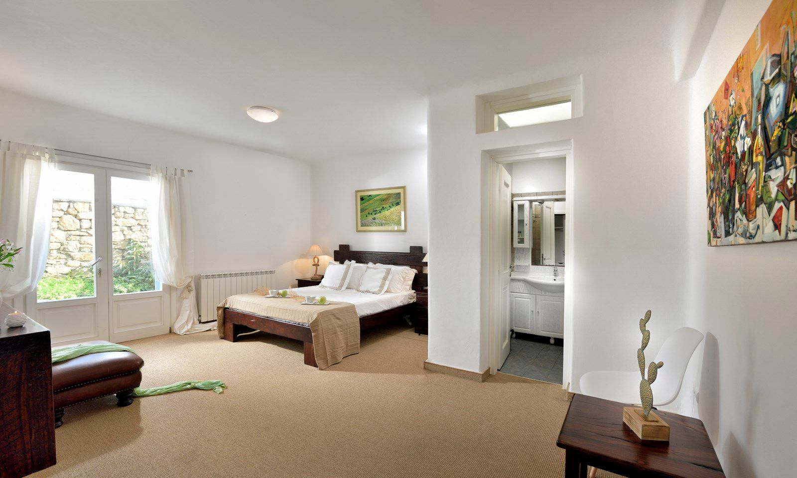 Tasteful furnishings and fabrics dress the villa in a simple yet elegant décor, rendering it relaxing on the eyes and the senses alike. The villa harbours 6 bedrooms and can accommodate up to 12 people, while providing all the amenities one could ever need. It’s the ideal villa for those who crave a getaway, but also desire proximity to the legendary Mykonian action as well as Mykonos airport. The world-renowned Super Paradise beach is but a 10-minute walk away, as are a series of lively bars and restaurants including: Super Paradise Club, Jackie’o, and Pinky Beach… within a 2-minute car ride.