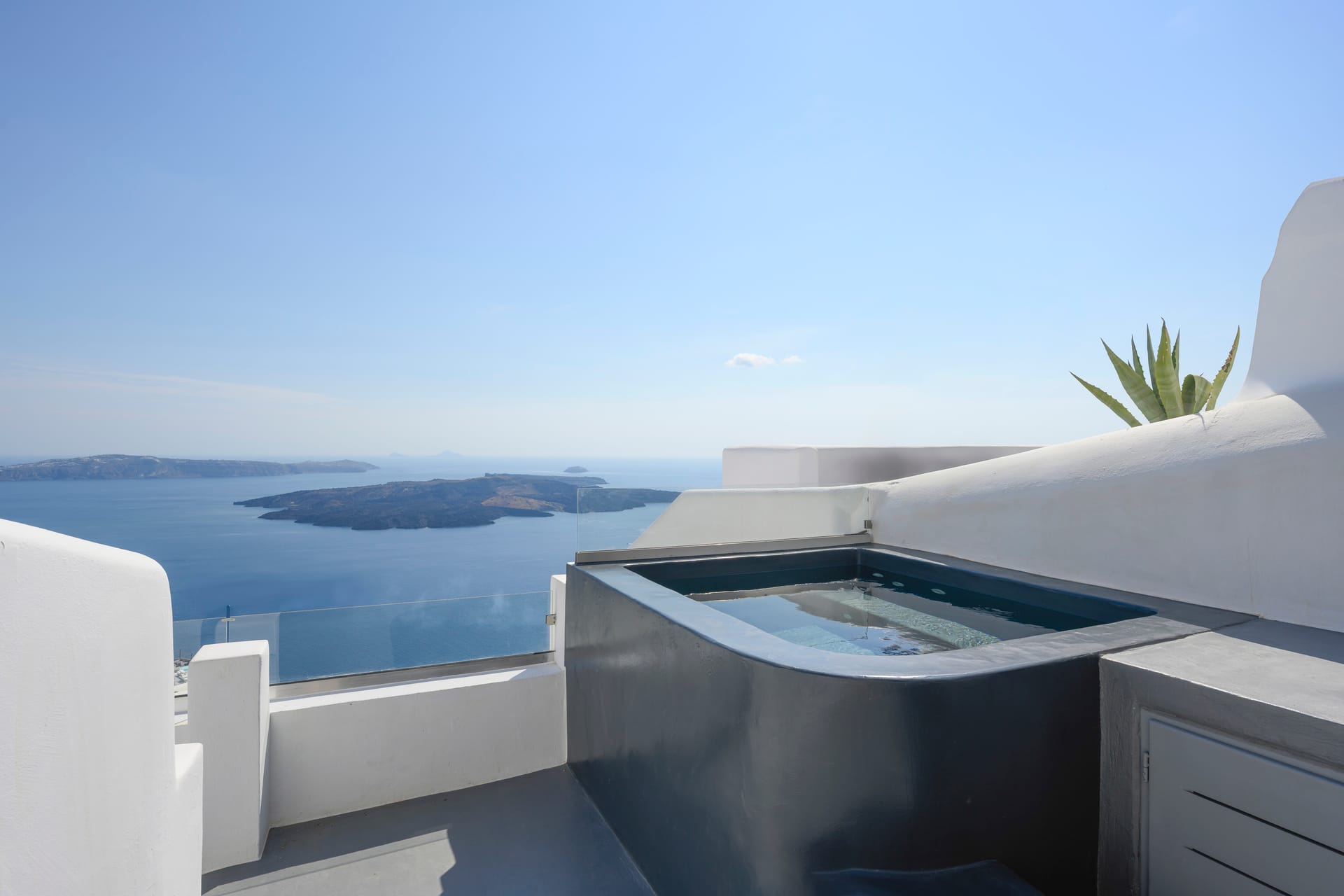 Facing the volcanic panorama and awe-inspiring sunset of Santorini, the outdoor terrace is adorned with a private jacuzzi accompanied by a dining area, crafting the perfect setting for cherished moments of serenity.