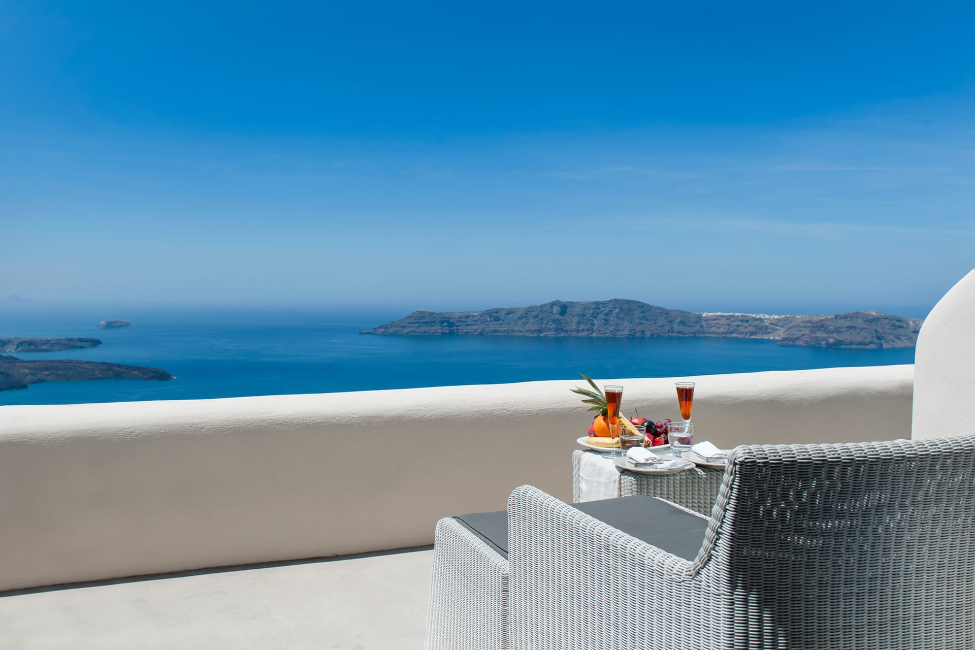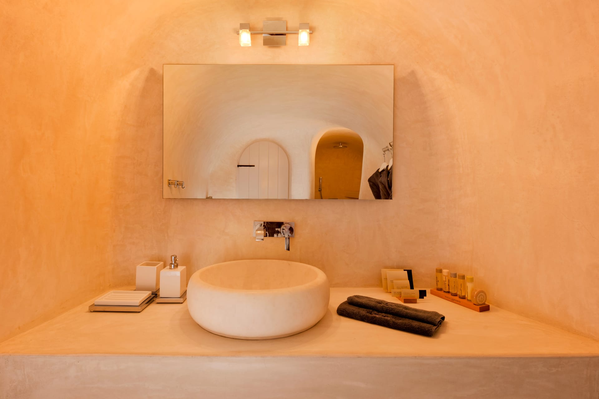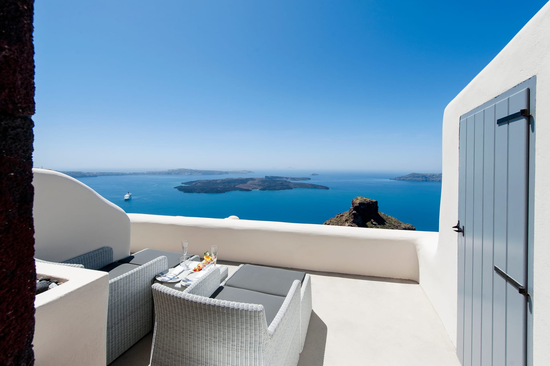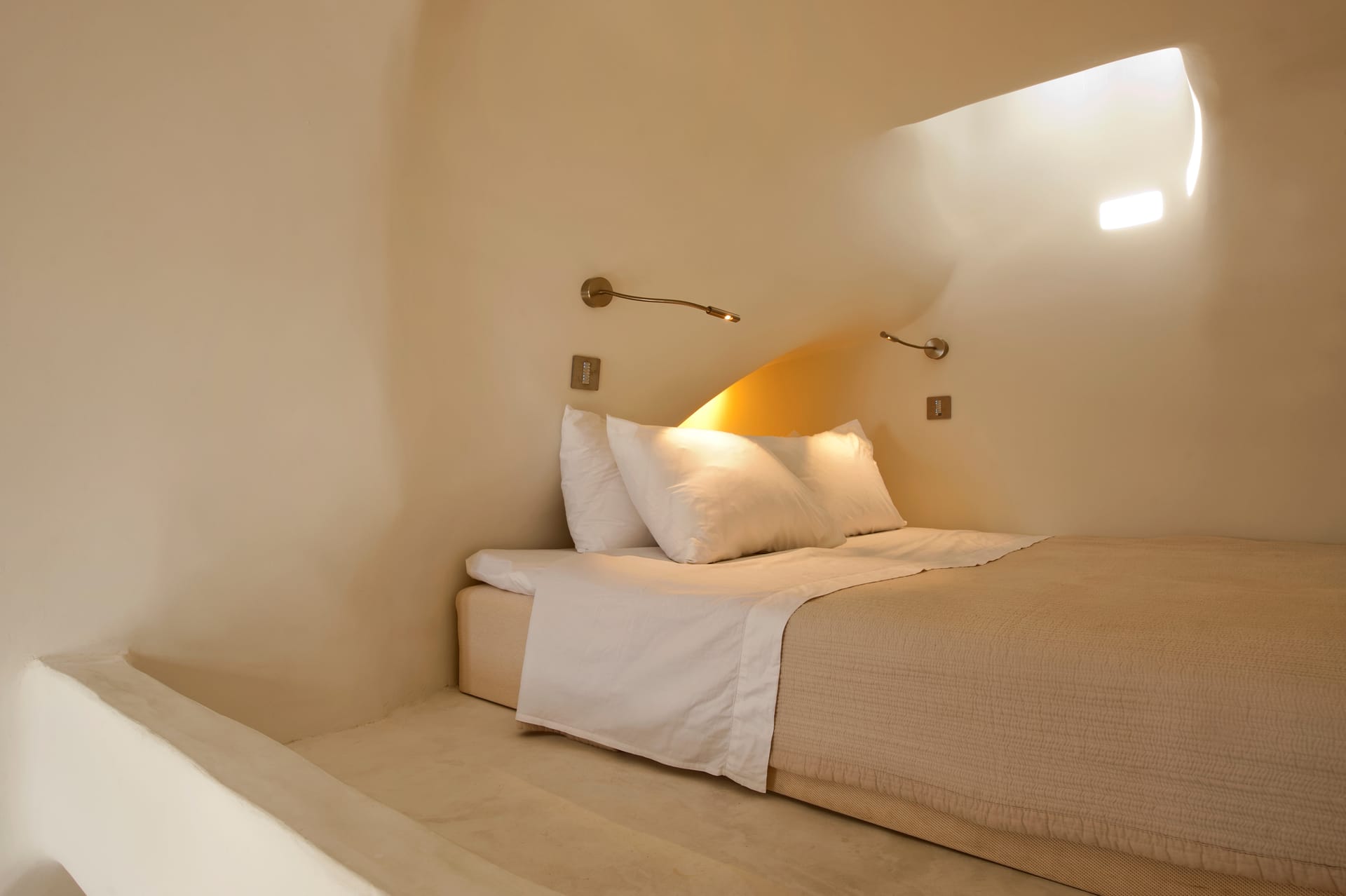 Those room type, offer exclusive views of the caldera from ots private balcony. It spans in two levels and can accommodate up to 3 guests. Neatly designed seating areas, built-in furniture and traditional Cycladic style fireplace emphasize the atmosphere of the Island. King size Duxiana beds, AMX smart home systems, 43'' TVs and a large, carefully designed bathroom with master crafted built-In shower, guarantee a truly relaxing experience.