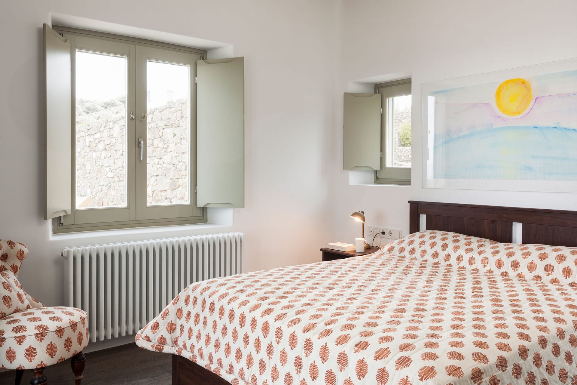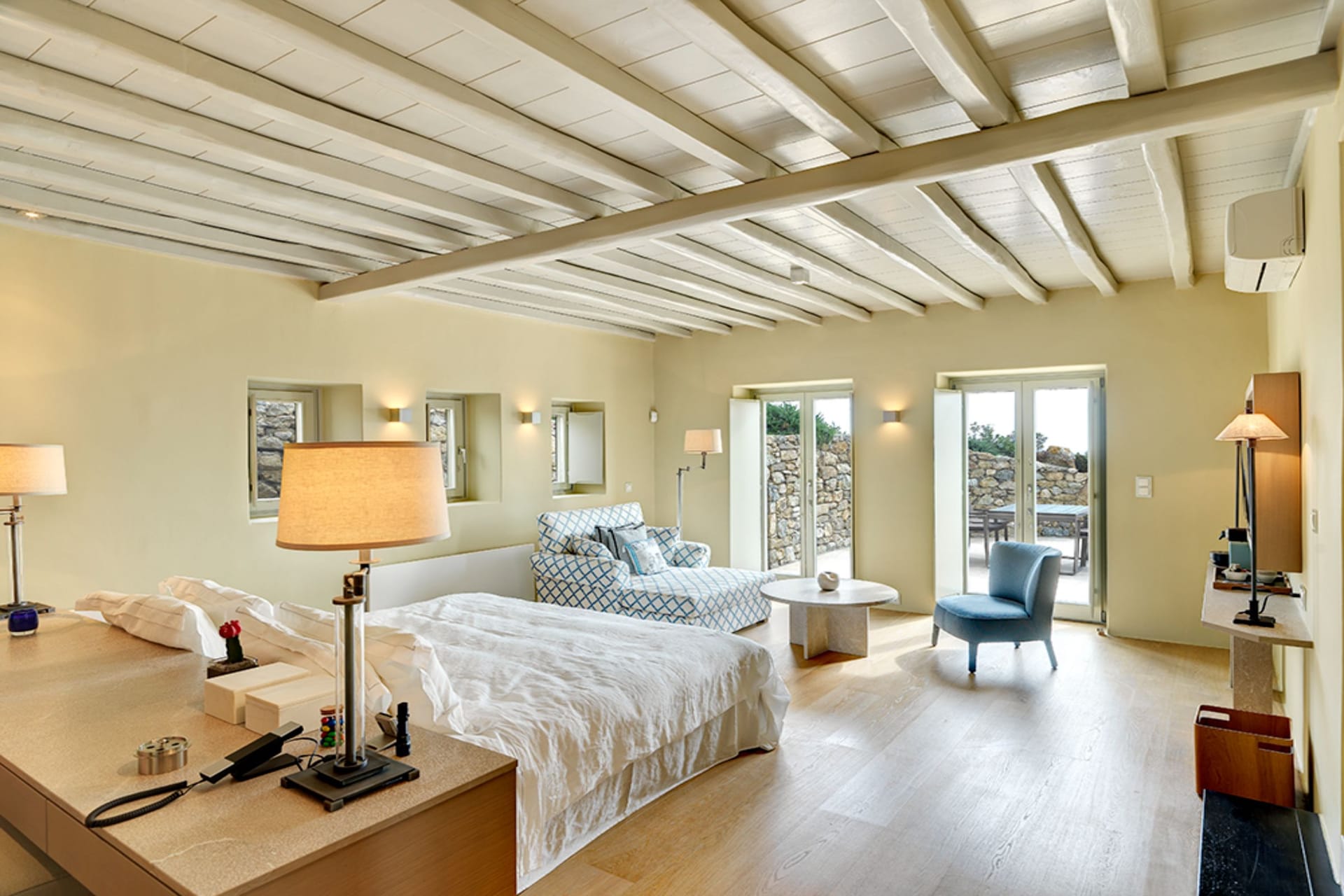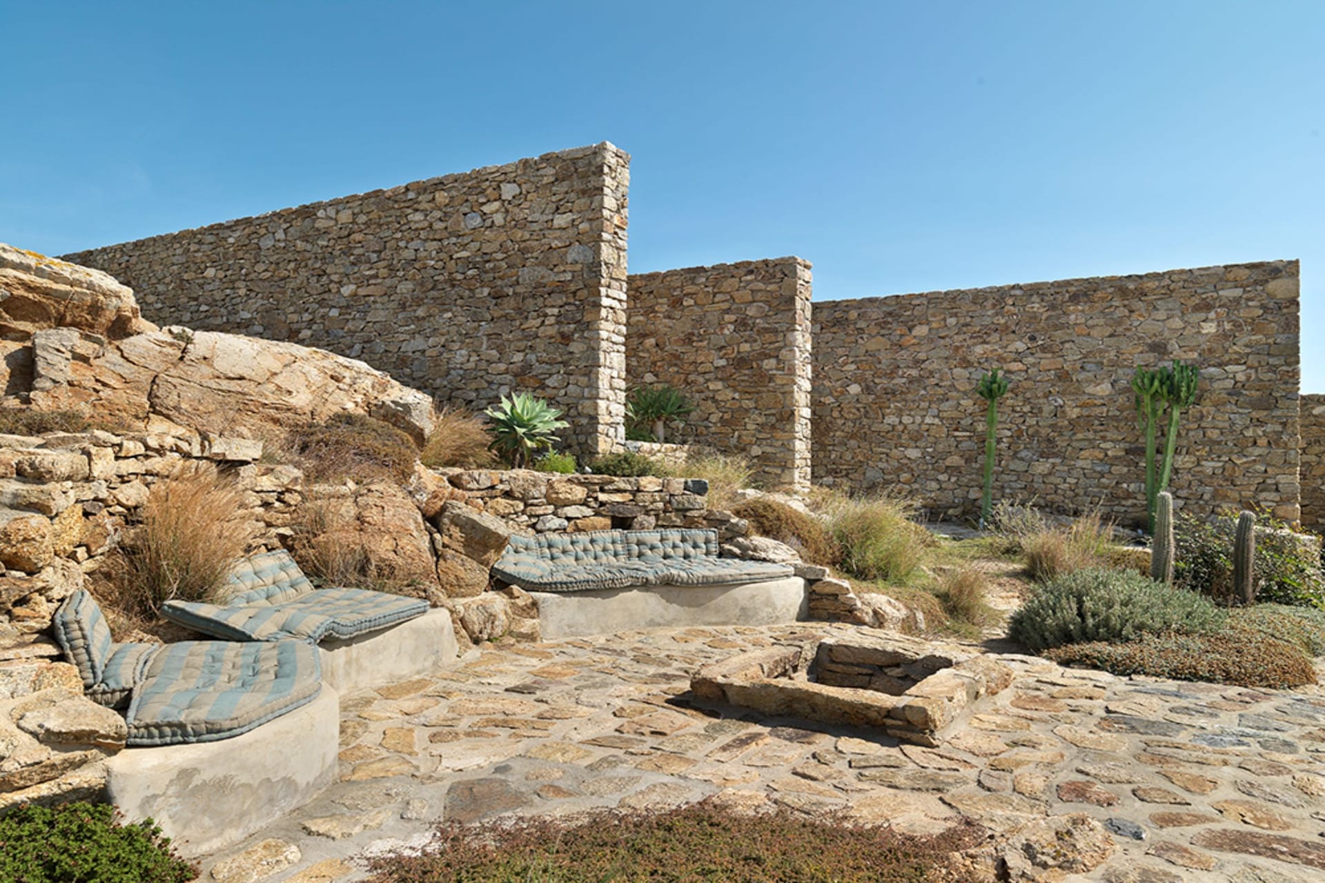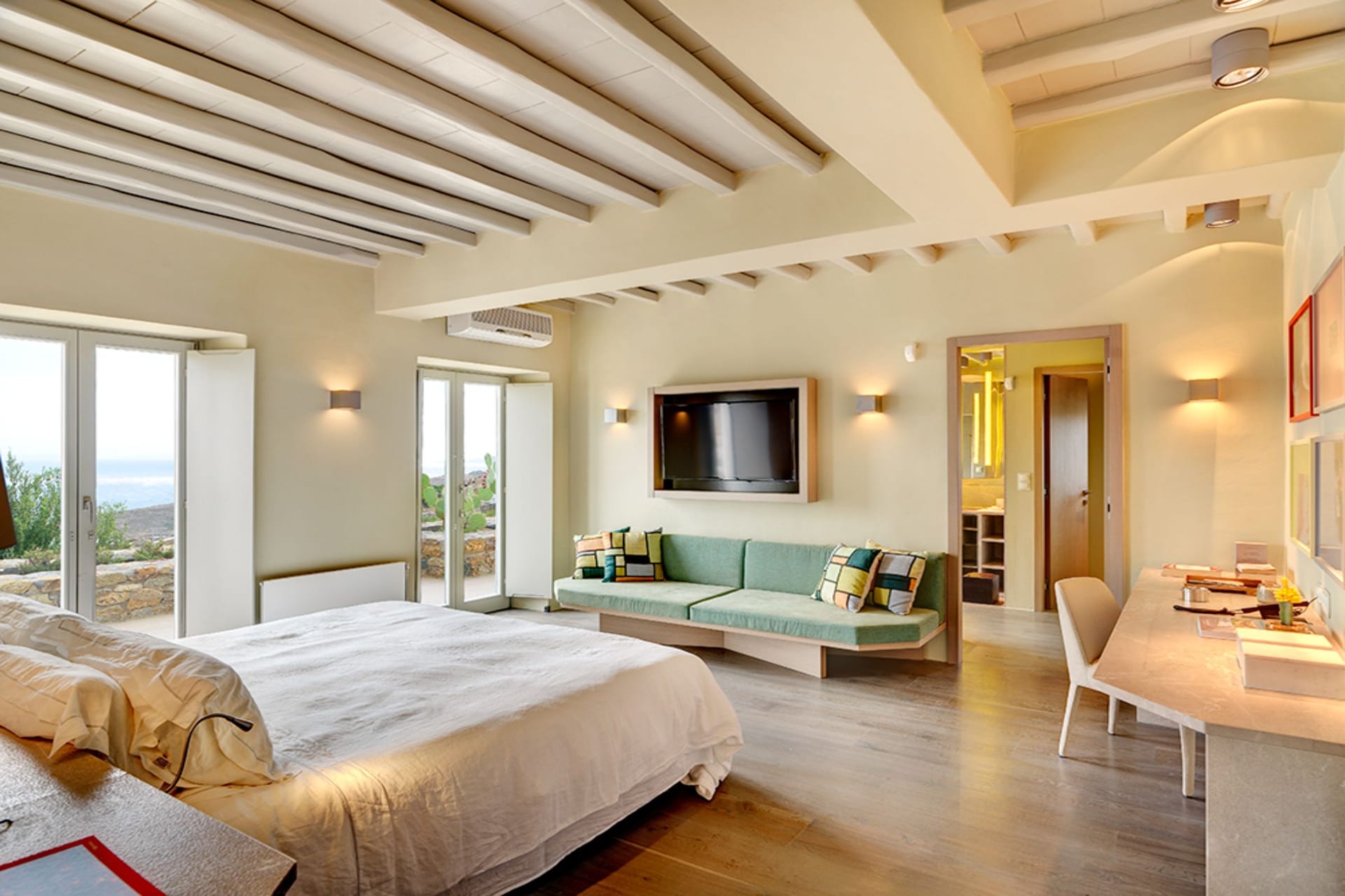 The interior is bright, with large windows allowing a great flow in the space. The bedrooms are spacious and airy, decorated minimally in natural tones to convey a sense of relaxation and comfort. The soothing relaxation pool and the large lounge areas with the make the villa to be the best place for your summer vacations and magical at night when its lighting plan transforms the rocks and cliffs into magical structures.