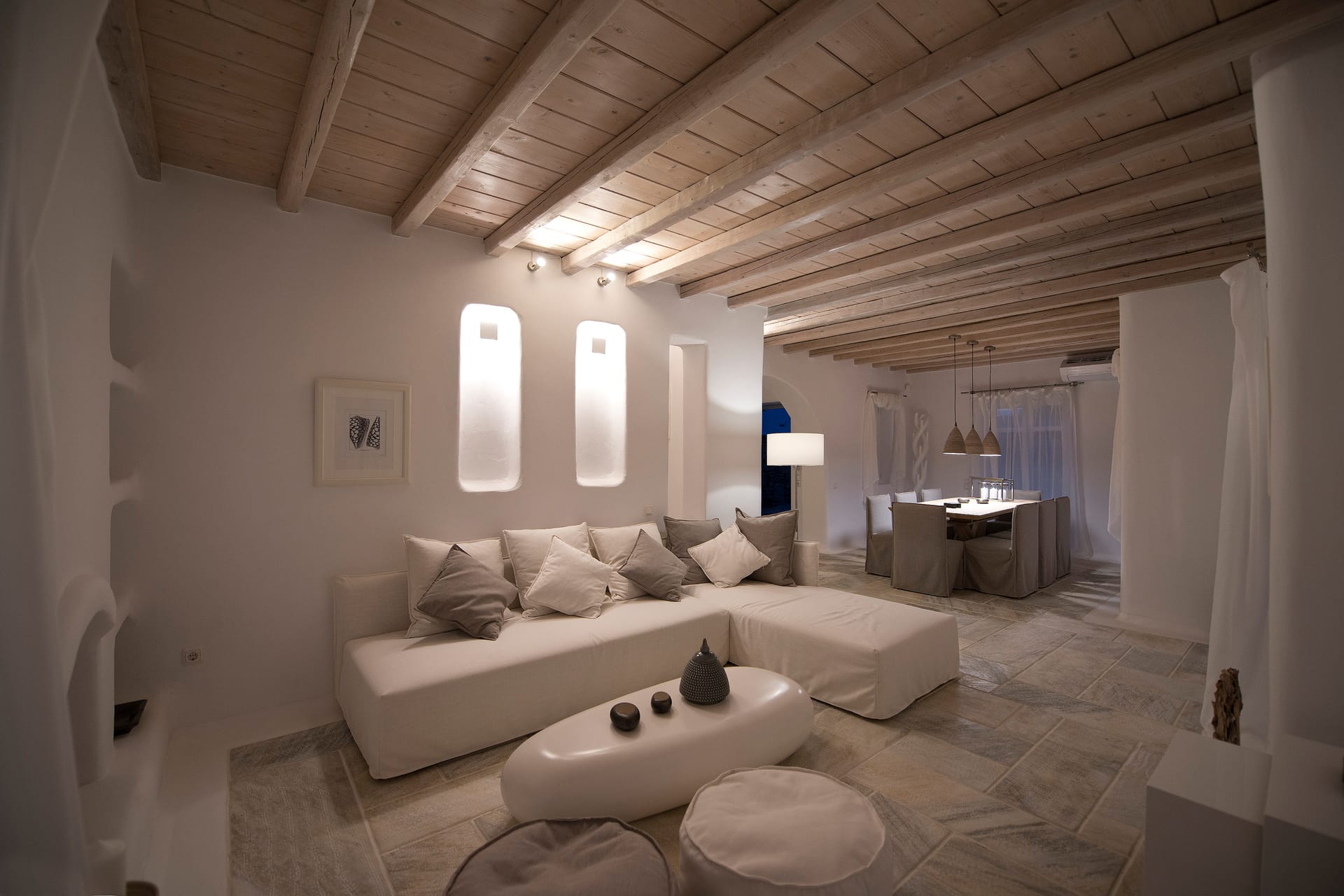 - Whitewashed Cycladic architecture with Mykonian interior design