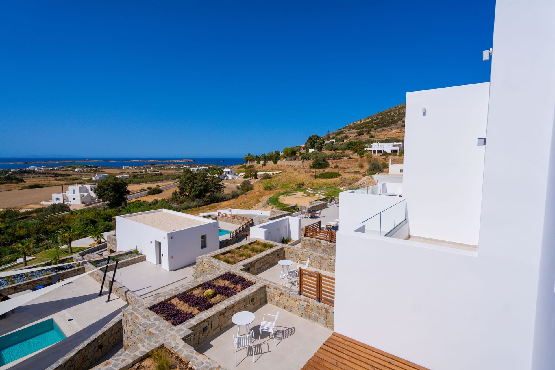 Combines a boho-chic aesthetic with exposed rock, earth tones and vast, floor-to-ceiling windows that blur the lines between indoor and outdoor spaces. The private outdoor space offers a large private pool and stunning sea views of the Aegean Sea and the surrounding landscape.
